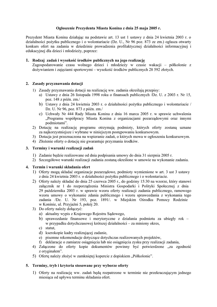 Ogłoszenie Prezydenta Miasta Konina z dnia 25 maja 2005 r. Prezydent Miasta Konina działając na podstawie art. 13 ust 1 ustawy z dnia 24 kwietnia 2003 r. o działalności pożytku publicznego i o wolontariacie (Dz. U., Nr 96 poz. 873 ze zm.) ogłasza otwarty konkurs ofert na zadania w dziedzinie prowadzenia profilaktycznej działalności informacyjnej i edukacyjnej dla dzieci i młodzieży, poprzez: 1. Rodzaj zadań i wysokość środków publicznych na jego realizację Zagospodarowanie czasu wolnego dzieci i młodzieży w czasie wakacji – półkolonie z dożywianiem i zajęciami sportowymi – wysokość środków publicznych 28 592 złotych. 2. Zasady przyznawania dotacji 1) Zasady przyznawania dotacji na realizację ww. zadania określają przepisy: a) Ustawy z dnia 26 listopada 1998 roku o finansach publicznych /Dz. U. z 2003 r. Nr 15, poz. 148 z późn. zm./ b) Ustawy z dnia 24 kwietnia 2003 r. o działalności pożytku publicznego i wolontariacie / Dz. U. Nr 96, poz. 873 z późn. zm./ c) Uchwały Nr 444 Rady Miasta Konina z dnia 16 marca 2005 r. w sprawie uchwalenia „Programu współpracy Miasta Konina z organizacjami pozarządowymi oraz innymi podmiotami”. 2) Dotację na realizację programu otrzymają podmioty, których oferty zostaną uznane za najkorzystniejsze i wybrane w niniejszym postępowaniu konkursowym. 3) Dotacja jest przeznaczona na wspieranie zadań, o których mowa w ogłoszeniu konkursowym. 4) Złożenie oferty o dotację nie gwarantuje przyznania środków. 3. Terminy i warunki realizacji zadań 1) Zadanie będzie realizowane od dnia podpisania umowy do dnia 31 sierpnia 2005 r. 2) Szczegółowe warunki realizacji zadania zostaną określone w umowie na wykonanie zadania. 4. Termin i warunki składania ofert 1) Oferty mogą składać organizacje pozarządowe, podmioty wymienione w art. 3 ust 3 ustawy z dnia 24 kwietnia 2003 r. o działalności pożytku publicznego i o wolontariacie. 2) Oferty należy składać do dnia 25 czerwca 2005 r., do godziny 15:30 na wzorze, który stanowi załącznik nr 1 do rozporządzenia Ministra Gospodarki i Polityki Społecznej z dnia 29 października 2003 r. w sprawie wzoru oferty realizacji zadania publicznego, ramowego wzoru umowy o wykonanie zdania publicznego i wzoru sprawozdania z wykonania tego zadania /Dz. U. Nr 193, poz. 1891/. w Miejskim Ośrodku Pomocy Rodzinie w Koninie, ul. Przyjaźni 5, pokój 20. 3) Do oferty należy dołączyć: a) aktualny wypis z Krajowego Rejestru Sądowego, b) sprawozdanie finansowe i merytoryczne z działania podmiotu za ubiegły rok – w przypadku dotychczasowej krótszej działalności – za miniony okres, c) statut, d) kserokopie kadry realizującej zadanie, e) pisemne rekomendacje dotyczące dotychczas realizowanych projektów, f) deklaracje o zamiarze osiągnięcia lub nie osiągnięcia zysku przy realizacji zadania, 4) Załączone do oferty kopie dokumentów powinny być potwierdzone „za zgodność z oryginałem”. 5) Ofertę należy złożyć w zamkniętej kopercie z dopiskiem „Półkolonie”. 5. Terminy, tryb i kryteria stosowane przy wyborze oferty 1) Oferty na realizację ww. zadań będą rozpatrzone w terminie nie przekraczającym jednego miesiąca od upływu terminu składania ofert. 2) Złożone oferty rozpatrywane są pod względem formalnym i merytorycznym przez Komisję Konkursową. Decyzję o wyborze ofert i udzieleniu dotacji podejmuje w formie zarządzenia Prezydent Miasta Konina. 3) O wynikach konkursu podmioty, które złożyły oferty w konkursie zostaną powiadomione pisemnie. 4) Komisja Konkursowa nie będzie rozpatrywała ofert: a) sporządzonych wadliwie, b) niekompletnych, c) złożonych na formularzu innym niż określony w ofercie, d) złożonych po terminie, e) nie dotyczących pod względem merytorycznym zadań ogłoszonych w konkursie, f) dotyczące zadania, które nie jest celami statutowymi podmiotu, 3) Kryteria stosowane przy wyborze oferty: a) zbieżność projektu z celami zadania, b) kalkulacja kosztów zadania pod względem celowości, oszczędności oraz efektywności wykonania, c) udział środków własnych (nie mniej niż 20 %), d) posiadana baza lokalowa i zasoby rzeczowe podmiotu, e) kompetencje i kwalifikacje osób zaangażowanych w projekt, f) prawidłowość i terminowość rozliczenia środków finansowych w ubiegłych latach, g) atrakcyjność form wypoczynku, h) co najmniej 10 dniowy program półkolonii, i) termin realizacji zadania w okresie wakacji letnich, 4) Oferta składana przez podmiot powinna zawierać: a) szczegółowy zakres rzeczowy proponowanego do realizacji zadania, zawierający opis planowanego działania, b) termin i miejsce realizacji zadania c) kalkulację przewidywanych kosztów realizacji zadania, d) informację o posiadanych zasobach rzeczowych i kadrowych zapewniających realizację zadania, e) informację o wysokości środków finansowych własnych albo pozyskanych z innych źródeł na realizację zadania, f) informację o wcześniejszej działalności podmiotu składającego ofertę w zakresie, którego dotyczy zadanie, 6. Zadania zrealizowane w roku poprzednim. Realizator Konińskie Towarzystwo „Trzeźwość” Towarzystwo Przyjaciół Dzieci Parafialny Oddział Akcji Katolickiej przy Parafii św. Wojciecha Towarzystwo Przyjaciół Dzieci Konińskie Towarzystwo „Trzeźwość” Zadanie 2004 r./zł Wspieranie w rozwoju psychofizycznym dzieci i młodzieży podczas pobytu na koloniach oraz półkoloniach. Półkolonie z programem profilaktycznym dla dzieci z rodzin z problemem alkoholowym -Świetlica Środowiskowa Wilków - przy Parafii NMP Królowej Półkolonie integracyjne z programem profilaktycznym. 13 000,00 Półkolonie dla dzieci z rodzin z programem profilaktycznym z rodzin z problemem alkoholowym, Konin – Klub „Hutnik” Lato w mieście – organizacja półkolonii z programem kształtowania postaw i przekonań prozdrowotnych wśród dzieci i młodzieży uczestników półkolonii 5 000,00