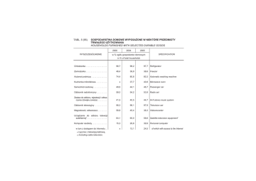 TABL. 5 (95). GOSPODARSTWA DOMOWE WYPOSA¯ONE W NIEKTÓRE PRZEDMIOTY TRWA£EGO U¯YTKOWANIA HOUSEHOLDS FURNISHED WITH SELECTED DURABLE GOODS 2000 WYSZCZEGÓLNIENIE 2004 2005 SPECIFICATION w % ogó³u gospodarstw domowych in % of total households Ch³odziarka . . . . . . . . . . . . . . . . . . 98,7 98,2 97,7 Refrigerator Zamra¿arka . . . . . . . . . . . . . . . . . . 48,4 39,9 38,6 Freezer Automat pralniczy . . . . . . . . . . . . . 74,4 80,8 80,3 Automatic washing machine Kuchenka mikrofalowa. . . . . . . . . . x 37,7 40,8 Microwave oven Samochód osobowy . . . . . . . . . . . 49,6 44,1 46,7 Passenger car Odbiornik radiofoniczny . . . . . . . . . 58,0 54,2 53,9 Radio set Zestaw do odbioru, rejestracji i odtwarzania dŸwiêku (wie¿a) . . . . . . . . 41,5 40,5 44,7 Hi-fi stereo music system Odbiornik telewizyjny . . . . . . . . . . 98,3 96,1 97,9 Television set Magnetowid, odtwarzacz . . . . . . . . 58,8 45,4 38,3 Videorecorder Urz¹dzenie do odbioru telewizji satelitarneja . . . . . . . . . . . . . . . . . 64,1 65,0 58,6 Satellite television equipmenta Komputer osobisty . . . . . . . . . . . . . 15,3 29,8 39,9 Personal computer w tym z dostêpem do Internetu. . x 13,1 24,5 a £¹cznie z telewizj¹ kablow¹. a Including cable television. of which with access to the Internet