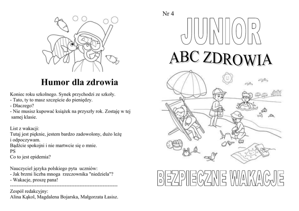 Nr 4 Humor dla zdrowia Koniec roku szkolnego. Synek przychodzi ze szkoły. - Tato, ty to masz szczęście do pieniędzy. - Dlaczego? - Nie musisz kupować książek na przyszły rok. Zostaję w tej samej klasie. List z wakacji: Tutaj jest pięknie, jestem bardzo zadowolony, dużo leżę i odpoczywam. Bądźcie spokojni i nie martwcie się o mnie. PS Co to jest epidemia? Nauczyciel języka polskiego pyta uczniów: - Jak brzmi liczba mnoga rzeczownika "niedziela"? - Wakacje, proszę pana! ----------------------------------------------------------------Zespól redakcyjny: Alina Kąkol, Magdalena Bojarska, Małgorzata Łasisz. Rozwiąż krzyżówkę. Z liter w zaznaczonych polach ułóż hasło i wpisz je w ramkę pod krzyżówką. 1. Stolica Polski. 2. Rechocze w stawie. 3. Gra się nią np. w siatkówkę. 4. We wrześniu rozpoczyna się..? 5. Gorące i świeci latem. 6. Smaczne w lesie. 7. Miesiąc rozpoczynający wakacje. 1. 1 2 2. 3 3. 4 4. 5 5. 6. 6 7 7. HASŁO: 1 2 3 4 5 6 7 WAKACYJNE RADY PAMIĘTAJ! W. Badalska GDY GROZI CI NIEBEZPIECZEŃSTWO, DZWOŃ: Głowa nie jest od parady służyć musi dalej. Dbaj więc o nią i osłaniaj kiedy słońce pali. Płynie w rzece woda chłodna, bystra, czysta, tylko przy dorosłych z kąpieli korzystaj. Jagody nieznane gdy zobaczysz w borze Nie zrywaj! Nie zjadaj! bo zatruć się możesz. Urządzamy grzybobranie jaka rada stąd wynika? Gdy jakiegoś grzyba nie znasz nie wkładaj go do koszyka. Biegać boso jest przyjemnie, ale ważna rada: - idąc na wycieczkę pieszą dobre buty wkładaj! Gdy w polu, w lesie, czy za domem wykopiesz przedmiot zardzewiały - nie dotykaj go! Daj znać dorosłym! Śmierć niosą groźne przedmioty! NUMER ALARMOWY DO WSZYSTKICH SŁUŻB RATUNKOWYCH