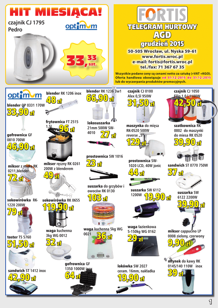 HIT MIESIĄCA! czajnik CJ 1795 Pedro TELEGRAM HURTOWY AGD grudzień 2015 50-505 Wrocław, ul. Nyska 59-61 www.fortis.wroc.pl e-mail: [email protected] tel./fax: 71 367 67 35 33,33 szt. Wszystkie podane ceny są cenami netto za sztukę (+VAT +KGO). Oferta handlowa obowiązuje od 01.12.2015 do 31.12.2015 lub do wyczerpania produktów promocyjnych. 48 zł blender OP 0331 170W 33,90 zł frytownica FT 2515 1,5l lokosuszarka 21mm 500W SW4010 96 zł gofrownica GF 0810 700W blender RK 1236 3w1 66,90 zł blender RK 1206 inox mikser z miską RK 0211,blender 72 zł 23 zł 119,90 zł waga kuchenna 3kg WG 0012 toster TS 5760 32 zł 51,50 zł sandwich ST 1412 inox 42,90 zł 103 zł sokowirówka RK 0655 gofrownica GF 1350 1000W inox 64 zł szatkownica RK 0002 do maszynki do miesa RK 0520 39,90 zł prostownica SW1020 LCD, 40W jonic ST 0770 750W sandwich 37 zł 44 zł waga kuchenna 5kg WG 0021 36 zł 42,50 zł 129 zł suszarka do grzybów i owoców RK 0130 sokowirówka RK1220 200W 79 zł 49 zł 31,50 zł prostownica SW 1016 mikser ręczny RK 0261 200W z blenderem czajnik CJ 1050 Filip 1,0 l 1100W maszynka do mięsa RK-0520 500W reverse „5” 27 zł 46,90 zł czajnik CJ 0100 Alex 0,5l 950W suszarka SW 6112 1200W 19,90 zł waga łazienkowa 5-150kg WG 0162 29 zł lokówka SW 2027 ceram. 16mm, nakładka 19,90 zł suszarka SW 6122 2200W 39,90 zł mikser cappucino LP 0008 zielony, czerwony 9,90 zł młynek do kawy RK 0145/140 110W inox 39 zł 1 blender GBH1000, 3w1, inox,reg.obot., 1000W czajnik GCS 100B,C,G,Z 2000W, 1,7l, strix, led 84 zł 139 zł nawilżacz ultra GNE 127N 2,7L, 260ml/h, 1520m2, 16h 97,50 zł ekspres do kawy 9725 prostownica 0617 42,50 zł 66 zł 71 zł 72 zł 51 zł blender RM 800 3 w 1 800W ,inox 103 zł żelazko 3242, 2200W,inox lokosuszarka WL 0811 65 54 zł mop z spryskiwaczem SM 30 prostownica- 58 zł młynek do soli, pieprzu PM 10 mech. młynek do soli, pieprzu PM 11 mech. 17,90 zł 17,90 zł radio RR 20 retro obudowa drewno 132 zł 2 radio RR 19 obudowa drewno, 230V 74 zł karbownica ZV 205 65W żelazko 3251, 2400W 69 zł młynek do soli+pieprz podwójny PM 12 mech 25,50 zł radio kieszon, budzik 3,5/230 T101 hot dog HM 02 79 zł żelazko ZE 108 2000W ceram, pom 42,60 zł 48 zł 49,90 zł radiobudzik RBD 609A 230V DUŻY WYŚWIETL. 59 zł 369zł 227 zł czajnik VK 3617 1,7 L mikser + blender SL 104 C szklany kremowy 300W zł czajnik VK 3217 1,7L wyciskarka wolnoobrotowa 400W GSJ 500S sokowirówka GSK800, 800W, LCD, Pulse, 16tys. obrot., 5 biegów garnek do gotowania, pasteryzacji ZH 27 sandwich toster ST 27l,1800W, termostat, 105A 750W,całe kanapki 30-1000C, timer, kranik 46 zł 269 zł wkład B 100-15 a1 wkład B 100-25 a1 owal Maxfor 5,60 zł 7,20 zł dzbanek Line 2,8L biały,1 wkład 19,90 zł 32,50 7HUP VWDO dzbanek 300 herbata, kawa pojemnik obiad TM 176 1,5L 2 częśc pojemnik obiad TM 205 2,0L 15,50 zł 12,50 zł 25,50 zł 28 zł kubek termiczny termos C 24 0,5l kubek termiczny C 10 0,4l żółty 41 zł dzbanek Time 2,5l nieb/ dzbanek Ideal 2,8l dzbanek Orion 2,8l wskaźnik, 3 wkłady wskaź wymiany wkładu biały, 1 wkład maxfor pomar, 1 wkład maxfor +herbatka ziołowa zł Stefanii Korżawskiej kubek termiczny C 06 44,90 zł 25,90 zł 34,20 zł czajnik CS 9 inox, 1,8l , 1500W czajnik C 450S 1,7l szkło, podświetlany, 2000W 49 zł lokosuszarka LS1M 400W 10,50 zł termos 40 turyst. 16,60 0,5 l17,50 0,75 l19,50 1 l28,80 0,25 l czajnik CS 15 2000W, 1,7l 44 zł 28,50 zł maszynka do strzyżenia mikser blender BL 50 ZMG 11 + trymer 45 zł prostownica ceram RW 13 N 35,50 zł 36 zł robot kuchenny R 100 blender 51 zł 81,50 zł 18,50 zł 27,90 zł robot kuchenny R 101 miska,blender 69,90 zł młynek żarnowy MK 150 młynek sól lub pieprz MP21 mech młynek s+p MP20 2w1 mech waga kuchenna WK 290 34 zł golarka G 46 akum 86 zł 74 zł pojemnik obiad TM 98 0,5L 14 zł dzbanek stalowy 2,5l herbata, kawa TMH-25 pojemnik obiad TM 155 1,5L 26,50 zł żelazko DA 29C Slide 2000W, ceram 52 zł 3 blender MSM 66110 600W, inox, ErgoMixx blender MSM 64010 450W, ErgoMixx żelazko TDA 2325 żelazko TDA 2610 1800W, ceram 2000W 78 zł 38 zł 105 zł czajnik TWK 7801 inox 1,7l + kawa Jacobs 107 zł żelazko TDA 1022000 105zł żelazko TDA 503011P 3000W 179 zł czajnik TWK 3A011 biały, 3A013 czarny, 3A014 czerwony, 3A017 krem 1,5l mikser ręczny MFQ 36400 450W 86 zł suszarka PHD 1100 żelazko TDA 2365 żelazko TDA 2630 ceram, strażak ASO 2200w, ceram 85 zł 86 zł mikser ręczny MFQ 3030, 350w 77 zł 107 zł 73 zł 98 zł blender MSM 6B700 76 zł prodiż PE3.600 1 grzałka+przewód 133 zł blender ZHB1006S 600W, pojemnik 85 zł maszynka do mięsa ZMM 1084S Diana 887.84 550W, 2,3kg, szatkow 179 zł sandwich toster ZSM 2001X 43 zł 4 czajnik CKE820 2200W, 1,7l, podś. włącz ZCK0274S 54 zł mikser z miską ZHM1206S00W, przecierak misa 3l 115 zł prostownica ZHS12260 40W, ceram 41 zł czajnik ZCK1272X 2400W, 1,7l, inox 79,90 zł mikser ZHM1204S 481.4 400W 69 zł suszarka ZHD08200 1200W, składana 25,50 zł golarka ZSH 12900 akum 77 zł mikser ZHM1205Ivo 481.5, 400W, blender, kubek 82 zł waga łazien.ZBS13000 150kg, slim 50,50 zł kuchenka mikrof. ZMW3000W poj.20L, 700W, grill 1000W, mech,biała 185 zł odkurzacz ZVC165YF Elf3 klasa energ A,worek 2,5l 142 zł żelazko ZIR08200 Sencillo 2000W, ceram 69,90 zł suszarka HTD 5595 2200W, ionic, dyfuzor 55 zł 57 zł maszynka do strzyżenia HSM 5597 lokosuszarka HAS 3019 550w mikser HM 3014 250W żelazko DB 3578 1700W waga kuchenna KW 3626 5kg, lcd 27 zł 34 zł 25 zł blender B05 400W, inox, trzepaczka, pojemnik plast. 0,6l + kawa 69 zł 114 zł 24 zł 42 zł mikser blender SM 3577 180W 36 zł blender B06 350W, inox 44 zł czajnik C 23 Ametyst 0,8l , 1000W , inox 49 zł golarka GM007 akumsiec, trymer, pod wode lokosuszarka HB550 3 końcówki, 500W lokosuszarka HB560 500W, 4 koncówki suszarka HD142 1400W, składana rączka toster sandwich S08 750W, inox toster T05 700W 49,90 zł 24,90 zł 28 zł 37 zł 31 zł 36 zł 109 zł suszarka HT 8004 CB,1200W san
