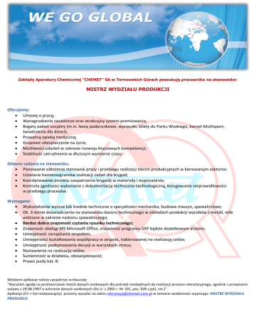 Zakłady Aparatury Chemicznej ’’CHEMET’’ SA w Tarnowskich Górach poszukują pracownika na stanowisko: MISTRZ WYDZIAŁU PRODUKCJI Oferujemy: Umowę o pracę; Wynagrodzenie zasadnicze oraz atrakcyjny system premiowania; Bogaty pakiet socjalny (m.in. bony podarunkowe, wycieczki, bilety do Parku Wodnego, karnet Multisport, świadczenia dla dzieci); Prywatną opiekę medyczną; Grupowe ubezpieczenie na życie; Możliwości szkoleń w zakresie rozwoju kluczowych kompetencji; Stabilność zatrudnienia w dłuższym wymiarze czasu. Główne zadania na stanowisku: Planowanie obłożenia stanowisk pracy i przebiegu realizacji zleceń produkcyjnych w kierowanym sektorze; Ustalanie harmonogramów realizacji zadań dla brygad; Koordynowanie procesu zaopatrzenia brygady w materiały i wyposażenie; Kontrola zgodności wykonania z dokumentacją techniczno-technologiczną, korygowanie nieprawidłowości w przebiegu procesów. Wymagane: Wykształcenie wyższe lub średnie techniczne o specjalności mechanika, budowa maszyn, spawalnictwo; Ok. 3-letnie doświadczenie na stanowisku dozoru technicznego w zakładach produkcji wyrobów z metali, mile widziane w zakresie nadzoru spawalniczego; Bardzo dobra znajomość czytania rysunku technicznego; Znajomość obsługi MS Microsoft Office, znajomość programu SAP będzie dodatkowym atutem; Umiejętność zarządzania zespołem; Umiejętności kształtowania współpracy w zespole, nakierowanej na realizację celów; Umiejętność podejmowania decyzji w warunkach stresu; Nastawienie na realizację celów; Sumienność w działaniu, obowiązkowość; Prawo jazdy kat. B. Składane aplikacje należy zaopatrzyć w klauzulę: "Wyrażam zgodę na przetwarzanie moich danych osobowych dla potrzeb niezbędnych do realizacji procesu rekrutacyjnego, zgodnie z przepisami ustawy z 29.08.1997 o ochronie danych osobowych (Dz.U. z 2002 r. Nr 101, poz. 926 z póź. zm.)” Aplikacje (CV + list motywacyjny) prosimy wysyłać na adres [email protected] w temacie wiadomości wypisując: MISTRZ WYDZIAŁU PRODUKCJI