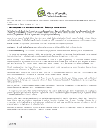 Źródło: http://old.mimowszystko.org/pl/aktualnosci/biezace/3001,Znamy-tegorocznych-laureatow-Medalu-Swietego-Brata-Albert a.html Wygenerowano: Środa, 8 marca 2017, 11:37 Znamy tegorocznych laureatów Medalu Świętego Brata Alberta W Krakowie odbyła się konferencja prasowa Fundacji Anny Dymnej „Mimo Wszystko” oraz Fundacji im. Brata Alberta, podczas której ogłoszono laureatów Medalu Świętego Brata Alberta za 2013 rok. Po raz pierwszy w historii przyznawania medali wyróżnienia otrzymały same kobiety. Anna Dymna, prezes Fundacji „Mimo Wszystko”, oraz ksiądz Tadeusz Isakowicz-Zaleski, prezes Fundacji im. Brata Alberta, ogłosili, że Kapituła Medalu Świętego Brata Alberta, zebrana w 97. rocznicę śmierci swojego patrona, wyróżnienia przyznała: Irenie Santor – za wspieranie i promowanie twórczości muzycznej osób niepełnosprawnych Agnieszce i Urszuli Radwańskim – za wspieranie i promowanie działalności Fundacji im. Brata Alberta Alinie Perzanowskiej – za działalność na rzecz osób autystycznych oraz za utworzenie „Farmy Życia” w Więckowicach. – Ten medal jest naprawdę magiczny. Gdyby nie on, to nigdy nie zrobiłabym tylu rzeczy. To właśnie dzięki niemu powstał festiwal „Albertiana” – mówiła Anna Dymna, laureatka Medalu Świętego Brata Alberta za 2000 rok. Medal Świętego Brata Alberta został ustanowiony w 1997 r. i jest przyznawany za niesienie pomocy osobom niepełnosprawnym. Jego laureatami są m.in.: ks. kardynał Franciszek Macharski, prof. Jerzy Buzek, prof. Zbigniew Brzeziński, prof. Andrzej Zoll, bp. Jan Chrapek, Robert Korzeniowski, Marek Kamiński, Otylia Jędrzejczak, Ewa Błaszczyk i Paweł Kukiz. Medal, przedstawiający św. Brata Alberta przytulającego dzieci, został zaprojektowany przez Krzysztofa Sieprawskiego, podopiecznego schroniska w Radwanowicach. Wręczenie medali odbędzie się 10 marca 2014 r. podczas 14. Ogólnopolskiego Festiwalu Twórczości Teatralno-Muzycznej Osób Niepełnosprawnych „Albertiana” w Teatrze im. Juliusza Słowackiego w Krakowie. „Albertiana”, której pomysłodawczynią jest Anna Dymna, to coroczne święto tych, którzy pracują nad spektaklami teatralnymi oraz doskonalą pasję muzyczne w Domach Opieki Społecznej, Warsztatach Terapii Zajęciowej oraz innych tego rodzaju placówkach. Podczas konferencji zaprezentowano również tegoroczny kalendarz Fundacji im. Brata Alberta ze zdjęciami Dam i Kawalerów Medalu Świętego Brata Alberta wraz z podopiecznymi Fundacji. – To wyjątkowy kalendarz, który stanowił formę terapii dla naszych podopiecznych. Osoby niepełnosprawne znajdują się poza marginesem społeczeństwa. Pojawienie się znanych osób na sesji zdjęciowej pozwoliło podopiecznym wyjść z tej izolacji – mówił ksiądz Tadeusz Isakowicz-Zaleski. Emocje, które towarzyszyły wszystkim podczas sesji zdjęciowych wspominali również Lidia Jazgar, członek Rady Fundacji im. Brata Alberta oraz pomysłodawcy kalendarza: Arkadiusz Tomasiak, Mirosław Mróz i Grzegorz Popabiak. Zdarzało się, że wyczekujący z niecierpliwością na sesję zdjęciową podopieczni nie spali całą noc. Efekty prac nad kalendarzem nie były znane artystom i podopiecznym do ostatniej chwili. Konferencję zamknęła prezentacja najnowszej książki księdza Tadeusza Isakowicza-Zaleskiego „Personalik subiektywny”, w której opisał m.in. osoby współpracujące z Fundacją im. Brata Alberta. Tweet Galeria Kalendarz Fundacji im. Brata Alberta Ksiądz Tadeusz Isakowicz-Zaleski i Krzysztof Sieprawski prezentują Medal Świętego Brata Alberta. fot.: archiwum Fundacji Anna Dymna, ksiądz Tadeusz Isakowicz-Zaleski, Arkadiusz Tomasiak, Mirosław Mróz i Grzegorz Popabiak, fot.: archiwum Fundacji