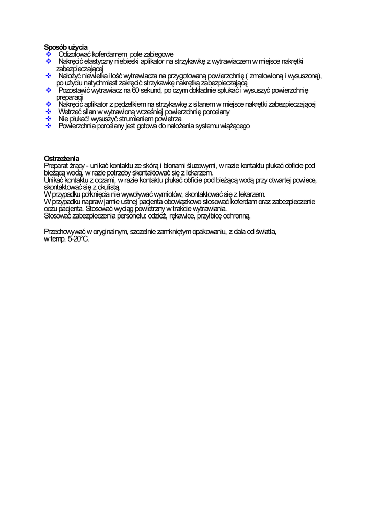 Sposób użycia Odizolować koferdamem pole zabiegowe Nakręcić elastyczny niebieski aplikator na strzykawkę z wytrawiaczem w miejsce nakrętki zabezpieczającej Nałożyć niewielka ilość wytrawiacza na przygotowaną powierzchnię ( zmatowioną i wysuszoną), po użyciu natychmiast zakręcić strzykawkę nakrętką zabezpieczającą Pozostawić wytrawiacz na 60 sekund, po czym dokładnie spłukać i wysuszyć powierzchnię preparacji Nakręcić aplikator z pędzelkiem na strzykawkę z silanem w miejsce nakrętki zabezpieczającej Wetrzeć silan w wytrawioną wcześniej powierzchnię porcelany Nie płukać! wysuszyć strumieniem powietrza Powierzchnia porcelany jest gotowa do nałożenia systemu wiążącego Ostrzeżenia Preparat żrący - unikać kontaktu ze skórą i błonami śluzowymi, w razie kontaktu płukać obficie pod bieżącą wodą, w razie potrzeby skontaktować się z lekarzem. Unikać kontaktu z oczami, w razie kontaktu płukać obficie pod bieżącą wodą przy otwartej powiece, skontaktować się z okulistą. W przypadku połknięcia nie wywoływać wymiotów, skontaktować się z lekarzem. W przypadku napraw jamie ustnej pacjenta obowiązkowo stosować koferdam oraz zabezpieczenie oczu pacjenta. Stosować wyciąg powietrzny w trakcie wytrawiania. Stosować zabezpieczenia personelu: odzież, rękawice, przyłbicę ochronną. Przechowywać w oryginalnym, szczelnie zamkniętym opakowaniu, z dala od światła, w temp. 5-20°C.