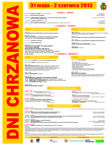 DNI CHRZANOWA 31 maja - 2 czerwca 2013 31 MAJA – PIĄTEK godz.16.00 „GDZIE JEST NEMO” 3D /film animowany/ Kino Sztuka /impreza biletowana/ godz.17.00 POJEDYNEK BIG BANDÓW Pasaż za MOKSiR godz.18.00 „CHRZANOWSKIE IMPRESJE XII” - Chrzanowski Rynek oczami artystów wernisaż wystawy poplenerowej Galeria “Na Styku” MOKSiR godz.18.30 „JEZIORO ŁABĘDZIE” 3D - balet Kino Sztuka /impreza biletowana/ godz.21.00 NOC FILMOWA ALMODOVARA - ( „Przelotni kochankowie”, „Skóra, w której żyję”) Kino Sztuka /impreza biletowana/ 1 CZERWCA – SOBOTA PLAC TYSIĄCLECIA RYNEK CHRZANOWSKI godz. 9.00 IV Rajd Motocyklowy CABAN 2013 o Puchar Burmistrza Chrzanowa godz. 11.00 DZIECI DZIECIOM - program w wykonaniu laureatów konkursów i przeglądów artystycznych oraz młodych artystów z MOKSiR godz. 12.00 POKAZY BALONOWE - gry i zabawy lotnicze hangarowe, prezentacja makiety samolotu Wilga 5, konkurs lotów modeli balonów, prezentacja symulatora lotów balonem,loty balonem na uwięzi dla dzieci godz. 15.00 Koncert zespołów wyróżnionych w Przeglądzie Kapel KLANG 2013 godz. 13.00 - Zumbatomic dla dzieci godz. 17.00 Koncert zdobywcy nagrody głównej Przeglądu Kapel KLANG 2013 godz. 17.00 - PARADA MOTOCYKLI godz. 18.30 LIBER & NATALIA SZROEDER - koncert godz. 18.15 EUROPEJSKI FESTIWAL IM. JANA KIEPURY godz. 20.30 - PRZYSTANEK CHRZANÓW BOGUSŁAW KACZYŃSKI i jego goście Orkiestra Obligato pod batutą Jerzego Sobeńko oraz artyści scen polskich Tadeusz Szenkier, Witold Malutki, Adam Szerszeń,Łukasz Gaj, Dorota Laskowiecka, Monika Węgiel 2 CZERWCA SKANGUR - koncert – NIEDZIELA PLAC TYSIĄCLECIA RYNEK CHRZANOWSKI godz. 12.30 - CAPOEIRA - prowadzenie Power Studio Chrzanów godz. 14.00 PORA SENIORA godz. 13.00 - SMERFY - przedstawienie dla dzieci godz. 14.30 PARADA ORKIESTR DĘTYCH - Orkiestra Garnizonowa Wojsk Lądowych w Krakowie,Orkiestra Policji Województwa Śląskiego w Katowicach, Orkiestra KWK „Piast”,Orkiestra Miejska w Trzebini, Młodzieżowa Orkiestra Dęta OSP Tenczyn,Orkiestra Dęta Miasta i Gminy Świątniki Górne, Orkiestra Dęta Zakładu Górniczego Janina w Libiążu - Chór Męski Żaby - Zespół Folklorystyczny Bolęcanie - Zespół Folklorystyczno-Teatralny Karniowianie - Zespół Wokalno-Instrumentalny Zorza - Zespół Chóralny Wrzos - Zespół Pogodna Jesień - Chrzanowskie Stowarzyszenie Folklorystyczne Luszowianki, Płazianki, Pogorzycanki, Balinianki godz. 17.00 godz. 18.00 GDYBYM BYŁ BOGATY JULA Z ZESPOŁEM - koncert Koncert Franciszka Makucha oraz artystów scen krakowskich (Bożena Zawiślak, Wojciech Habela,Paweł Bieńkowski i inni) godz. 18.30 CHRZANOWSKIE GWIAZDY SZKLANEGO EKRANU 18.30 - PAWEŁ PAPROCKI /laureat Mam Talent 2010/ - koncert 19.00 - ADA SZULC Z ZESPOŁEM /laureatka X Faktor 2012/-koncert 21.00 - SZTYWNY PAL AZJI-koncert godz. 22.30 POKAZ SZTUCZNYCH OGNI IMPREZY TOWARZYSZĄCE 1 czerwca - Sobota 29 maja - środa godz.10.00 i 12.00 godz.13.00 Baśniowa historia - spektakl baletowy Sala teatralna MOKSiR /impreza biletowana/ 31 maja - piątek godz.8.00 14.00 XIII Ogólnopolska Wiosna Szachowa Miejska Biblioteka Publiczna, ul.Broniewskiego 10 c 1 czerwca - sobota godz.11.30 III Chrzanowski Maraton Czytania Dzieciom - uroczyste rozpoczęcie w ramach XII Ogólnopolskiego Tygodnia Czytania Dzieciom, gość specjalny - Hanna Bieluszko Plac Tysiąclecia W stronę Słońca 3D - wystawa fotografii trójwymiarowej Pasaż za MOKSiR i sala nr 21 godz.17.30 „Historie chrzanowskich Mikołajów” - rozstrzygnięcie konkursu literackiego Galeria “Na Styku” MOKSiR 1 - 2 czerwca - sobota, niedziela godz.10.00 - 14.00 DNI OTWARTE Wyższej Szkoły Przedsiębiorczości i Marketingu w Chrzanowie ul.J.Woynarowskiej 1 IMPREZY SPORTOWE 26 maja - niedziela godz.9.00 - 12.10 IX Rajd Rowerowy z okazji Dnia Dziecka Start i meta - parking przy boiskach sportowych ZS Nr 1 w Chrzanowie 31 maja - piątek godz. 9.00 Ogólnopolski Turniej Mini-siatkówki z okazji Dnia Dziecka godz. 14.00 Pierwsza Chrzanowska Olimpiada Przedszkolaków Boiska, ul.Wyszyńskiego Hala Sportowa MOKSiR 1 czerwca - sobota godz.9.00 - 16.00 VIII Klubowe Mistrzostwa Chrzanowskiego Klubu Karate o Puchar Burmistrza Miasta Chrzanowa godz.10.00 Otwarte Mistrzostwa Chrzanowa w Siatkówce Plażowej Kobiet Hala Sportowa MOKSiR Boiska, ul.Wyszyńskiego 2 czerwca - Niedziela godz.8.00 Zawody sportowe z okazji Dnia Dziecka godz.9.00 XXIX Bieg Cabanów godz.9.00 OGÓLNOPOLSKI TURNIEJ TAŃCA TOWARZYSKIEGO o Puchar Burmistrza Miasta Chrzanowa Stawy Groble Ośrodek Rekreacyjny Basen Kąty Hala Sportowa MOKSiR 8 czerwca - sobota godz.9.00 KARATE DLA SERCA - XI Europa Karate Cup Club „Ronin Cup” Hala Sportowa MOKSiR Partnerzy: Miejska Biblioteka Publiczna w Chrzanowie,Foto Studio Jacek Gniewek, JackBand KCH Motocykle,PMOS Chrzanów,K.S."Orły" Chrzanów,Stowarzyszenie „Przyjaźni Miastu”,Szkoła Tańca „WIR”,UKS przy Szkole Podstawowej nr 8 w Chrzanowie, Przedszkole Samorządowe nr 7 w Chrzanowie,Przedszkole Samorządowe nr 4 w Chrzanowie,Przedszkole Samorządowe nr 10 z Oddziałami Integracyjnymi w Chrzanowie,Przedszkole Samorządowe nr 13 w Balinie,Przedszkole Samorządowe nr 9 w Chrzanowie,Szkoła Tańca Marty Kremer,Zespół Szkół nr 1 z Oddziałami Integracyjnymi w Chrzanowie,Zespół Szkół nr 2 w Chrzanowie,Zespół Szkół nr 3 w Chrzanowie,Zespół Szkół w Płazie,Szkoła Podstawowa nr 1 z Oddziałami Integracyjnymi w Chrzanowie,Publiczne Gimnazjum nr 1 im. Ks. Józefa Tischnera w Chrzanowie,Szkoła Podstawowa w Luszowicach,Chrzanowska Szkoła AIKIDO,Power Studio,TAURON Dystrybucja S.A., Szkoła Podstawowa Nr 5 w Chrzanowie UWAGA! Podczas Dni Chrzanowa dla zapewnienia bezpieczeństwa uczestnikom nastąpi zmiana organizacji ruchu - zamknięta zostanie część ul. Broniewskiego - od ul. Garncarskiej do skrzyżowania z ul.Kusocińskiego oraz część ul. Kusocińskiego od skrzyżowania z ul. Bagnistą do skrzyżowania z ul. Sienkiewicza. Przepraszamy mieszkańców za ucią