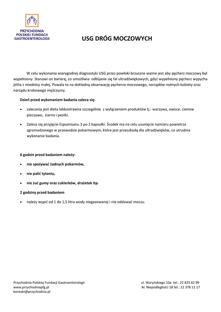USG DRÓG MOCZOWYCH W celu wykonania wiarygodnej diagnostyki USG przez powłoki brzuszne ważne jest aby pęcherz moczowy był wypełniony. Stanowi on barierę, co umożliwia odbijanie się fal ultradźwiękowych, gdyż wypełniony pęcherz wypycha jelita z miednicy małej. Powala to na dokładną obserwację pęcherza moczowego, narządów rodnych kobiety oraz narządu krokowego mężczyzny. Dzień przed wykonaniem badania zaleca się: zalecania jest dieta lekkostrawna szczególnie z wyłączeniem produktów tj.: warzywa, owoce, ciemne pieczywo, ziarna i pestki. Zaleca się przyjęcie Espumisanu 3 po 2 kapsułki. Środek ma na celu usunięcie namiaru powietrza zgromadzonego w przewodzie pokarmowym, które jest przeszkodą dla ultradźwięków, co utrudnia wykonanie badania. 6 godzin przed badaniem należy: nie spożywać żadnych pokarmów, nie palić tytoniu, nie żuć gumy oraz cukierków, drażetek itp. 2 godziny przed badaniem należy wypić od 1 do 1,5 litra wody niegazowanej i nie oddawać moczu. Przychodnia Polskiej Fundacji Gastroenterologii www.przychodniapfg.pl [email protected] ul. Waryńskiego 10a tel.: 22 825 62 99 Al. Niepodległości 18 tel.: 22 378 11 17
