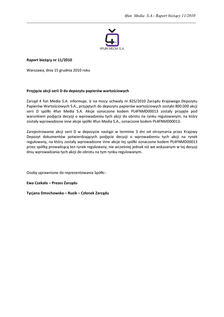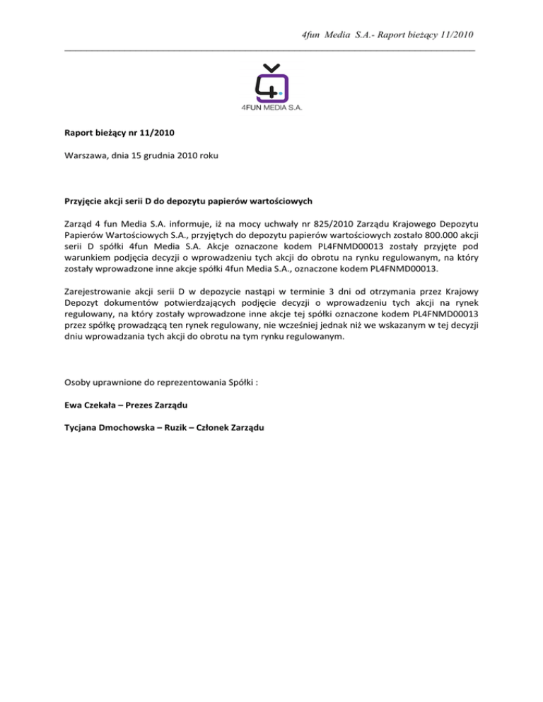 4fun Media S.A.- Raport bieżący 11/2010 ___________________________________________________________________________ Raport bieżący nr 11/2010 Warszawa, dnia 15 grudnia 2010 roku Przyjęcie akcji serii D do depozytu papierów wartościowych Zarząd 4 fun Media S.A. informuje, iż na mocy uchwały nr 825/2010 Zarządu Krajowego Depozytu Papierów Wartościowych S.A., przyjętych do depozytu papierów wartościowych zostało 800.000 akcji serii D spółki 4fun Media S.A. Akcje oznaczone kodem PL4FNMD00013 zostały przyjęte pod warunkiem podjęcia decyzji o wprowadzeniu tych akcji do obrotu na rynku regulowanym, na który zostały wprowadzone inne akcje spółki 4fun Media S.A., oznaczone kodem PL4FNMD00013. Zarejestrowanie akcji serii D w depozycie nastąpi w terminie 3 dni od otrzymania przez Krajowy Depozyt dokumentów potwierdzających podjęcie decyzji o wprowadzeniu tych akcji na rynek regulowany, na który zostały wprowadzone inne akcje tej spółki oznaczone kodem PL4FNMD00013 przez spółkę prowadzącą ten rynek regulowany, nie wcześniej jednak niż we wskazanym w tej decyzji dniu wprowadzania tych akcji do obrotu na tym rynku regulowanym. Osoby uprawnione do reprezentowania Spółki : Ewa Czekała – Prezes Zarządu Tycjana Dmochowska – Ruzik – Członek Zarządu