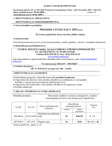 KARTA CHARAKTERYSTYKI (wg Rozporządzenia WE nr 1907/2006 Parlamentu Europejskiego i Rady z dnia 18 grudnia 2006 r REACH) Data wydania karty: 05.09.2008 r Aktualizacja karty:10.06.2009 r strona 1/5 1. IDENTYFIKACJA MIESZANINY, IDENTYFIKACJA PRZEDSIĘBIORSTWA, ● Nazwa handlowa produktu: PROSZEK CZYSZCZĄCY IZO jawox (Cytryna, grapefruit, bryza morska, jabłko–mięta) ● Zastosowanie: Proszek przeznaczony jest do czyszczenia porcelany, emalii, garnków, zlewów i urządzeń sanitarnych ● Identyfikacja przedsiębiorstwa: GLOBAL POLLENA Spółka Akcyjna FABRYKA CHEMII GOSPODARCZEJ UL. KUZIENNICZA 15, 59-400 JAWOR Telefon (076) 870-30-31; Fax: (076) 870-32-63 www.global-pollena.pl Osoba odpowiedzialna za opracowanie karty charakterystyki: Urszula Sobczyk, e-mail: [email protected] Nr statystyczny REGON - 390339667 ● Telefon alarmowy: +48 76 870-30-31 (czynny od 7.00 – 16.00 ) 2.IDENTYFIKACJA ZAGROŻEŃ ● Klasyfikacja preparatu: sklasyfikowano jako produkt bezpieczny ● Zagrożenie dla zdrowia: może działać szkodliwie po połknięciu a w przypadku kontaktu z oczami może powodować podrażnienie oczu. ● Zagrożenie dla środowiska: może działać szkodliwie na organizmy wodne ● Produkt alkaliczny 3. SKŁAD / INFORMACJA O SKŁADNIKACH Składniki produktu: Nr WE 246-680-4 207-838-8 Nr CAS Mieszanina środków ściernych, detergentów, środków wspomagających mycie oraz kompozycji zapachowej. Klasyfikacja niebezpieczeństwa Nazwa niebezpiecznej substancji Alkilobenzenosulfonian 25155-30-0 sodu 497-19-8 Węglan sodu Treść zwrotów R – patrz p. 16 1 symbol rodzaj zagrożenia Xi R36/38 Xi R36 Stężenie [%] C<5 10 ≤ C < 20 KARTA CHARAKTERYSTYKI Nazwa handlowa produktu: PROSZEK CZYSZCZĄCY IZO jawox strona 2/5 4. PIERWSZA POMOC Kontakt z oczami: dokładnie przemyć dużą ilością chłodnej i czystej wody przy odwiniętych powiekach przez co najmniej 15 minut. Unikać silnego strumienia wody, który może stworzyć ryzyko uszkodzenia rogówki. Nie używać żadnych maści oraz płynów do przemywania oczu. Natychmiast skontaktować się z lekarzem okulistą Wdychanie pyłów: w przypadku utrudnionego oddychania wyprowadzić poszkodowanego na świeże powietrze. W razie potrzeby skontaktować się z lekarzem. Kontakt ze skórą: skórę dokładnie zmyć dużą ilością wody. Spożycie: przepłukać usta, nie podawać nic do picia, nie wywoływać wymiotów. Natychmiast skontaktować się z lekarzem. 5. POSTĘPOWANIE W PRZYPADKU POŻARU - produkt niepalny - stosować środki gaśnicze odpowiednie dla palących się materiałów 6. POSTĘPOWANIE W PRZYPADKU NIEZAMIERZONEGO UWOLNIENIA DO ŚRODOWISKA Indywidualne środki ostrożności – unikać bezpośredniego kontaktu z oczami, nie wdychać pyłu. Stosować odzież ochronną, okulary , rękawice oraz aparat izolujący drogi oddechowe. Środki ostrożności w zakresie ochrony środowiska - produkt alkaliczny, unikać wprowadzania produktu do wód powierzchniowych i gruntowych oraz do gleby. Sposób oczyszczania - w przypadku uszkodzeń opakowań jednostkowych lub rozsypania zebrać ręcznie lub mechanicznie do wcześniej przygotowanych pojemników i w zależności od stopnia zanieczyszczenia wykorzystać gospodarczo lub przekazać do utylizacji. Do oczyszczania (usuwania) małych ilości można zastosować odkurzacz 7. POSTĘPOWANIE Z PREPARATEM I JEGO MAGAZYNOWANIE Wskazówki bezpiecznego stosowania produktu Magazynowanie Opakowanie jednostkowe stosować zgodnie z przeznaczeniem i sposobem użycia, przy właściwym stosowaniu nie wymaga się szczególnych środków ostrożności (unikać wdychania pyłu) - składować w pomieszczeniach krytych, suchych o wilgotności względnej powietrza nie wyższej niż 70% w temperaturze od 50C ÷ 35°C pudełko z tworzywa zamknięte wieczkiem 2 sztucznego szczelnie KARTA CHARAKTERYSTYKI Nazwa handlowa produktu: PROSZEK CZYSZCZĄACY IZO jawox strona 3/5 8. KONTROLA NARAŻENIA I ŚRODKI OCHRONY INDYWIDUALNEJ Parametry kontroli narażenia: NDSCH – nieokreślone NDSP – nieokreślone NDS – dla pyłów o zawartości powyżej 50% wolnej krystalicznej krzemionki – 2 mg/m³ NDS - dla pyłów o zawartości poniżej 50% wolnej krystalicznej krzemionki – 4 mg/m³ Metody oceny narażenia: PN-91/Z-04030/05 oznaczenie pyłu całkowitego na stanowiskach pracy metodą filtracyjno-wagową. PN-89/Z-040008/07 zasady pobierania próbek i powietrza w środowisku pracy i interpretacja wyników Środki ochrony indywidualnej w czasie użytkowania wyrobu: - nie są konieczne Środki ochrony indywidualnej przy produkcji produktu: - ogólne środki ostrożności - ochrona dróg oddechowych - ochrona oczu - ochrona skóry - ochrona skóry - sprzęt filtrujący (wentylacja miejscowa) - maska przeciwpyłowa - okulary ochronne - rękawice ochronne - odzież robocza 9. WŁAŚCIWOŚCI FIZYCZNE I CHEMICZNE Wygląd - ciało stałe (proszek) o barwie białej do szarej z kolorowymi wtrąceniami Zapach - charakterystyczny dla użytych surowców i kompozycji zapachowych pH 1% r-ru wodnego – 10 ÷ 11 temperatura: wrzenia – nie dotyczy, topnienia – brak danych, zapłonu – niepalny, właściwości: wybuchowe - brak danych ciężar nasypowy: 0,9 g/cm3 ÷ 1,2 g/cm3 rozpuszczalność: w wodzie – nie całkowita 3 KARTA CHARAKTERYSTYKI Nazwa handlowa produktu: PROSZEK CZYSZCZĄACY IZO jawox strona 4/5 10. STABILNOŚĆ I REAKTYWNOŚĆ Warunki, których należy unikać – stabilny w normalnych warunkach ciśnienia i temperatury, unikać wilgoci Niebezpieczne produkty rozkładu – nie są znane przy stosowaniu zgodnym z przeznaczeniem produktu 11. INFORMACJE TOKSYKOLOGICZNE Ostra toksyczność - brak danych Kontakt z oczami Działanie na układ oddechowy - może drażnić oczy -pyły proszku działają drażniąco oddechowe na drogi 12. INFORMACJE EKOLOGICZNE Toksyczność dla organizmów wodnych – brak danych Produkt o wysokim pH. W wyniku przedostania się dużych ilości proszku do gleby lub zbiorników wod