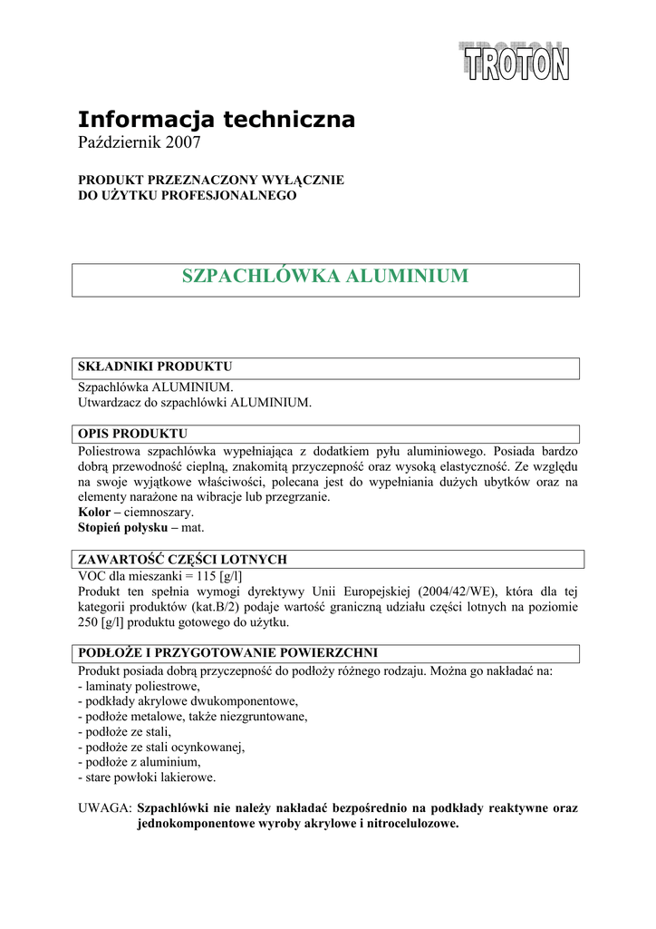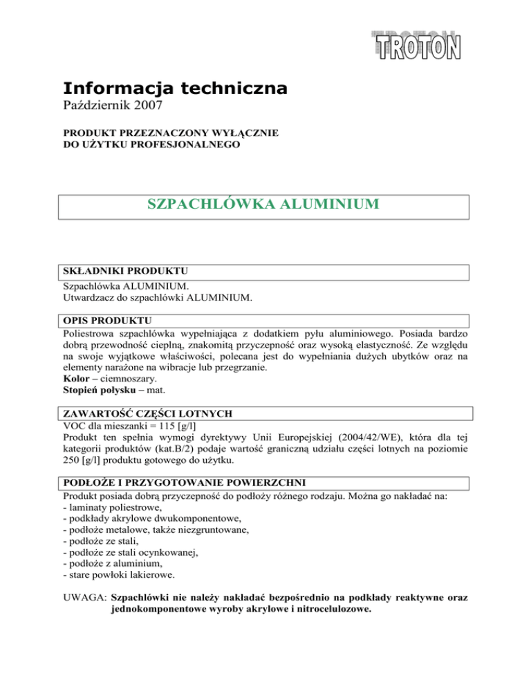 Informacja techniczna Październik 2007 PRODUKT PRZEZNACZONY WYŁĄCZNIE DO UśYTKU PROFESJONALNEGO SZPACHLÓWKA ALUMINIUM SKŁADNIKI PRODUKTU Szpachlówka ALUMINIUM. Utwardzacz do szpachlówki ALUMINIUM. OPIS PRODUKTU Poliestrowa szpachlówka wypełniająca z dodatkiem pyłu aluminiowego. Posiada bardzo dobrą przewodność cieplną, znakomitą przyczepność oraz wysoką elastyczność. Ze względu na swoje wyjątkowe właściwości, polecana jest do wypełniania duŜych ubytków oraz na elementy naraŜone na wibracje lub przegrzanie. Kolor – ciemnoszary. Stopień połysku – mat. ZAWARTOŚĆ CZĘŚCI LOTNYCH VOC dla mieszanki = 115 [g/l] Produkt ten spełnia wymogi dyrektywy Unii Europejskiej (2004/42/WE), która dla tej kategorii produktów (kat.B/2) podaje wartość graniczną udziału części lotnych na poziomie 250 [g/l] produktu gotowego do uŜytku. PODŁOśE I PRZYGOTOWANIE POWIERZCHNI Produkt posiada dobrą przyczepność do podłoŜy róŜnego rodzaju. MoŜna go nakładać na: - laminaty poliestrowe, - podkłady akrylowe dwukomponentowe, - podłoŜe metalowe, takŜe niezgruntowane, - podłoŜe ze stali, - podłoŜe ze stali ocynkowanej, - podłoŜe z aluminium, - stare powłoki lakierowe. UWAGA: Szpachlówki nie naleŜy nakładać bezpośrednio na podkłady reaktywne oraz jednokomponentowe wyroby akrylowe i nitrocelulozowe. Laminaty poliestrowe naleŜy wcześniej odtłuścić, przeszlifować na sucho (P80 - P120) i ponownie odtłuścić. Podkłady naleŜy wcześniej odtłuścić, przeszlifować na sucho (P220 - P280) i ponownie odtłuścić. Powierzchnię stalową naleŜy wcześniej odtłuścić, przeszlifować na sucho (P80 - P120) i ponownie odtłuścić. Powierzchnię aluminiową naleŜy wcześniej odtłuścić, zmatowić włókniną ścierną i ponownie odtłuścić. Stare powłoki naleŜy wcześniej odtłuścić, przeszlifować na sucho (P220 - P280) i ponownie odtłuścić. PROCES APLIKACJI Zastosowanie Szpachlówka wypełniająca do napraw duŜych ubytków. Szczególnie polecana w miejscach naraŜonych na częste i gwałtowne zmiany temperatury lub wibracje (np., pokrywa silnika) Proporcja mieszania składników Części wagowe. Masa szpachlowa Utwardzacz 100 części 2-3 części Składniki wymieszać do uzyskania jednolitego koloru. Czas nanoszenia po wymieszaniu z utwardzaczem 4-6 min Aplikacja Nanosić szpachlą. Nie przekraczać łącznej grubości 5 mm. Czasy utwardzania 20-25 minut w 20oC 10 minut w temperaturze nie przekraczającej 60oC. Temperatura poniŜej 20oC znacznie wydłuŜa czas schnięcia DALSZE PRACE Po utwardzeniu powierzchnię naleŜy zeszlifować: - szlifowanie zgrubne: P80-P120, - szlifowanie wykańczające: P120-P240. Na szpachlówkę ALUMINIUM moŜna połoŜyć: - szpachlówkę poliestrową wykończeniową, - szpachlówkę natryskową poliestrową, - podkłady akrylowe. UWAGI OGÓLNE - Podczas pracy z produktami 2K konieczne jest uŜywanie sprawnego sprzętu ochrony osobistej. NaleŜy chronić oczy i drogi oddechowe. - Pomieszczenia powinny być dobrze wentylowane. - Mycie narzędzi naleŜy przeprowadzić bezpośrednio po aplikacji. - Nie naleŜy przekraczać zalecanych dawek utwardzacza! - Minimalna temperatura nanoszenia wynosi +10oC. Uwaga: W celu bezpieczeństwa naleŜy zawsze postępować zgodnie z danymi zawartymi w Karcie Charakterystyki Substancji Niebezpiecznej dla danego wyrobu. PRZECHOWYWANIE Składniki produktu naleŜy przechowywać w szczelnie zamkniętym pojemniku, w pomieszczeniach suchych i chłodnych, z dala od źródeł ognia, ciepła i promieni słonecznych. Uwaga: Po kaŜdorazowym uŜyciu, pojemniki naleŜy natychmiast zamknąć! Utwardzacz chronić przed przegrzaniem! OKRES GWARANCJI Szpachlówka ALUMINIUM - 12 miesięcy od daty produkcji. Utwardzacz do szpachlówki ALUMINIUM - 18 miesięcy od daty produkcji. Wszystkie informacje opierają się na skrupulatnych badaniach laboratoryjnych i długoletnim doświadczeniu. Ugruntowana pozycja na rynku nie zwalnia nas z ciągłej kontroli jakości naszych produktów. Jednak nie ponosimy odpowiedzialności za końcowe efekty przy niewłaściwym przechowywaniu lub uŜytkowaniu naszych wyrobów oraz za pracę niezgodną ze sztuką dobrego rzemiosła. TROTON sp. z o.o. Ząbrowo.
