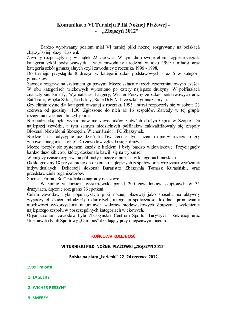 Komunikat z VI Turnieju Piłki Nożnej Plażowej - „Zbąszyń 2012” Bardzo wyrównany poziom miał VI turniej piłki nożnej rozgrywany na boiskach zbąszyńskiej plaży „Łazienki”. Zawody rozpoczęły się w piątek 22 czerwca. W tym dniu swoje eliminacyjne rozegrała kategoria szkół podstawowych a więc zawodnicy urodzeni w roku 1999 i młodsi oraz kategoria szkół gimnazjalnych czyli zawodnicy z rocznika 1996 - 1998. Do turnieju przystąpiło 8 drużyn w kategorii szkół podstawowych oraz 6 w kategorii gimnazjów. Zawody rozgrywano systemem grupowym. Mecze składały trzech czterominutowych części. W obu kategoriach wiekowych wyłoniono po cztery najlepsze drużyny. W półfinałach znalazły się: Smerfy, Wymiatacze, Laggery, Wicher Perzyny ze szkół podstawowych oraz Bat Team, Wnęka Skład, Korbaksy, Białe Orły N.T. ze szkół gimnazjalnych. Gry eliminacyjne dla kategorii otwartej z rocznika 1995 i starsi rozpoczęły się w sobotę 23 czerwca od godziny 11.00. Zgłoszono do nich aż 16 zespołów. Zawody w tej grupie rozegrano systemem brazylijskim. Niespodzianką było wyeliminowanie zawodników z dwóch drużyn Ognia w Szopie. Do najlepszej czwórki, a tym samym niedzielnych półfinałów zakwalifikowały się zespoły Blokersi, Niewidomi Skorzęcin, Wicher Junior i FC Zbąszynek. Niedziela to tradycyjnie już dzień finałów. Jednak tym razem najpierw rozegrano gry w nowej kategorii – kobiet. Do zawodów zgłosiło się 5 drużyn. Mecze toczyły się systemem każdy z każdym i były bardzo widowiskowe. Przyciągnęły bardzo dużo kibiców, którzy doskonale bawili się na trybunach. W między czasie rozgrywano półfinały i mecze o miejsca w kategoriach męskich. Około godziny 18 przystąpiono do dekoracji najlepszych zespołów oraz wręczenia wyróżnień indywidualnych. Dekoracji dokonał Burmistrz Zbąszynia Tomasz Kurasiński, oraz przedstawiciele organizatorów. Sponsor Firma „Bor” zadbała o nagrody rzeczowe. W sumie w turnieju wystartowało ponad 200 zawodników skupionych w 35 drużynach. Łącznie rozegrano 76 spotkań. Celem zawodów była popularyzacja piłki nożnej plażowej jako sposobu na aktywny wypoczynek dzieci, młodzieży i dorosłych, integracja społeczności lokalnej, promowanie możliwości wykorzystania naturalnych walorów środowiskowych Zbąszynia, wyłonienie najlepszego zespołu w poszczególnych kategoriach wiekowych. Organizatorami zawodów było Zbąszyńskie Centrum Sportu, Turystyki i Rekreacji oraz Uczniowski Klub Sportowy „Olimpus” działający przy miejscowym liceum. KOŃCOWA KOLEJNOŚĆ VI TURNIEJU PIŁKI NOŻNEJ PLAŻOWEJ „ZBĄSZYŃ 2012” Boiska na plaży „Łazienki” 22- 24 czerwca 2012 1999 i młodsi 1. LAGEERY 2. WICHER PERZYNY 3. SMERFY 4. WYMIATACZE 1996 – 1998 1. BIAŁE ORŁY N.T. 2. KORBAKSY 3. WNĘKA SKŁAD 4. BAT TEAM 1995 i starsi 1. FC ZBĄSZYNEK 2. WICHER JUNIOR 3. NIEWIDOMI SKORZĘCIN 4. BLOKERSI KATEGORIA KOBIET 1. LECHIA WOMEN 2. CRAZY CHICKEN 3. MUSZKIETERKI INTERMARCHE 4. NIEUCHWYTNE 5. CZTEROHEKSANWODOROWOTRÓJHELOWIEC WYRÓŻNIENIA INDYWIDUALNE Najskuteczniejszy zawodnik Kobiety MONIKA OLSZEWSKA 1999 i młodsi ŁUKASZ WRĘBEL 1996 – 1999 DAWID MAJCHEREK 1995 i starsi MACIEJ GRZEŚ Najlepszy bramkarz Kobiety ALEKSANDRA NAPIERAŁA 1999 i młodsi DAWID SEIFERT 1996– 1999 IGOR MROZKOWIAK 1995i starsi JAKUB MARCINIAK Najlepszy zawodnik Kobiety KALUDIA PAWLIK 1999 i młodsi OLEK FRASZ 1996 – 1999 KAMIL ŚMIGIELSKI 1995 i starsi KAMIL MACIEJEWSKI