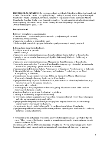 PROTOKÓŁ Nr XXXII/2013 z przebiegu obrad sesji Rady Miejskiej w Kluczborku odbytej w dniu 27 marca 2013 roku .Na ogólną liczbę 21 radnych, w sesji udział wzięło 20radnych. Nieobecny Radny Andrzej Konwiński .Ponadto w sesji udział wzięli: Burmistrz Miasta Kluczborka Jarosław Kielar ,z-ca Burmistrza Andrzej Nowak, przedstawiciele Administracji Samorządowej, Skarbnik Gminy, Radca Prawny Urzędu Miejskiego Sołtysi Wsi . Obrady rozpoczęto o godz.:14,00 Porządek obrad 1.Sprawy porządkowo-organizacyjne: a/ otwarcie sesji i stwierdzenie prawomocności podejmowanych uchwał, b/ ustalenie porządku obrad, c/ przyjęcie protokołu z poprzedniej sesji d/ informacja Przewodniczącego o działaniach podejmowanych między sesjami. 2. Interpelacje i zapytania Radnych. 3.Podjęcie uchwał w sprawie: Opinie Komisji a/ przyjęcia sprawozdania finansowego Kluczborskiego Domu Kultury w Kluczborku, b/ przyjęcia sprawozdania finansowego Miejskiej i Gminnej Biblioteki Publicznej w Kluczborku, c/ przyjęcia sprawozdania finansowego Muzeum im. Jana DzierŜona w Kluczborku, d/ zawarcia porozumienia z Powiatem Kluczborskim dotyczącego załoŜenia i prowadzenia przedszkola specjalnego przez Powiat Kluczborski, e/ przekształcenia Publicznej Szkoły Podstawowej z Oddziałem Przedszkolnym w Bąkowie, f/ likwidacji Publicznej Szkoły Podstawowej z Oddziałem Przedszkolnym im. Marii Konopnickiej w Biadaczu, g/ rozpatrzenia skargi z dnia 25 stycznia 2013r. na Burmistrza Miasta Kluczborka i Kierownika Ośrodka Pomocy Społecznej w Kluczborku, h/ przyznania dotacji na prace konserwatorskie, restauratorskie lub roboty budowlane przy zabytku wpisanym do rejestru zabytków, i/ umorzenia wierzytelności, j/ rozstrzygnięcia o wyodrębnieniu w budŜecie gminy Kluczbork na rok 2014 środków stanowiących fundusz sołecki, k/ zmian w budŜecie po stronie dochodów i wydatków, l/ zmiany w wieloletniej prognozie finansowej, m/ przyznania dotacji na prace konserwatorskie, restauratorskie lub roboty budowlane przy zabytku wpisanym do rejestru zabytków, n/ przystąpienia do sporządzenia miejscowego planu zagospodarowania przestrzennego terenów zainwestowanych wsi Kuniów, o/ rozpatrzenia skargi z dnia 26 lutego 2013r. na Burmistrza Miasta Kluczborka, p/ programu opieki nad zwierzętami bezdomnymi oraz zapobiegania bezdomności zwierząt na terenie Gminy Kluczbork, r/ wyraŜenia opinii dotyczącej wniesienia jako wkładu niepienięŜnego (aportu) do Spółki z o.o. ”Eko- regoin „ Bełchatów mienia w postaci nieruchomości gruntowej oraz objęcia zamian udziałów Spółki, s/kontynuacji w 2013 i 2014 roku realizacji projektu pn. ”Nowe kompetencje-nowe Ŝycie Program aktywizacji zawodowej i społecznej osób pozostających bez pracy w gminie 1 Kluczbork w ramach Priorytetu VII, Działania 7.1 Rozwój i upowszechnianie aktywnej integracji w Podziałaniu 7.1.1 Rozwój i upowszechnianie aktywnej integracji przez ośrodki pomocy społecznej Programu Operacyjnego Kapitał Ludzki ,współfinansowanego ze środków Europejskiego Funduszu Społecznego. t/ ustalenia planu sieci oraz granic obwodów publicznych szkół podstawowych prowadzonych przez Gminę Kluczbork. 4.Odpowiedzi na zgłoszone w pkt.2 interpelacje i zapytania Radnych . 5.Sprawozdanie z działalności Burmistrza za okres między sesjami. -opinia Komisji Rewizyjnej -dyskusja -przyjęcie sprawozdania. 6. Wolne wnioski i zapytania 7. Zamknięcie obrad. Obecnych na sali 18 radnych Do punktu 1 porządku obrad Sprawy porządkowo - organizacyjne: ab)Sesję Rady Miejskiej otworzył i rozpoczął Przewodniczący Rady Miejskiej w Kluczborku Janusz Kędzia .Stwierdził, Ŝe obecnych na dzisiejszej sesji jest 20 radnych ,zatem obrady i podejmowane uchwały są prawomocne, następnie przedstawił porządek obrad. Po odczytaniu porządku obrad , Przewodniczący zapytał czy są wnioski i uwagi do przedstawionego porządku. Nikt nie wniósł uwag do przedstawionego porządku obrad zatem Przewodniczący przystąpił do jego realizacji . Raport z działalności Stowarzyszenia LGD „Dolina Stobrawy” przedstawił Tomasz Paluch Raport z działalności Stowarzyszenia Lokalna Grupa Działania „Dolina Stobrawy” 1. PROW 2007-2013 Oś 4 Leader 2. Działaj Lokalnie 3. Dodatkowe środki pozyskane na obszar LGD ----------------------------------------------------------------------------------------------------------------1. PROW 2007-2013 Oś 4 Leader BudŜet Lokalnej Grupy Działania „Dolina Stobrawy” na lata 2007-2013 to; 5 101 264,00 w tym: WdraŜanie lokalnych strategii rozwoju:3 998 288,00 WdraŜanie projektów współpracy: 103 404,00 Funkcjonowanie lokalnej grupy działania: 764 572,00 Nabywanie umiejętności i aktywizacja:235 000,00 2 W ramach wdraŜania lokalnych strategii rozwoju Łączna pula rozdysponowanych środków to 2785401,34, w tym: Małe projekty – 326 194,79 zł Odnowa i rozwój wsi – 1 722 206,87 zł Tworzenie i rozwój mikroprzedsiębiorstw – 719 120,50 zł RóŜnicowanie w kierunku działalności nierolniczej – 290 383,00 zł Do rozdysponowania pozostało 1212886,66 2. Działaj Lokalnie Stowarzyszenie Lokalna Grupa Działania "Dolina Stobrawy", pierwsze i do tej pory jedyne zostało wybrane jako Lokalna Organizacja Grantowa w ramach Programu "Działaj Lokalnie". Program finansowany jest ze środków Polsko-Amerykańskiej Fundacji Wolności a realizowany przez Akademię Rozwoju Filantropii w Polsce wraz z LOG. Celem programu jest aktywizowanie lokalnych społeczności wokół róŜnych celów o charakterze dobra wspólnego. Jego realizacji słuŜy organizowanie konkursów grantowych, w których wspierane są projekty inicjujące współpracę mieszkańców z małych miejscowości. ZałoŜenie Lokalnej Organizacji Grantowej w ramach Programu "Działaj Lokalnie". Program finansowany jest ze środków Polsko-Amerykańskiej Fundacji Wolności a realizowany przez Akademię Rozwoju Filantropii w Polsce wraz z ODL. - zasięg terytorialny pro