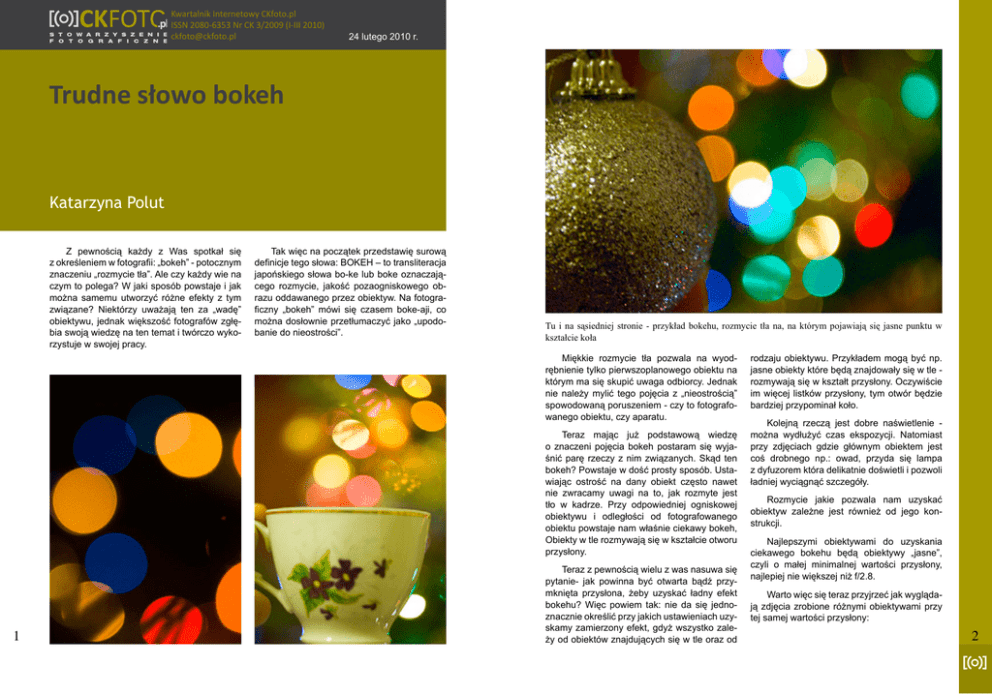 Kwartalnik Internetowy CKfoto.pl ISSN 2080-6353 Nr CK 3/2009 (I-III 2010) [email protected] 24 lutego 2010 r. Trudne słowo bokeh Katarzyna Polut Z pewnością każdy z Was spotkał się z określeniem w fotografii: „bokeh” - potocznym znaczeniu „rozmycie tła”. Ale czy każdy wie na czym to polega? W jaki sposób powstaje i jak można samemu utworzyć różne efekty z tym związane? Niektórzy uważają ten za „wadę” obiektywu, jednak większość fotografów zgłębia swoją wiedzę na ten temat i twórczo wykorzystuje w swojej pracy. Tak więc na początek przedstawię surową definicje tego słowa: BOKEH – to transliteracja japońskiego słowa bo-ke lub boke oznaczającego rozmycie, jakość pozaogniskowego obrazu oddawanego przez obiektyw. Na fotograficzny „bokeh” mówi się czasem boke-aji, co można dosłownie przetłumaczyć jako „upodobanie do nieostrości”. Tu i na sąsiedniej stronie - przykład bokehu, rozmycie tła na, na którym pojawiają się jasne punktu w kształcie koła Miękkie rozmycie tła pozwala na wyodrębnienie tylko pierwszoplanowego obiektu na którym ma się skupić uwaga odbiorcy. Jednak nie należy mylić tego pojęcia z „nieostrością” spowodowaną poruszeniem - czy to fotografowanego obiektu, czy aparatu. Teraz mając już podstawową wiedzę o znaczeni pojęcia bokeh postaram się wyjaśnić parę rzeczy z nim związanych. Skąd ten bokeh? Powstaje w dość prosty sposób. Ustawiając ostrość na dany obiekt często nawet nie zwracamy uwagi na to, jak rozmyte jest tło w kadrze. Przy odpowiedniej ogniskowej obiektywu i odległości od fotografowanego obiektu powstaje nam właśnie ciekawy bokeh, Obiekty w tle rozmywają się w kształcie otworu przysłony. 1 Teraz z pewnością wielu z was nasuwa się pytanie- jak powinna być otwarta bądź przymknięta przysłona, żeby uzyskać ładny efekt bokehu? Więc powiem tak: nie da się jednoznacznie określić przy jakich ustawieniach uzyskamy zamierzony efekt, gdyż wszystko zależy od obiektów znajdujących się w tle oraz od rodzaju obiektywu. Przykładem mogą być np. jasne obiekty które będą znajdowały się w tle rozmywają się w kształt przysłony. Oczywiście im więcej listków przysłony, tym otwór będzie bardziej przypominał koło. Kolejną rzeczą jest dobre naświetlenie można wydłużyć czas ekspozycji. Natomiast przy zdjęciach gdzie głównym obiektem jest coś drobnego np.: owad, przyda się lampa z dyfuzorem która delikatnie doświetli i pozwoli ładniej wyciągnąć szczegóły. Rozmycie jakie pozwala nam uzyskać obiektyw zależne jest również od jego konstrukcji. Najlepszymi obiektywami do uzyskania ciekawego bokehu będą obiektywy „jasne”, czyli o małej minimalnej wartości przysłony, najlepiej nie większej niż f/2.8. Warto więc się teraz przyjrzeć jak wyglądają zdjęcia zrobione różnymi obiektywami przy tej samej wartości przysłony: 2 Widzimy wiec jak ważny jest rodzaj obiektywu, jego budowa ale również ważny jest fotografowany obiekt. Im drugi plan jest dalej tym lepsze efekty bokehu jesteśmy wstanie osiągnąć. 3 Helios, f/2 58 mm Nikkor, f/2 50 mm Helios, f/5,6 58 mm Sigma 70-300, f//5,6 150 mm Jupiter, f/5,6 135 mm Dla chcących się trochę pobawić z efektami polecam zrobienie sobie samemu nakładkę na obiektyw dzięki której jasne obiekty w tle będą w kształcie wzoru który sami sobie wybierzemy. Jak to zrobić? To bardzo proste. Potrzebujemy do tego kawałka kartonu (najlepiej czarnego) , taśmy klejącej, nożyczek i trochę fantazji. Wycinamy z kartonu pasek, który przymierzamy do obiektywu. Szerokość zależy od obiektywu do którego chcemy zastosować nakładkę, ale pamiętajmy, żeby nie była zbyt wąska gdyż będzie się zsuwać. Następnie trzeba zrobić „wieczko”. Staramy się zmierzyć średnicę i rysujemy na kartce, wycinamy. Teraz należy wyciąć kwadratowy otwór w który będziemy wkładać przygotowane wzory powycinane w kawałku kartki. Wszystko ilustrują dwa zdjęcia poniżej. I tutaj musze dodać jeszcze jedno. Mając gotowy otwór możemy go wykorzystać także jako „winietę”. 4 rozwiązań związanych z bokehem. Co to jest? Lensbaby to obiektyw charakteryzujący się szczególnymi właściwościami obrazu - niemożliwe do uzyskania za pomocą tradycyjnej optyki, stosowanej w cyfrowych lustrzankach. Ma zupełnie inną budowę niż reszta standardowych obiektywów. Przede wszystkim składa się z gumowych elementów z kulowym mocowaniem. Brak w nim elektronicznej komunikacji z aparatem więc oczywiście tryb jedynie manualny. Co ciekawe i co najbardziej go wyróżnia: ostrzenie odbywa się tu ręcznie, obracając nim co pozwala na ukierunkowanie miejsca w którym ma być ostro. Konstrukcje stanowią 2 soczewki a przesłona regulowana jest za pomocą wymiennych blaszek o różnej średnicy. To jest najnowsza wersja tego typu obiektywu. Na rynku można się spotkać jeszcze z innymi typami ale wszystkie dają możliwość „wyginania” obiektywu i wszystkie podobnie działają. Przesłona: posiada wymienne krążki z tworami, które są mocowane magnetycznie, można tu użyć też niestandardowych krążków np. w kształcie serca, gwiazdki. Efekty możliwe do uzyskania za pomocą nakładek opisanych w tekście powyżej Następnie przyklejamy wieczko do opaski i teraz już tylko musimy przyszykować sobie wzory. Trzeba zwrócić uwagę na to, aby rozmiar wzorów nie był zbyt duży gdyż nie otrzymamy zamierzonego efektu (ok.1cm). Jakie wzory? To już zależy od waszej inwencji twórczej. Powodzenia! Najciekawsze efekty jednak da nam Lensbaby. System obiektywów Lensbaby 5 W Polsce może nie jest tak powszechne i budzi sporo dyskusji. Nie każdemu podobają się efekty, które można otrzymać tym wynalazkiem. Jednak z pewnością jest to super sprawa dla osób, które szukają nowych ciekawych Wyróżnia się dużą ostrością skupioną w jednym miejscu kadru (zwanym Swe