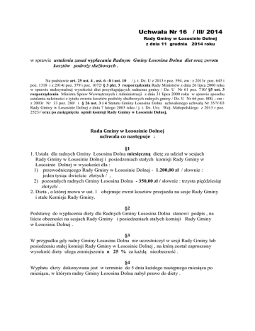 Uchwała Nr 16 / lll/ 2014 Rady Gminy w Łososinie Dolnej z dnia 11 grudnia 2014 roku w sprawie ustalenia zasad wypłacania Radnym Gminy Łososina Dolna diet oraz zwrotu kosztów podroży służbowych . Na podstawie art. 25 ust. 4 , ust. 6 –8 i ust. 10 / j. t. Dz. U z 2013 r poz. 594, zm : z 2013r poz. 645 i poz. 1318 i z 2014r poz. 379 i poz. 1072/ § 3 pkt. 3 rozporządzenia Rady Ministrów z dnia 26 lipca 2000 roku w sprawie maksymalnej wysokości diet przysługujących radnemu gminy / Dz. U Nr 61 poz. 710/ §5 ust. 3 rozporządzenia Ministra Spraw Wewnętrznych i Administracji z dnia 31 lipca 2000 roku w sprawie sposobu ustalania należności z tytułu zwrotu kosztów podróży służbowych radnych gminy / Dz. U Nr 66 poz. 800, ; zm : z 2003r Nr 33 poz. 280/ i § 26 ust. 3 i 4 Statutu Gminy Łososina Dolna uchwalonego uchwalą Nr 35/V/03 Rady Gminy w Łososinie Dolnej z dnia 7 lutego 2003 roku / j. t. Dz. Urz. Woj. Małopolskiego z 2013 r poz. 2523// oraz po zasięgnięciu opinii komisji Rady Gminy w Łososinie Dolnej, Rada Gminy w Łososinie Dolnej uchwala co następuje : §1 1. Ustala dla radnych Gminy Łososina Dolna miesięczną dietę za udział w sesjach Rady Gminy w Łososinie Dolnej i posiedzeniach stałych komisji Rady Gminy w Łososinie Dolnej w wysokości dla : 1) przewodniczącego Rady Gminy w Łososinie Dolnej - 1.200,00 zł / słownie : jeden tysiąc dwieście złotych / , 2) pozostałych radnych Gminy Łososina Dolna - 350,00 zł / słownie : trzysta pięćdziesiąt złotych/ . 2. Dieta , o której mowa w ust. 1 obejmuje zwrot kosztów przejazdu na sesje Rady Gminy i stałe Komisje Rady Gminy. §2 Podstawę do wypłacenia diety dla Radnych Gminy Łososina Dolna stanowi podpis , na liście obecności na sesjach Rady Gminy i posiedzeniach stałych komisji Rady Gminy w Łososinie Dolnej . §3 W przypadku gdy radny Gminy Łososina Dolna nie uczestniczył w sesji Rady Gminy lub posiedzeniu stałej komisji Rady Gminy w Łososinie Dolnej , na którą został zaproszony wysokość diety ulega zmniejszeniu o 25 % za każdą nieobecność . §4 Wypłata diety dokonywana jest w terminie do 5 dnia każdego następnego miesiąca po miesiącu, w którym radny Gminy Łososina Dolna nabył prawo do diety . §5 Określa stawkę za jeden kilometr przebiegu pojazdu w przypadku używania przez radnego Gminy Łososina Dolna pojazdu samochodowego nie będącego własnością Gminy w wysokości określonej rozporządzeniem Ministra Infrastruktury z dnia 25 marca 2002 r w sprawie warunków ustalania oraz sposobu dokonywania zwrotu kosztów używania do celów służbowych samochodów osobowych, motocykli i motorowerów niebędących własnością pracodawcy / Dz. U Nr 27 poz. 271 , zm. : z 2004r Nr 237 poz. 2376 , z 2007r Nr 201 poz. 1462i z 2011r Nr 61 poz. 308/ . §6 1. Podstawę do wypłacania kosztów podróży służbowej dla radnego Gminy Łososina Dolna , o których mowa w §5 stanowi przedłożone rozliczenie polecenia wyjazdu służbowego. 2. Wypłata należności nastąpi w terminie 7 dni po przedłożeniu dokumentów w Referacie Finansowo-Budżetowym Urzędu Gminy w Łososinie Dolnej – wypłata dokonywana jest w kasie Urzędu Gminy. §7 Wykonanie uchwały zleca się Wójtowi Gminy Łososina Dolna . §8 Traci moc uchwała Nr 17/III/10 Rady Gminy w Łososinie Dolnej z dnia 10 grudnia 2010 roku w sprawie ustalenia zasad wypłacania radnym Rady Gminy w Łososinie Dolnej diet oraz kosztów podróży służbowych . §7 Uchwała wchodzi w życie z dniem 1 stycznia 2015 roku. Przewodniczący Rady Bolesław OLEKSY