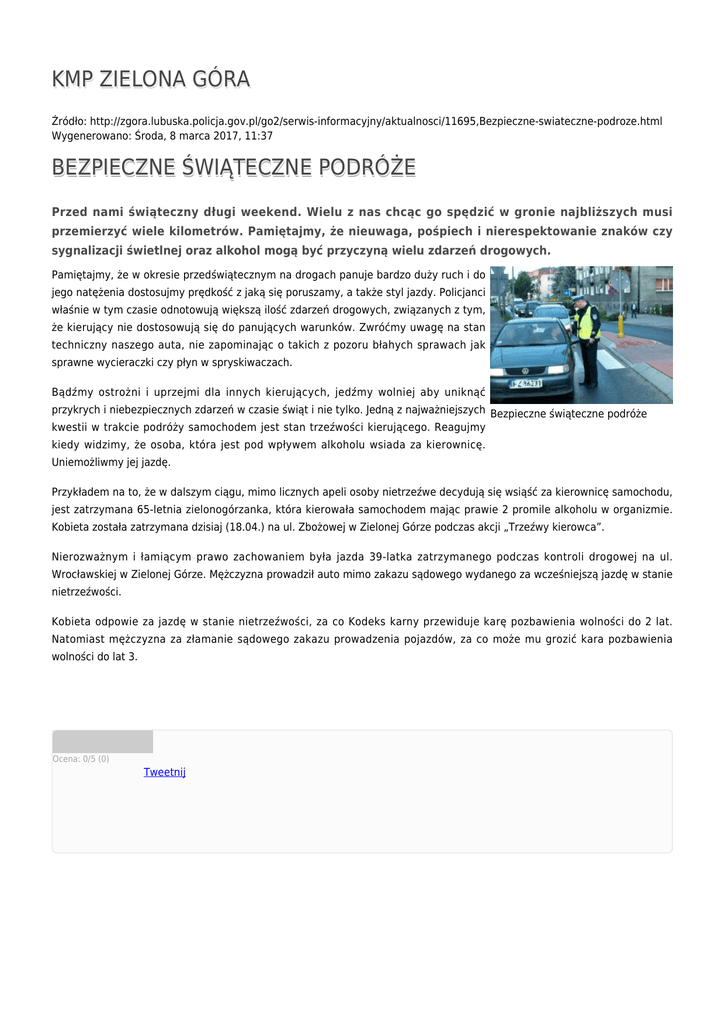 KMP ZIELONA GÓRA Źródło: http://zgora.lubuska.policja.gov.pl/go2/serwis-informacyjny/aktualnosci/11695,Bezpieczne-swiateczne-podroze.html Wygenerowano: Środa, 8 marca 2017, 11:37 BEZPIECZNE ŚWIĄTECZNE PODRÓŻE Przed nami świąteczny długi weekend. Wielu z nas chcąc go spędzić w gronie najbliższych musi przemierzyć wiele kilometrów. Pamiętajmy, że nieuwaga, pośpiech i nierespektowanie znaków czy sygnalizacji świetlnej oraz alkohol mogą być przyczyną wielu zdarzeń drogowych. Pamiętajmy, że w okresie przedświątecznym na drogach panuje bardzo duży ruch i do jego natężenia dostosujmy prędkość z jaką się poruszamy, a także styl jazdy. Policjanci właśnie w tym czasie odnotowują większą ilość zdarzeń drogowych, związanych z tym, że kierujący nie dostosowują się do panujących warunków. Zwróćmy uwagę na stan techniczny naszego auta, nie zapominając o takich z pozoru błahych sprawach jak sprawne wycieraczki czy płyn w spryskiwaczach. Bądźmy ostrożni i uprzejmi dla innych kierujących, jedźmy wolniej aby uniknąć przykrych i niebezpiecznych zdarzeń w czasie świąt i nie tylko. Jedną z najważniejszych Bezpieczne świąteczne podróże kwestii w trakcie podróży samochodem jest stan trzeźwości kierującego. Reagujmy kiedy widzimy, że osoba, która jest pod wpływem alkoholu wsiada za kierownicę. Uniemożliwmy jej jazdę. Przykładem na to, że w dalszym ciągu, mimo licznych apeli osoby nietrzeźwe decydują się wsiąść za kierownicę samochodu, jest zatrzymana 65-letnia zielonogórzanka, która kierowała samochodem mając prawie 2 promile alkoholu w organizmie. Kobieta została zatrzymana dzisiaj (18.04.) na ul. Zbożowej w Zielonej Górze podczas akcji „Trzeźwy kierowca”. Nierozważnym i łamiącym prawo zachowaniem była jazda 39-latka zatrzymanego podczas kontroli drogowej na ul. Wrocławskiej w Zielonej Górze. Mężczyzna prowadził auto mimo zakazu sądowego wydanego za wcześniejszą jazdę w stanie nietrzeźwości. Kobieta odpowie za jazdę w stanie nietrzeźwości, za co Kodeks karny przewiduje karę pozbawienia wolności do 2 lat. Natomiast mężczyzna za złamanie sądowego zakazu prowadzenia pojazdów, za co może mu grozić kara pozbawienia wolności do lat 3. Ocena: 0/5 (0) Tweetnij