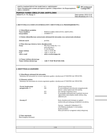 KARTA CHARAKTERYSTYKI SUBSTANCJI / MIESZANINY Karta Charakterystyki zosta a sporz dzona zgodnie z Za cznikiem I do Rozporz dzenia (WE) nr 453/2010. PERFEX FARBA EMULSYJNA AKRYLOWA MSDS PL 01 / PL Wersja 6 Data wydruku 2010-12-22 Data aktualizacji 25-11-10 1. IDENTYFIKACJA SUBSTANCJI/MIESZANINY I IDENTYFIKACJA PRZEDSI BIORSTWA 1.1 Identyfikator produktu Nazwa handlowa kod produktu : : PERFEX FARBA EMULSYJNA AKRYLOWA 10100DN7717 1.2 Istotne zidentyfikowane zastosowania substancji lub mieszaniny oraz zastosowania odradzane Zalecane u ycie : pow oka 1.3 Dane dotycz ce dostawcy karty charakterystyki : PPG Deco Polska Sp. z o.o. Firma ul.Kwidzy ska 8 51-416 Wroc aw : +(48) 71 78 80 700 Numer telefonu : +(48) 71 78 80 702 FAX : [email protected] Adres e-mail 1.4 Numer telefonu alarmowego Numer telefonu alarmowego : +(48) 71 78 80 700 (07:00-15:00) 2. IDENTYFIKACJA ZAGRO E 2.1 Klasyfikacja substancji lub mieszaniny Substancja lub mieszanina nie stwarza zagro enia zgodnie z dyrektywami 67/548/EWG lub 1999/45/WE. 2.2 Elementy etykiety Substancja lub mieszanina nie stwarza zagro enia zgodnie z dyrektywami 67/548/EWG lub 1999/45/WE. Zwroty bezpiecznego post powania - S : S2 S46 Chroni przed dzie mi. W razie po kni cia niezw ocznie zasi gnij porady lekarza - poka opakowanie lub etykiet . Nie wdycha rozpylonej cieczy W przypadku niedostatecznej wentylacji stosowa odpowiednie indywidualne rodki ochrony dróg oddechowych. S23 S38 Zwrot(y) P : Karta charakterystyki dostepna na danie u ytkownika prowadz cego dzia alno zawodow . Zawiera: : imidazo[4,5-d]imidazol-2,5(1H,3H)dione,tetrahydro-1,3,4,6-tetrakis(hydroxymethyl) Mo e powodowa wyst pienie reakcji alergicznej. 2.3 Inne zagro enia Brak dost pnej informacji. 1/10 KARTA CHARAKTERYSTYKI SUBSTANCJI / MIESZANINY Karta Charakterystyki zosta a sporz dzona zgodnie z Za cznikiem I do Rozporz dzenia (WE) nr 453/2010. PERFEX FARBA EMULSYJNA AKRYLOWA MSDS PL 01 / PL Wersja 6 Data wydruku 2010-12-22 Data aktualizacji 25-11-10 3. SK AD I INFORMACJA O SK ADNIKACH 3.2 Mieszaniny Sk adniki Nr EC Nr CAS Uwaga Benzyna ci ka obrabiana wodorem 265-150-3 DSD Klasyfikacja 64742-48-9 Nota H, R10 Nota P Xn; R65 R66 imidazo[4,5-d]imidazol2,5(1H,3H)dione,tetrahydro -1,3,4,6-tetrakis(hydroxymethyl) 226-408-0 5395-50-6 CLP Klasyfikacja St enie 1B; H350 Muta.1B; H340 Asp. Tox.1; H304 >=1.00 - <2.50% R43 >=0.10 - <1.00% * Lista Kandydacka Substancji o Du ym Znaczeniu dla Autoryzacji Producent wyrobu deklaruje, e dla zwrotów R niewymienionych w punkcie 3 ca kowita zawarto substancji nie przekracza warto ci granicznych.Wed ug deklaracji producentów surowców ca kowita zawarto benzenu < 0,1%. Klasyfikacja z uwzgl dnieniem NOTY H i NOTY P. Je eli pojawia si wiele substancji o jednakowych identyfikatorach, to jednak ró ni si one w asno ciami niebezpiecze stwa np. punkt zap onu. 4. PIERWSZA POMOC 4.1 Opis rodków pierwszej pomocy : Porady ogólne Kontakt z oczami : Kontakt przez skór : Wdychanie : Po kni cie : W przypadku utrzymuj cych si objawów lub jakichkolwiek w tpliwo ci zasi gn porady medycznej. Nigdy nie podawa niczego doustnie osobie nieprzytomnej. Przep ukiwa otwarte oczy obficie czyst , wie wod przynajmniej przez 10 minut. Usun szk a kontaktowe. Zasi gn porady medycznej. Natychmiast zdj ska one ubranie. Przemy skór wod z myd em. NIE STOSOWA rozpuszczalników lub rozcie czalników. Wynie na wie e powietrze. Zapewni poszkodowanemu ciep o i spokój. W przypadku nieregularnego lub zatrzymanego oddechu zastosowa sztuczne oddychanie. Osobie nieprzytomnej zapewni pozycj bezpieczn - "boczn ustalon " i zasi gn porady medycznej. W razie przypadkowego po kni cia niezw ocznie zapewni opiek medyczn . Pozostawi w spokoju. NIE prowokowa wymiotów. 4.2 Najwa niejsze ostre i opó nione objawy oraz skutki nara enia W przypadku awarii lub je eli le si poczujesz, niezw ocznie zasi gnij porady lekarza - je eli to mo liwe, poka etykiet Przedstawi lekarzowi do czon Kart Charakterystyki produktu. 4.3 Wskazanie natychmiastowej opieki lekarskiej i potrzebnego specjalnego traktowania Nieprzytomnej osobie nigdy nie podawa nic doustnie. Leczy objawowo 2/10 KARTA CHARAKTERYSTYKI SUBSTANCJI / MIESZANINY Karta Charakterystyki zosta a sporz dzona zgodnie z Za cznikiem I do Rozporz dzenia (WE) nr 453/2010. PERFEX FARBA EMULSYJNA AKRYLOWA MSDS PL 01 / PL Wersja 6 Data wydruku 2010-12-22 Data aktualizacji 25-11-10 5. POST POWANIE W PRZYPADKU PO ARU 5.1 rodki ga nicze Odpowiednie rodki ga nicze rodki ga nicze, które nie mog by u yte ze wzgl dów bezpiecze stwa : : Niepalny Nie dotyczy. 5.2 Szczególne zagro enia zwi zane z substancj lub mieszanin : Ch odzi zamkni te zbiorniki nara one na ogie poprzez zraszanie wod . Nie Specjalne zagro enia podczas dopu ci do przedostania si wody z gaszenia po aru do sieci wodnej lub zwalczania po aru kanalizacji. 5.3 Informacje dla stra y po arnej : rodki ochrony indywidualnej stra aków. Nie dotyczy. 6. POST POWANIE W PRZYPADKU NIEZAMIERZONEGO UWOLNIENIA DO RODOWISKA 6.1 Indywidualne rodki ostro no ci, wyposa enie ochronne i procedury w sytuacjach kryzysowych : Stosowa rodki ochrony indywidualnej. Zapewni wentylacj . Sprawd rodki ochrony indywidualnej rodki ochronne w pkt. 7 i 8. Materia mo e powodowa lisko powierzchni. 6.2 Zabezpieczenie rodowiska Zabezpieczenie rodowiska : Stara si , aby nie dopu ci do przedostania si materia u do sieci wodnej lub kanalizacji. W przypadku ska enia produktem rzek, jezior lub cieków powiadomi odpowiednie w adze. 6.3 Metody i materia y zapobiegaj ce rozprzestrzenianiu si ska enia i s u ce do czyszczenia ska enia : Czy ci detergentami. Unika rozpuszczalników. Zebra wyciek w niepalny Metody oczyszczania materia absorbuj cy (ziemia, piasek, ziemia okrzemkowa, wermikulit) i umie ci w zbiorniku do utylizacji zgodnie z lokalnymi/krajowymi przepisami (patrz pkt. 13). : Sprawd w pkt. 15 specyficzne uregulowania krajowe. Porady dodatkowe 6.4 Odniesienie do innych sekcji Informacje o rodkach ochrony indywidualnej w pkt. 8. 7. POST POWANIE Z SUBSTA