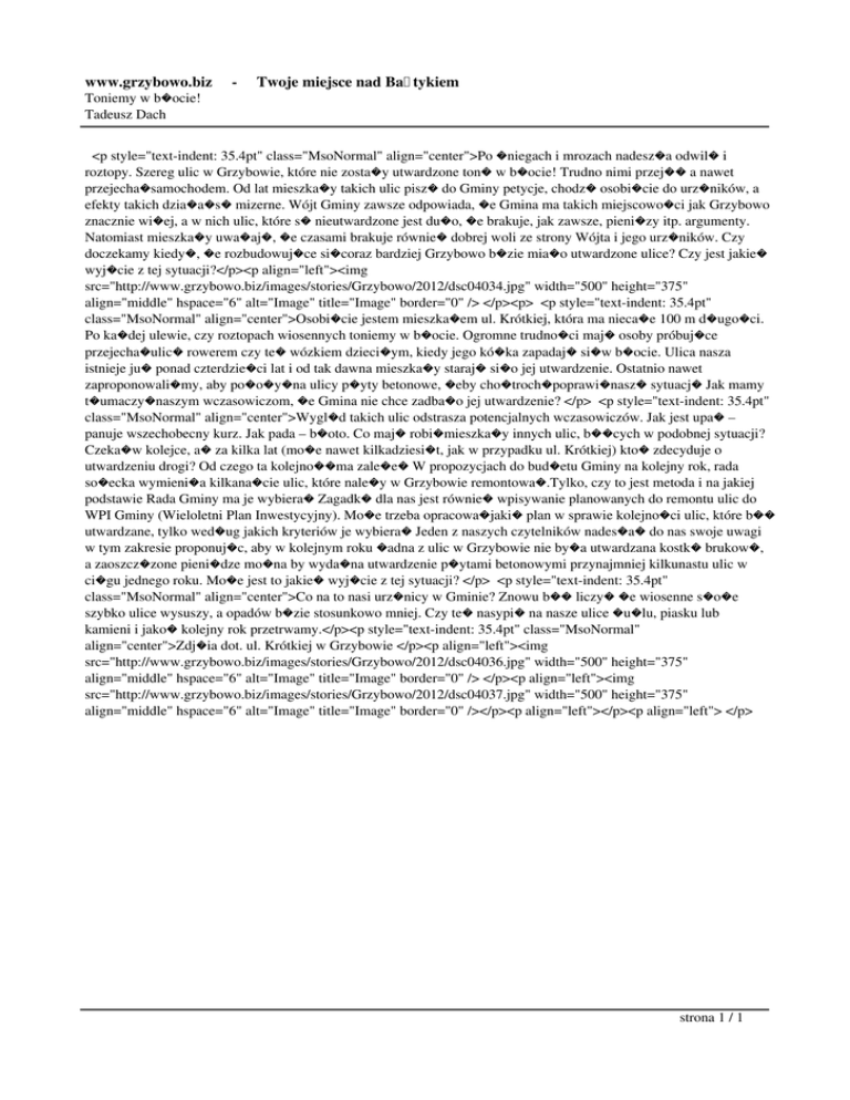 www.grzybowo.biz Toniemy w b�ocie! Tadeusz Dach - Twoje miejsce nad Ba�tykiem <p style="text-indent: 35.4pt" class="MsoNormal" align="center">Po �niegach i mrozach nadesz�a odwil� i roztopy. Szereg ulic w Grzybowie, które nie zosta�y utwardzone ton� w b�ocie! Trudno nimi przej�� a nawet przejecha�samochodem. Od lat mieszka�y takich ulic pisz� do Gminy petycje, chodz� osobi�cie do urz�ników, a efekty takich dzia�a�s� mizerne. Wójt Gminy zawsze odpowiada, �e Gmina ma takich miejscowo�ci jak Grzybowo znacznie wi�ej, a w nich ulic, które s� nieutwardzone jest du�o, �e brakuje, jak zawsze, pieni�zy itp. argumenty. Natomiast mieszka�y uwa�aj�, �e czasami brakuje równie� dobrej woli ze strony Wójta i jego urz�ników. Czy doczekamy kiedy�, �e rozbudowuj�ce si�coraz bardziej Grzybowo b�zie mia�o utwardzone ulice? Czy jest jakie� wyj�cie z tej sytuacji?</p><p align="left"><img src="http://www.grzybowo.biz/images/stories/Grzybowo/2012/dsc04034.jpg" width="500" height="375" align="middle" hspace="6" alt="Image" title="Image" border="0" /> </p><p> <p style="text-indent: 35.4pt" class="MsoNormal" align="center">Osobi�cie jestem mieszka�em ul. Krótkiej, która ma nieca�e 100 m d�ugo�ci. Po ka�dej ulewie, czy roztopach wiosennych toniemy w b�ocie. Ogromne trudno�ci maj� osoby próbuj�ce przejecha�ulic� rowerem czy te� wózkiem dzieci�ym, kiedy jego kó�ka zapadaj� si�w b�ocie. Ulica nasza istnieje ju� ponad czterdzie�ci lat i od tak dawna mieszka�y staraj� si�o jej utwardzenie. Ostatnio nawet zaproponowali�my, aby po�o�y�na ulicy p�yty betonowe, �eby cho�troch�poprawi�nasz� sytuacj� Jak mamy t�umaczy�naszym wczasowiczom, �e Gmina nie chce zadba�o jej utwardzenie? </p> <p style="text-indent: 35.4pt" class="MsoNormal" align="center">Wygl�d takich ulic odstrasza potencjalnych wczasowiczów. Jak jest upa� – panuje wszechobecny kurz. Jak pada – b�oto. Co maj� robi�mieszka�y innych ulic, b��cych w podobnej sytuacji? Czeka�w kolejce, a� za kilka lat (mo�e nawet kilkadziesi�t, jak w przypadku ul. Krótkiej) kto� zdecyduje o utwardzeniu drogi? Od czego ta kolejno��ma zale�e� W propozycjach do bud�etu Gminy na kolejny rok, rada so�ecka wymieni�a kilkana�cie ulic, które nale�y w Grzybowie remontowa�.Tylko, czy to jest metoda i na jakiej podstawie Rada Gminy ma je wybiera� Zagadk� dla nas jest równie� wpisywanie planowanych do remontu ulic do WPI Gminy (Wieloletni Plan Inwestycyjny). Mo�e trzeba opracowa�jaki� plan w sprawie kolejno�ci ulic, które b�� utwardzane, tylko wed�ug jakich kryteriów je wybiera� Jeden z naszych czytelników nades�a� do nas swoje uwagi w tym zakresie proponuj�c, aby w kolejnym roku �adna z ulic w Grzybowie nie by�a utwardzana kostk� brukow�, a zaoszcz�zone pieni�dze mo�na by wyda�na utwardzenie p�ytami betonowymi przynajmniej kilkunastu ulic w ci�gu jednego roku. Mo�e jest to jakie� wyj�cie z tej sytuacji? </p> <p style="text-indent: 35.4pt" class="MsoNormal" align="center">Co na to nasi urz�nicy w Gminie? Znowu b�� liczy� �e wiosenne s�o�e szybko ulice wysuszy, a opadów b�zie stosunkowo mniej. Czy te� nasypi� na nasze ulice �u�lu, piasku lub kamieni i jako� kolejny rok przetrwamy.</p><p style="text-indent: 35.4pt" class="MsoNormal" align="center">Zdj�ia dot. ul. Krótkiej w Grzybowie </p><p align="left"><img src="http://www.grzybowo.biz/images/stories/Grzybowo/2012/dsc04036.jpg" width="500" height="375" align="middle" hspace="6" alt="Image" title="Image" border="0" /> </p><p align="left"><img src="http://www.grzybowo.biz/images/stories/Grzybowo/2012/dsc04037.jpg" width="500" height="375" align="middle" hspace="6" alt="Image" title="Image" border="0" /></p><p align="left"></p><p align="left"> </p> strona 1 / 1