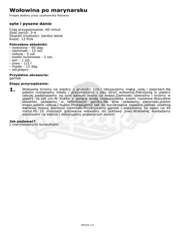 Wołowina po marynarsku Przepis dodany przez użytkownika Marzena syte i pyszne danie Czas przygotowania: 60 minut Ilość porcji: 3-4 Stopień trudności: bardzo łatwe Koszt: 12 PLN Potrzebne składniki: - wołowina - 50 dag - ziemniaki - 12 szt. - cebula - 5 szt. - kostki bulionowe - 2 szt. - por - 1 szt. - piwo - 1/2 l - masło - 12 dag - sól,pieprz Przydatne akcesoria: garnek Etapy przyrządzania: 1. Wołowinę kroimy na plastry o grubości 1cm.i obsypujemy mąką ,solą i pieprzem.Na patelni roztapiamy masło i przysmażamy z obu stron wołowinę.Pokrojoną w plastry cebulę podsmażamy na tym samym maśle co mięso.Ziemniaki obieramy i kroimy w plastry ok.pół cm.W kubku z gorącą wodą rozpuszczamy kostki rosołowe.Wszystkie składniki układamy w teflonowym garnku.Na dnie układamy ziemniaki,potem mięso,potem cebula.i bulion.Postępujemy tak do wyczerpania zapasów,jednak ostatnią warstwę muszą stanowić ziemniaki.Przykrywamy garnek i wstawiamy na ogien na 40 minut.Po 10 minutach gotowania wlewamy do potrawy piwo.Wołowinę wykładamy warstwami na talerze i dekorujemy posiekanym porem. Jak podawać? z marynowanymi buraczkami Strona 1/1