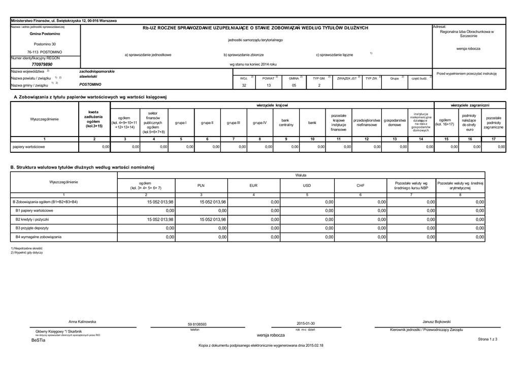 Ministerstwo Finansów, ul. Świętokrzyska 12, 00-916 Warszawa Gmina Postomino jednostki samorządu terytorialnego Postomino 30 76-113 POSTOMINO a) sprawozdanie jednostkowe Numer identyfikacyjny REGON 770979890 Nazwa województwa Nazwa gminy / związku b) sprawozdanie zbiorcze 1) 2) WOJ. POSTOMINO 1) 2) 2) POWIAT 32 Wyszczególnienie kwota zadłużenia ogółem (kol.3+15) ogółem (kol. 4+9+10+11 +12+13+14) 1 2 3 0,00 sektor finansów publicznych ogółem (kol.5+6+7+8) 4 0,00 GMINA 1 B Zobowiązania ogółem (B1+B2+B3+B4) B1 papiery wartościowe B2 kredyty i pożyczki 5 B4 wymagalne zobowiązania TYP GM. 2) ZWIĄZEK JST 2 2) TYP ZW. 2) Grupa część budż. 2) g rupa III g rupa IV bank centralny banki 6 7 8 9 10 0,00 0,00 0,00 0,00 pozostałe krajowe instytucje finansowe przedsiębiorstwa niefinansowe gospodarstwa domowe ins tytuc je niekom erc yjne działając e na rzec z gos podars tw dom owyc h 11 12 13 14 0,00 0,00 0,00 Waluta ogółem (kol. 3+ 4+ 5+ 6+ 7) 2) Przed wypełnieniem przeczytać instrukcję wierzyciele zagraniczni g rupa II 0,00 PLN EUR 3 4 2 15 052 013,98 15 052 013,98 15 052 013,98 15 052 013,98 0,00 0,00 0,00 0,00 0,00 B3 przyjęte depozyty 2) 05 B. Struktura walutowa tytułów dłużnych według wartości nominalnej Wyszczególnienie wersja robocza 1) wierzyciele kraj owi g rupa I 0,00 2) 13 A. Zobowiązania z tytułu papierów wartościowych wg wartości księgowej papiery wartościowe c) sprawozdanie łączne wg stanu na koniec 2014 roku zachodniopomorskie sławieński 2) Nazwa powiatu / związku Adresat: Regionalna Izba Obrachunkowa w Szczecinie Rb-UZ ROCZNE SPRAWOZDANIE UZUPEŁNIAJĄCE O STANIE ZOBOWIĄZAŃ WEDŁUG TYTUŁÓW DŁUŻNYCH Nazwa i adres jednostki sprawozdawczej 0,00 USD 0,00 5 0,00 0,00 0,00 0,00 0,00 0,00 0,00 0,00 6 0,00 Pozostałe waluty wg średnieg o kursu NBP CHF 0,00 0,00 0,00 0,00 0,00 0,00 0,00 7 ogółem (kol. 16+17) 15 podmioty należące do strefy euro pozostałe podmioty zag raniczne 16 17 0,00 0,00 Pozostałe waluty wg średniej arytmetycznej 0,00 8 0,00 0,00 0,00 0,00 0,00 0,00 0,00 0,00 0,00 1) Niepotrzebne skreślić 2) Wypełnić gdy dotyczy Anna Kalinowska Główny Księgowy */ Skarbnik nie dotyczy sprawozdań zbiorczych sporządzonych przez RIO BeSTia 2015-01-30 59 8108593 telefon wersja robocza rok m-c dzień Kopia z dokumentu podpisanego elektronicznie wygenerowana dnia 2015.02.18 Janusz Bojkowski Kierownik jednostki / Przewodniczący Zarządu Strona 1 z 3 0,00 C. Struktura terminowa zobowiązań z tytułu zaciągniętych kredytów i pożyczek oraz wyemitowanych papierów wartościowych C1. Papiery wartościowe według pierwotnego terminu zapadalności – stan na koniec okresu sprawozdawczego (wg wartości nominalnej) zapadalność w latach papiery wartościowe wierzyciele 1 1. łącznie (w. 2+3+4+5+6+7+8+9+10+11+12+13) łącznie (kol. 3+4+5) 2 0,00 (0;1> (1;5> pow. 5 wierzyciele 3 4 5 1 0,00 2. grupa I 0,00 6. bank centralny 11. instytucje niekomercyjne działające na rzecz gospodarstw domowych 12. podmioty należace do strefy euro 0,00 0,00 0,00 0,00 0,00 0,00 0,00 0,00 0,00 0,00 0,00 0,00 0,00 0,00 0,00 13. pozostałe podmioty zagraniczne 0,00 0,00 0,00 0,00 10. gospodarstwa domowe 0,00 0,00 0,00 0,00 9. przedsiębiorstwa niefinansowe 0,00 0,00 0,00 0,00 8. pozostałe krajowe instytucje finansowe 0,00 0,00 0,00 0,00 7. banki 0,00 0,00 0,00 0,00 0,00 0,00 0,00 0,00 5. grupa IV 0,00 0,00 0,00 0,00 4. grupa III 0,00 0,00 0,00 3. grupy II C2. Papiery wartościowe według pozostałego terminu zapadalności - stan na koniec okresu sprawozdawczego (wg wartości nominalnej) zapadalność w latach papiery wartościowe 0,00 0,00 0,00 C3. Kredyty i pożyczki według pierwotnego terminu zapadalności - stan na koniec okresu sprawozdawczego (wg wartości nominalnej) zapadalność w latach kredyty i pożyczki wierzyciele 1 1. łącznie (w. 2+3+4+5+6+7+8+9+10+11+12+13) 2. grupa I 3. grupy II (0;1> 2 7. banki 8. pozostałe krajowe instytucje finansowe 9. przedsiębiorstwa niefinansowe 10. gospodarstwa domowe 11. instytucje niekomercyjne działające na rzecz gospodarstw domowych 12. podmioty należace do strefy euro 13. pozostałe podmioty zagraniczne Anna Kalinowska Główny Księgowy */ Skarbnik nie dotyczy sprawozdań zbiorczych sporządzonych przez RIO 5 0,00 0,00 0,00 0,00 0,00 6. bank centralny 4 11 683 000,00 13 807 243,00 0,00 0,00 0,00 1 244 770,98 0,00 0,00 0,00 0,00 0,00 0,00 0,00 0,00 0,00 0,00 0,00 0,00 2 124 243,00 11 683 000,00 0,00 0,00 0,00 0,00 0,00 0,00 0,00 0,00 0,00 0,00 0,00 0,00 0,00 0,00 0,00 0,00 0,00 0,00 0,00 (1;5> 3 4 11. instytucje niekomercyjne działające na rzecz gospodarstw domowych 12. podmioty należace do strefy euro 0,00 0,00 0,00 0,00 0,00 0,00 0,00 0,00 0,00 0,00 0,00 0,00 0,00 0,00 0,00 0,00 13. pozostałe podmioty zagraniczne 0,00 0,00 0,00 0,00 10. gospodarstwa domowe 0,00 0,00 0,00 0,00 9. przedsiębiorstwa niefinansowe 0,00 0,00 0,00 0,00 8. pozostałe krajowe instytucje finansowe 0,00 0,00 0,00 0,00 7. banki 0,00 0,00 0,00 0,00 0,00 6. bank centralny 5 0,00 0,00 0,00 0,00 5. grupa IV pow. 5 0,00 0,00 0,00 4. grupa III 0,00 0,00 0,00 3. grupy II wierzyciele 2 124 243,00 1 244 770,98 0,00 (0;1> 0,00 2. grupa I pow. 5 1 244 770,98 0,00 5. grupa IV (1;5> 3 2 0,00 0,00 0,00 C4. Kredyty i pożyczki według pozostałego terminu zapadalności – stan na koniec okresu sprawozdawczego (wg wartości nominalnej) zapadalność w latach kredyty i pożyczki 15 052 013,98 0,00 4. grupa III BeSTia łącznie (kol. 3+4+5) 1. łącznie (w. 2+3+4+5+6+7+8+9+10+11+12+13) łącznie (kol. 3+4+5) 0,00 0,00 1 1. łącznie (w. 2+3+4+5+6+7+8+9+10+11+12+13) 2. grupa I 3. grupy II (0;1> 2 7. banki 8. pozostałe krajowe instytucje finansowe 9. przedsiębiorstwa niefinansowe 10. gospodarstwa domowe 11. instytucje niekomercyjne działające na rzecz gospodarstw domowych 12. podmioty należace do strefy euro 13. pozostałe podmioty zagraniczne 59 8108593 2015-01-30 telefon rok m-c dzień Kopia z dokumentu podpisanego elektronic