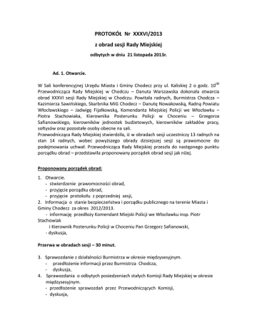 PROTOKÓŁ Nr XXXVI/2013 z obrad sesji Rady Miejskiej odbytych w dniu 21 listopada 2013r. Ad. 1. Otwarcie. W Sali konferencyjnej Urzędu Miasta i Gminy Chodecz przy ul. Kaliskiej 2 o godz. 10 00 Przewodnicząca Rady Miejskiej w Chodczu – Danuta Warszawska dokonała otwarcia obrad XXXVI sesji Rady Miejskiej w Chodczu. Powitała radnych, Burmistrza Chodcza – Kazimierza Sawińskiego, Skarbnika MiG Chodecz – Danutę Nowakowską, Radną Powiatu Włocławskiego – Jadwigę Fijałkowską, Komendanta Miejskiej Policji we Włocławku – Piotra Stachowiaka, Kierownika Posterunku Policji w Choceniu – Grzegorza Safianowskiego, kierowników jednostek budżetowych, kierowników zakładów pracy, sołtysów oraz pozostałe osoby obecne na sali. Przewodnicząca Rady Miejskiej stwierdziła, iż w obradach sesji uczestniczy 13 radnych na stan 14 radnych, wobec powyższego obrady dzisiejszej sesji są prawomocne do podejmowania uchwał. Przewodnicząca Rady Miejskiej przeszła do następnego punktu porządku obrad – przedstawiła proponowany porządek obrad sesji jak niżej. Proponowany porządek obrad: 1. Otwarcie. - stwierdzenie prawomocności obrad, - przyjęcie porządku obrad, - przyjęcie protokołu z poprzedniej sesji, 2. Informacja o stanie bezpieczeństwa i porządku publicznego na terenie Miasta i Gminy Chodecz za okres 2012/2013. - informację przedłoży Komendant Miejski Policji we Włocławku insp. Piotr Stachowiak i Kierownik Posterunku Policji w Choceniu Pan Grzegorz Safianowski, - dyskusja, Przerwa w obradach sesji – 30 minut. 3. Sprawozdanie z działalności Burmistrza w okresie międzysesyjnym. - przedłożenie informacji przez Burmistrza Chodcza, - dyskusja, 4. Sprawozdania o odbytych posiedzeniach stałych Komisji Rady Miejskiej w okresie międzysesyjnym. - przedłożenie sprawozdań przez Przewodniczących Komisji, - dyskusja, 5. Uchwała w sprawie ustalenia wysokości i zasad wypłacenia diety dla Przewodniczącego Rady Miejskiej. - przedłożenie informacji w przedmiotowej sprawie – radni P. Ewa Kwiatkowska i P. Błażej Krupa. - dyskusja, - podjęcie uchwały, 6. Uchwała w sprawie rozpatrzenia skargi złożonej przez Aldonę Pacholczyk na Kierownika Zakładu Gospodarki Komunalnej w Chodczu. - przedłożenie informacji w przedmiotowej sprawie – P. Arkadiusz Koza, - opinia Komisji Rewizyjnej , - dyskusja, - podjęcie uchwały, 7. Uchwała w sprawie nadania nazwy stadionowi miejskiemu piłkarskiemu położonemu w Chodczu przy ulicy Warszawskiej 17. - przedłożenie informacji w przedmiotowej sprawie – P. Jerzy Stempczyński, - opinia Komisji Obywatelskiej i Ochrony Środowiska , - dyskusja, - podjęcie uchwały, 8. Uchwała w sprawie Rocznego programu współpracy Miasta i Gminy Chodecz z organizacjami pozarządowymi oraz podmiotami o których mowa w art. 3 ust. 3 ustawy z dnia 24 kwietnia 2003r. o działalności pożytku publicznego i o wolontariacie na rok 2014. - przedłożenie informacji w przedmiotowej sprawie – P. H. Makowiecka, - opinia Komisji Obywatelskiej i Ochrony Środowiska , - dyskusja, - podjęcie uchwały, 9. Uchwała w sprawie obniżenia ceny skupu żyta do celów wymiaru podatku rolnego. - przedłożenie informacji w przedmiotowej sprawie – P. Skarbnik, - opinia Komisji Budżetu i Finansów oraz Komisji Rolnej i Infrastruktury Technicznej, - dyskusja, - podjęcie uchwały, 10. Uchwała zmieniająca uchwałę w sprawie uchwalenia budżetu Miasta i Gminy Chodecz na rok 2013. - przedłożenie informacji w przedmiotowej sprawie – P. Skarbnik, - opinia Komisji Budżetu i Finansów, - dyskusja, - podjęcie uchwały, 11. Interpelacje i zapytania radnych. 12. Sprawy bieżące i wolne wnioski. 13. Zakończenie obrad sesji. Przewodnicząca Rady Miejskiej – Danuta Warszawska zaproponowała wprowadzenie do porządku obrad projektu uchwały dotyczącej wyrażenia zgody na nabycie nieruchomości położonej w Woli Adamowej. Przewodnicząca poprosiła o przedłożenie informacji Pana Nowakowskiego. Pan Eugeniusz Nowakowski poinformował, iż punkt ten nie był ujęty w programie ze względu na zawirowania prawne wynikające z faktu, że są to 2 nieruchomości. Nieruchomość gruntowa i budynku. Budynek jest własnością spółdzielni mleczarskiej natomiast grunt jest w użytkowaniu wieczystym spółdzielni. Projekt uzyskał opinię prawników zarówno spółdzielni mleczarskiej jak i naszej Pani Mecenas. Jest uzasadnienie, że jednym aktem notarialnym jest możliwe wygaszenie użytkowania wieczystego z jednoczesnym nabyciem nieruchomości czyli budynkiem. Pani Przewodnicząca poddała zmianę do porządku obrad pod głosowanie. Za przyjęciem głosowało 13 radnych, przeciw 0, wstrzymało się 0. Powyższy punkt wszedł na punkt 11. W związku z tym pozostałe punkty zostaną przesunięte. Pani Przewodnicząca poddała pod głosowanie przedstawiony porządek obrad sesji. Za przyjęciem proponowanego porządku było 13 radnych, przeciwnych nie było, wstrzymujących nie było. Porządek obrad XXXVI sesji został przyjęty 13 głosami za. Przewodnicząca Rady przekazała, iż protokół z obrad poprzedniej sesji został sporządzony, był przedłożony do wglądu, każdy zainteresowany miał możliwość zapoznania się z protokołem w Biurze Rady. Protokół został poddany pod głosowanie. Za przyjęciem protokołu Nr XXXV głosowało – 13 radnych, przeciwnych – 0, wstrzymujących się – 0. Protokół z poprzedniej sesji został przyjęty 13 głosami za. Ad. 2. Informacja o stanie bezpieczeństwa i porządku publicznego na terenie Miasta i Gminy Chodecz za okres 2012/2013. Przewodnicząca – Danuta Warszawska udzieliła głosu Panu Piotrowi Stachowiakowi. Komendant Piotr Stachowiak podziękował za zaproszenie i możliwość przedstawienia porządku bezpieczeństwa publicznego, chociaż jest to prowadzone kwartalnie ale taka analiza jest na dzień 21 listopada 2013 roku. Główna ocena będzie po zakończeniu roku danych statystycznych. Rok 201