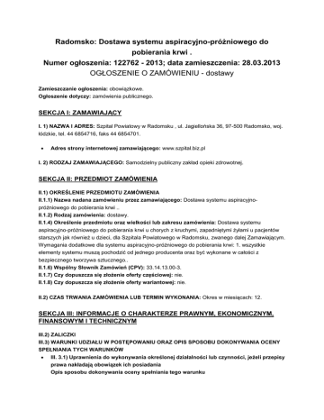 Radomsko: Dostawa systemu aspiracyjno-próżniowego do pobierania krwi . Numer ogłoszenia: 122762 - 2013; data zamieszczenia: 28.03.2013 OGŁOSZENIE O ZAMÓWIENIU - dostawy Zamieszczanie ogłoszenia: obowiązkowe. Ogłoszenie dotyczy: zamówienia publicznego. SEKCJA I: ZAMAWIAJĄCY I. 1) NAZWA I ADRES: Szpital Powiatowy w Radomsku , ul. Jagiellońska 36, 97-500 Radomsko, woj. łódzkie, tel. 44 6854716, faks 44 6854701. Adres strony internetowej zamawiającego: www.szpital.biz.pl I. 2) RODZAJ ZAMAWIAJĄCEGO: Samodzielny publiczny zakład opieki zdrowotnej. SEKCJA II: PRZEDMIOT ZAMÓWIENIA II.1) OKREŚLENIE PRZEDMIOTU ZAMÓWIENIA II.1.1) Nazwa nadana zamówieniu przez zamawiającego: Dostawa systemu aspiracyjnopróżniowego do pobierania krwi .. II.1.2) Rodzaj zamówienia: dostawy. II.1.4) Określenie przedmiotu oraz wielkości lub zakresu zamówienia: Dostawa systemu aspiracyjno-próżniowego do pobierania krwi u chorych z kruchymi, zapadniętymi żyłami u pacjentów starszych jak również u dzieci, dla Szpitala Powiatowego w Radomsku, zwanego dalej Zamawiającym. Wymagania dodatkowe dla systemu aspiracyjno-próżniowego do pobierania krwi: 1. wszystkie elementy systemu muszą pochodzić od jednego producenta oraz być wykonane w całości z bezpiecznego tworzywa sztucznego.. II.1.6) Wspólny Słownik Zamówień (CPV): 33.14.13.00-3. II.1.7) Czy dopuszcza się złożenie oferty częściowej: nie. II.1.8) Czy dopuszcza się złożenie oferty wariantowej: nie. II.2) CZAS TRWANIA ZAMÓWIENIA LUB TERMIN WYKONANIA: Okres w miesiącach: 12. SEKCJA III: INFORMACJE O CHARAKTERZE PRAWNYM, EKONOMICZNYM, FINANSOWYM I TECHNICZNYM III.2) ZALICZKI III.3) WARUNKI UDZIAŁU W POSTĘPOWANIU ORAZ OPIS SPOSOBU DOKONYWANIA OCENY SPEŁNIANIA TYCH WARUNKÓW III. 3.1) Uprawnienia do wykonywania określonej działalności lub czynności, jeżeli przepisy prawa nakładają obowiązek ich posiadania Opis sposobu dokonywania oceny spełniania tego warunku Oryginał lub poświadczona przez Wykonawcę za zgodność z oryginałem kopia aktualnego o odpisu z właściwego rejestru albo zaświadczenie o wpisie do ewidencji działalności gospodarczej, wystawionego nie wcześniej niż 6 miesięcy przed upływem terminu składania ofert. III.3.2) Wiedza i doświadczenie Opis sposobu dokonywania oceny spełniania tego warunku o Na podstawie oświadczenia wg załącznika nr 3 do SIWZ III.3.3) Potencjał techniczny Opis sposobu dokonywania oceny spełniania tego warunku o Na podstawie oświadczenia wg załącznika nr 3 do SIWZ III.3.4) Osoby zdolne do wykonania zamówienia Opis sposobu dokonywania oceny spełniania tego warunku o Na podstawie oświadczenia wg załącznika nr 3 do SIWZ III.3.5) Sytuacja ekonomiczna i finansowa Opis sposobu dokonywania oceny spełniania tego warunku o Na podstawie oświadczenia wg załącznika nr 3 do SIWZ III.4) INFORMACJA O OŚWIADCZENIACH LUB DOKUMENTACH, JAKIE MAJĄ DOSTARCZYĆ WYKONAWCY W CELU POTWIERDZENIA SPEŁNIANIA WARUNKÓW UDZIAŁU W POSTĘPOWANIU ORAZ NIEPODLEGANIA WYKLUCZENIU NA PODSTAWIE ART. 24 UST. 1 USTAWY III.4.1) W zakresie wykazania spełniania przez wykonawcę warunków, o których mowa w art. 22 ust. 1 ustawy, oprócz oświadczenia o spełnianiu warunków udziału w postępowaniu należy przedłożyć: potwierdzenie posiadania uprawnień do wykonywania określonej działalności lub czynności, jeżeli przepisy prawa nakładają obowiązek ich posiadania, w szczególności koncesje, zezwolenia lub licencje; III.4.2) W zakresie potwierdzenia niepodlegania wykluczeniu na podstawie art. 24 ust. 1 ustawy, należy przedłożyć: oświadczenie o braku podstaw do wykluczenia; aktualny odpis z właściwego rejestru lub z centralnej ewidencji i informacji o działalności gospodarczej, jeżeli odrębne przepisy wymagają wpisu do rejestru lub ewidencji, w celu wykazania braku podstaw do wykluczenia w oparciu o art. 24 ust. 1 pkt 2 ustawy, wystawiony nie wcześniej niż 6 miesięcy przed upływem terminu składania wniosków o dopuszczenie do udziału w postępowaniu o udzielenie zamówienia albo składania ofert; III.4.3) Dokumenty podmiotów zagranicznych Jeżeli wykonawca ma siedzibę lub miejsce zamieszkania poza terytorium Rzeczypospolitej Polskiej, przedkłada: III.4.3.1) dokument wystawiony w kraju, w którym ma siedzibę lub miejsce zamieszkania potwierdzający, że: nie otwarto jego likwidacji ani nie ogłoszono upadłości - wystawiony nie wcześniej niż 6 miesięcy przed upływem terminu składania wniosków o dopuszczenie do udziału w postępowaniu o udzielenie zamówienia albo składania ofert; nie orzeczono wobec niego zakazu ubiegania się o zamówienie - wystawiony nie wcześniej niż 6 miesięcy przed upływem terminu składania wniosków o dopuszczenie do udziału w postępowaniu o udzielenie zamówienia albo składania ofert; III.5) INFORMACJA O DOKUMENTACH POTWIERDZAJĄCYCH, ŻE OFEROWANE DOSTAWY, USŁUGI LUB ROBOTY BUDOWLANE ODPOWIADAJĄ OKREŚLONYM WYMAGANIOM W zakresie potwierdzenia, że oferowane roboty budowlane, dostawy lub usługi odpowiadają określonym wymaganiom należy przedłożyć: próbki, opisy lub fotografie produktów, które mają zostać dostarczone, których autentyczność musi zostać poświadczona przez wykonawcę na żądanie zamawiającego; III.6) INNE DOKUMENTY Inne dokumenty niewymienione w pkt III.4) albo w pkt III.5) 1.Wypełniony Formularz cenowy- załącznik nr 1 2. Formularz ofertowy załącznik nr 2 3.Zaakceptowany Projekt umowy 4.Dokumenty potwierdzające wymagane parametry przedmiotu zamówienia. SEKCJA IV: PROCEDURA IV.1) TRYB UDZIELENIA ZAMÓWIENIA IV.1.1) Tryb udzielenia zamówienia: przetarg nieograniczony. IV.2) KRYTERIA OCENY OFERT IV.2.1) Kryteria oceny ofert: najniższa cena. IV.3) ZMIANA UMOWY przewiduje się istotne zmiany postanowień zawartej umowy w stosunku do treści oferty, na podstawie której dokonano wyboru wykonawcy: Dopuszczalne zmiany postanowień umowy oraz określenie warunków zmian Zamawiający dz