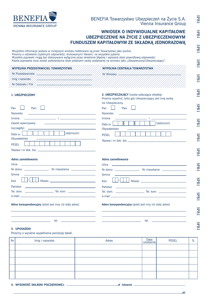 ROYAL P0LSKA TOWARZYSTWO UBEZPIECZE¡ NA ˚YCIE SA PESEL PESEL PESEL PESEL SPB (d/m/r/) SPB1 (d/m/r/) SPB1 ……………………………………………………………………………………………………………………………………………………………z∏) Nazwisko Nazwisko 4. WYSOKOÂå SK¸ADKI POCZÑTKOWEJ: ………………………………………………z∏ (s∏ownie ……………………………………………… ……………………………………………………………………………………………………………………………………………………………z∏) / / Imiona Imiona 4. WYSOKOÂå WYSOKOÂå SK¸ADKI SK¸ADKI POCZÑTKOWEJ: POCZÑTKOWEJ: ………………………………………………z∏ ………………………………………………z∏ (s∏ownie (s∏ownie ……………………………………………… ……………………………………………… 4. ……………………………………………………………………………………………………………………………………………………………z∏) Stan cywilny Stan cywilny 4. WYSOKOÂå SK¸ADKI POCZÑTKOWEJ: ………………………………………………z∏ (s∏ownie ……………………………………………… 4. WYSOKOÂå SK¸ADKI POCZÑTKOWEJ: ………………………………………………z∏ (s∏ownie ……………………………………………… ……………………………………………………………………………………………………………………………………………………………z∏) Zawód wykonywany Zawód wykonywany ……………………………………………………………………………………………………………………………………………………………z∏) ……………………………………………………………………………………………………………………………………………………………z∏) ……………………………………………………………………………………………………………………………………………………………z∏) (szczegó∏y) (szczegó∏y) % % % % SPB1 2. UBEZPIECZAJÑCY (osoba op∏acajàca sk∏adk´) Prosimy wype∏niaç, tylko gdy Ubezpieczajàcy jest innà osobà 4. WYSOKOÂå SK¸ADKI POCZÑTKOWEJ: ………………………………………………z∏ (s∏ownie ……………………………………………… ni˝ Ubezpieczony. 4. WYSOKOÂå SK¸ADKI POCZÑTKOWEJ: ………………………………………………z∏ (s∏ownie ……………………………………………… ……………………………………………………………………………………………………………………………………………………………z∏) PanWYSOKOÂå Pani Pan Pani 4. SK¸ADKI POCZÑTKOWEJ: ………………………………………………z∏ (s∏ownie ……………………………………………… 1. UBEZPIECZONY % SPB1 Adres Adres % % SPB1 Nr Oddzia∏u / Filii Adres Nr Adres Wniosku urodzenia Data Data urodzenia urodzenia Data Data urodzenia urodzenia SPB1 Prosimy Prosimy o o wyraêne wyraêne wype∏nienie wype∏nienie poni˝szej poni˝szej tabeli. tabeli. Nr PrzedstawicielaImi´ i nazwisko Nr Nr Imi´ i nazwisko Nr Imi´ i nazwisko Imi´ Nr Imi´ ii nazwisko nazwisko % SPB1 Wszystkie informacje podane w niniejszym wniosku traktowane sà przez Towarzystwo jako poufne. WNIOSEK O INDYWIDUALNE KAPITA¸OWE UBEZPIECZENIE NA ˚YCIE Z UBEZPIECZENIOWYM FUNDUSZEM KAPITA¸OWYM ZE SK¸ADKÑ JEDNORAZOWÑ WNIOSEK Prosimy o udzielenie czytelnych odpowiedzi, drukowanymi literami, na wszystkie pytania. O INDYWIDUALNE KAPITA¸OWE WNIOSEK O INDYWIDUALNE KAPITA¸OWE Wszystkie informacje podane w niniejszym wniosku traktowane sà przez Towarzystwo jako poufne. WNIOSEK O prawid∏owej INDYWIDUALNE KAPITA¸OWE UBEZPIECZENIE NA ˚YCIE Zodpowiedzi. UBEZPIECZENIOWYM Wszelkie poprawki mogà byç dokonywane wy∏àcznie przez skreÊlenie b∏´dnej i wpisanie obok FUNDUSZEM KAPITA¸OWYM ZE SK¸ADKÑ JEDNORAZOWÑ UBEZPIECZENIE NA ˚YCIE Z UBEZPIECZENIOWYM Prosimy o udzielenie odpowiedzi,wniosku drukowanymi literami, na wszystkie pytania. Wszystkie informacje podane niniejszym traktowane sàpodpisanej przez Towarzystwo jako poufne. Ka˝da poprawka musiczytelnych zostaç w potwierdzona obok podpisem osoby na wniosku jako „Ubezpieczony”. UBEZPIECZENIE NA ˚YCIE Z UBEZPIECZENIOWYM UBEZPIECZENIE NA ˚YCIE Z UBEZPIECZENIOWYM Wszelkie poprawki mogà byç dokonywane wy∏àcznie przez skreÊlenie b∏´dnej i wpisanie obok prawid∏owej odpowiedzi. FUNDUSZEM KAPITA¸OWYM ZE SK¸ADKÑ SK¸ADKÑ JEDNORAZOWÑ JEDNORAZOWÑ FUNDUSZEM ZE Prosimy o udzielenie czytelnych odpowiedzi, drukowanymi literami, naKAPITA¸OWYM wszystkie pytania. Wszystkie informacje podane w niniejszym wy∏àcznie wniosku traktowane sàpodpisanej przez Towarzystwo jako poufne. Ka˝da poprawka musi zostaç potwierdzona obokFUNDUSZEM podpisem osoby nawpisanie wniosku jako „Ubezpieczony”. KAPITA¸OWYM ZE SK¸ADKÑ JEDNORAZOWÑ Wszelkie poprawki mogà byç dokonywane przez skreÊlenie b∏´dnej i obok prawid∏owej odpowiedzi. FUNDUSZEM KAPITA¸OWYM ZE SK¸ADKÑ WYPE¸NIA PRZEDSTAWICIEL TOWARZYSTWA WYPE¸NIA CENTRALA TOWARZYSTWA JEDNORAZOWÑ Prosimy o udzielenie czytelnych odpowiedzi, drukowanymi literami, na wszystkie pytania. Ka˝da poprawka musi zostaç potwierdzona obok podpisem osoby podpisanej na wniosku jako „Ubezpieczony”. Wszystkie informacje podane w niniejszym wniosku traktowane sà przez Towarzystwo jako poufne. Wszystkie informacje podane w niniejszym wy∏àcznie wniosku traktowane sà przez Towarzystwo jako poufne. Wszelkie poprawki mogà byç dokonywane przez skreÊlenie b∏´dnej i wpisanie obok prawid∏owej odpowie