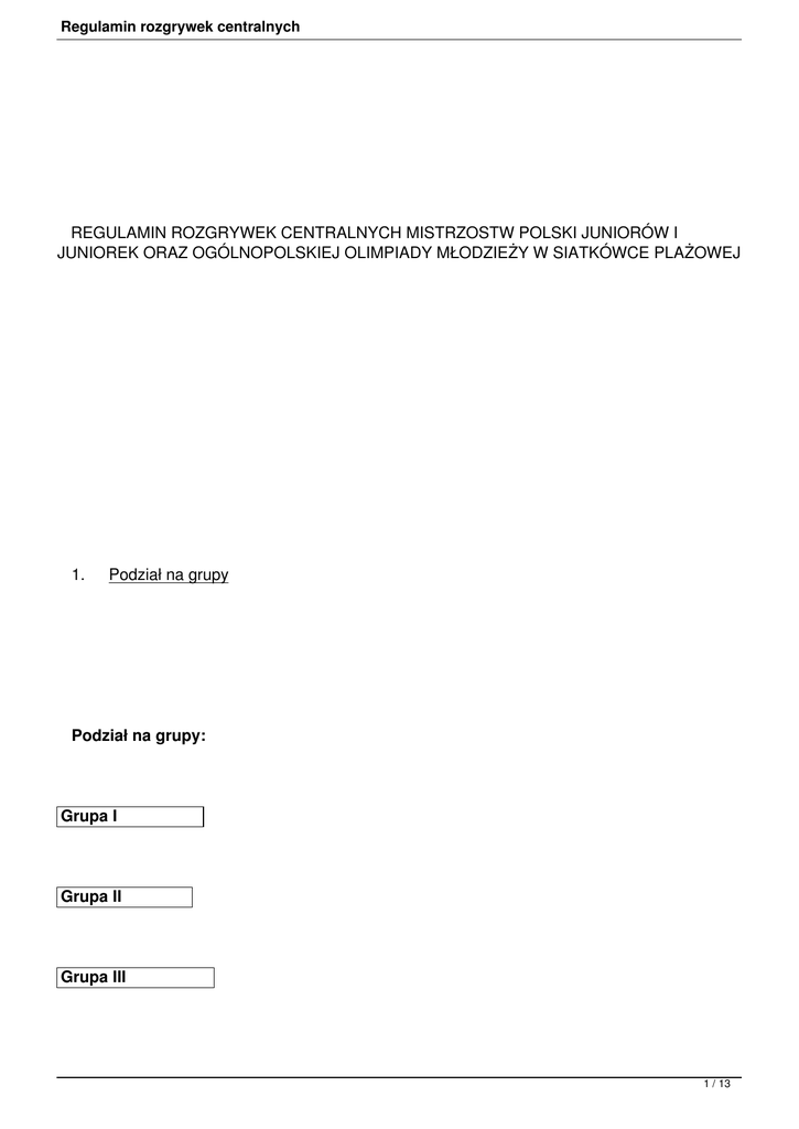 Regulamin rozgrywek centralnych REGULAMIN ROZGRYWEK CENTRALNYCH MISTRZOSTW POLSKI JUNIORÓW I JUNIOREK ORAZ OGÓLNOPOLSKIEJ OLIMPIADY MŁODZIEŻY W SIATKÓWCE PLAŻOWEJ 1. Podział na grupy Podział na grupy: Grupa I Grupa II Grupa III 1 / 13 Regulamin rozgrywek centralnych Grupa IV ŁÓDZKIE MAZOWIECKIE POMORSKIE LUBUSKIE ŚWIĘTOKRZYSKIE LUBELSKIE ZACHODNIOPOMORSKIE DOLNOŚLĄSKIE MAŁOPOLSKIE PODLASKIE 2 / 13 Regulamin rozgrywek centralnych WARMIŃSKO - MAZ. WIELKOPOLSKIE ŚLĄSKIE PODKARPACKIE KUJAWSKO-POMORSKIE OPOLSKIE UWAGA!!! Półfinały Juniora/ki oraz Kadeta/ki muszą być rozegrane w ciągu 2 dni w terminach wyznaczonych przez Polski związek Piłki Siatkowej i ogłoszone w odrębnych komunikatach. 3 / 13 Regulamin rozgrywek centralnych 2. Warunki uczestnictwa: W zawodach OOM mogą brać udział zawodniczki i zawodnicy: · Posiadający ważną na dany sezon licencję siatkówki plażowej WZPS (licencja PZPS nie uprawnia do udziału w rozgrywkach młodzieżowych do lat 19) · aktualne badania lekarskie (zgodnie z ustawą o sporcie z dnia 25 czerwca 2010) · inny dokument potwierdzający tożsamość 3. Najważniejsze zasady: · drużyny składają się z 2 osobowego zespołu (bez możliwości zmiany z zawodnikami/-czkami rezerwowymi) plus jeden trener. 4 / 13 Regulamin rozgrywek centralnych · Zawodnicy / -czki tworzący zespół muszą być członkami tego samego klubu (minimum od rundy centralnej – tj. półfinałowej). · W przypadku udokumentowanej kontuzji zawodnika/zawodniczki lub innej wyjątkowej sytuacji uniemożliwiającej udział jednego z zawodników/-czek, dopuszcza się za zgodą Wydziału Siatkówki Plażowej zmianę. Nowy zawodnik/ -czka musi pochodzić z województwa, które wystawiło daną parę do rozgrywek tzn. które dana para reprezentuje), ale przynajmniej jeden zawodnik / -czka z drużyny muszą być uczestnikiem zawodów od rundy ćwierćfinałowej (wojewódzkiej) · Zawodnik /-czka raz zgłoszony/-a w danym klubie/województwie nie może zostać zgłoszony/-a ponownie z innym zawodnikiem /-czką w nowym klubie/województwie. · Zawodnik -/czka który/-a został/-a zgłoszony/-a jako kontuzjowany/-a nie może już wziąć udziału do końca rozgrywek. · Wydział Siatkówki Plażowej uprzejmie informuje, iż zezwala na łączenie zawodników/zawodniczek z różnych województw w celu stworzenia nowej drużyny reprezentującej jedno z tych województw we wszystkich rozgrywkach młodzieżowych. (pod warunkiem, iż wypożyczenie nastąpi najpóźniej po rundzie wojewódzkiej a przed zgłoszeniem do rozgrywek półfinałowych) · Warunkiem dopuszczenia jest pisemna zgoda klubu oraz w przypadku zmiany województwa pisemna zgoda odpowiedniego Wojewódzkiego Związku Piłki Siatkowej. · Uprasza się kluby piłki siatkowej o bezpłatne wypożyczanie zawodników/zawodniczek do klubów zajmujących się szkoleniem i udziałem w rozgrywkach siatkówki plażowej, a WZPS-y o nie pobieranie opłat z tego tytułu. 5 / 13 Regulamin rozgrywek centralnych · Wypożyczenie zawodników/-czek musi nastąpić od początku rozgrywek na szczeblu centralnym, w których dany zawodnik/-czka będzie brał/-a udział. Nie można wypożyczać zawodników/-czek na sam finał. · W przypadku kontuzji obu zawodników/-czek, do dalszych gier awansuje następny zespół. Zespołu nie można uzupełnić w momencie rozpoczęcia turnieju. · Licencje siatkówki plażowej wydają WZPS-y i upoważniają one do grania we wszystkich rozgrywkach młodzieżowych. · WZPS-y mają obowiązek w ciągu 24 godzin powiadomić organizatora półfinałów i PZPS o wynikach eliminacji wojewódzkich i tym samym dokonać potwierdzenia zgłoszenia (komunikat końcowy należy przesłać faxem) · Organizator półfinałów ma obowiązek w ciągu 24 godzin powiadomić PZPS o wynikach (komunikat końcowy należy przesłać faxem) · Organizatorzy półfinałów i finałów mają obowiązek powiadomić PZPS o godzinie rozpoczęcia i miejscu zawodów; obsadę sędziowską deleguje PZPS, a opłaca organizator. · Ubiór zawodnika powinien być zgodny z przepisami, w przeciwnym razie sędzia może nie dopuścić do rozgrywek. Jeżeli organizator ma sponsora, zawodnicy mają obowiązek wystąpić w przepisowych koszulkach organizatora. 6 / 13 Regulamin rozgrywek centralnych Zespoły pokrywają koszty: · na półfinałach: koszty dojazdu, zakwaterowania i wyżywienia · w finałach OOM: koszty dojazdu, w finałach MP Jun.- koszty jak na półfinałach. 4. System rozgrywek: 1. System rywalizacji o Mistrzostwo Polski jest 3-stopniowy: 1. Mistrzostwa województw organizowane przez Wojewódzkie Związki Piłki Siatkowej – z każdego województwa do rozgrywek centralnych awansują 4 najlepsze zespoły (w OOM) i 4 najlepsze zespoły ( w MP Jun.) 2. Półfinały – turniej dla 16 zespołów ( w OOM i w MP Jun.- 2 dni) rozegrany systemem podwójnych eliminacji („brazylijski”). Rozgrywane są cztery turnieje; w każdym grają przedstawiciele czterech województw zgodnie z podziałem przyjętym przez PZPS. Z każdego turnieju półfinałowego do finału awansują 4 najlepsze zespoły. 3. Finał rozgrywany jest przez 16 zespołów w dwa dni systemem brazylijskim na 16 zespołów. 7 / 13 Regulamin rozgrywek centralnych Punktacja za miejsca finałowe OOM wg Polskiej Federacji Sportu Młodzieżowego: Lok. 1 2 3 4 5 6 7 8 9-12 8 / 13 Regulamin rozgrywek centralnych 13-16 17-24 25-32 Pkt. 24 20 16 12 10 9 8 7 9 / 13 Regulamin rozgrywek centralnych 5 3 2 1 Razem: 162 Punktacja za miejsca finałowe MP Jun. wg Polskiej Federacji Sportu Młodzieżowego: Lok. 1 2 3 10 / 13 Regulamin rozgrywek centralnych 4 5 6 7 8 9-12 13-16 17-32 Pkt. 30 26 22 11 / 13 Regulamin rozgrywek centralnych 18 16 14 12 10 8 6 2 Razem: 236 12 / 13 Regulamin rozgrywek centralnych Zawodnicy i zawodniczki startujący w obu kategoriach wiekowych, w punktacji współzawodnictwa dzieci i młodzieży otrzymują punkty tylko w jednej, właściwej dla swojej