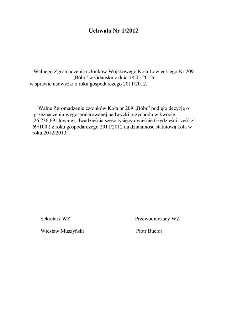 Uchwała Nr 1/2012 - Wojskowe Koło Łowieckie nr 209 BÓBR