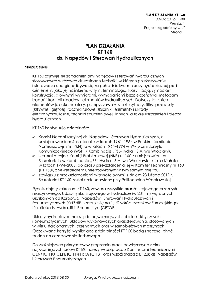 PLAN DZIAŁANIA KT 160 DATA: 2012-11-30 Wersja: 1 Projekt uzgodniony w KT Strona 1 PLAN DZIAŁANIA KT 160 ds. Napędów i Sterowań Hydraulicznych STRESZCZENIE KT 160 zajmuje się zagadnieniami napędów i sterowań hydraulicznych, stosowanych w różnych dziedzinach techniki, w których przekazywanie i sterowanie energią odbywa się za pośrednictwem cieczy hydraulicznej pod ciśnieniem, jako jej nośnikiem, w tym: terminologią, klasyfikacją, symbolami, konstrukcją, głównymi wymiarami, wymaganiami bezpieczeństwa, metodami badań i kontroli układów i elementów hydraulicznych. Dotyczy to takich elementów jak akumulatory, pompy, zawory, silniki, cylindry, filtry, przewody (sztywne i giętkie), łączniki rurowe, zbiorniki, elementy i układy elektrohydrauliczne, techniki strumieniowej i innych, a także uszczelnień i cieczy hydraulicznych. KT 160 kontynuuje działalność: • • • Komisji Normalizacyjnej ds. Napędów i Sterowań Hydraulicznych, z umiejscowieniem Sekretariatu w latach 1961–1964 w Polskim Komitecie Normalizacyjnym (PKN), a w latach 1964–1994 w Wytwórni Sprzętu Komunikacyjnego (WSK) / Kombinacie „PZL-Hydral” S.A. we Wrocławiu, Normalizacyjnej Komisji Problemowej (NKP) nr 160 z umiejscowieniem Sekretariatu w Kombinacie „PZL-Hydral” S.A. we Wrocławiu, która działała w latach 1994–2003, do czasu przekształcenia jej w Komitet Techniczny nr 160 (KT 160), z Sekretariatem umiejscowionym w tym samym miejscu, z związku z przekształceniami własnościowymi, z dniem 23 lutego 2011 r. Sekretariat KT 160 został umiejscowiony przy Politechnice Wrocławskiej. Rynek, objęty zakresem KT 160, zawiera wszystkie branże krajowego przemysłu maszynowego. Udział rynku krajowego w hydraulice (w 2011 r.) wg danych uzyskanych od Korporacji Napędów i Sterowań Hydraulicznych i Pneumatycznych (KNiSHiP) szacuje się na 1,1% wśród członków Europejskiego Komitetu ds. Hydrauliki i Pneumatyki (CETOP). Układy hydrauliczne należą do najważniejszych, obok elektrycznych i pneumatycznych, układów wykonawczych oraz sterowania, stosowanych w wielu stacjonarnych, przenośnych oraz w samobieżnych maszynach. Oczekiwane korzyści wynikające z działalności KT 160 będą znaczne, choć trudne do oszacowania liczbowego. Do ważniejszych priorytetów w programie prac i powiązanych z nimi najważniejszych celów KT160 należy współpraca z Komitetami Technicznymi CEN/TC 110, CEN/TC 114 i ISO/TC 131 oraz współpraca z KT 208 ds. Napędów i Sterowań Pneumatycznych. Data wydruku: 2013-08-30 Uwaga: Wydruk poza nadzorem PLAN DZIAŁANIA KT 160 DATA: 2012-11-30 Wersja: 1 Projekt uzgodniony w KT Strona 2 1 ŚRODOWISKO BIZNESOWE KT 1.1 Opis środowiska biznesowego Na działalność gospodarczą objętą zakresem KT znaczący wpływ mają następujące uwarunkowania polityczne, gospodarcze, techniczne, prawne, społeczne i aspekty regionalne oraz międzynarodowe. Na początku lat sześćdziesiątych ubiegłego stulecia nastąpił gwałtowny wzrost zapotrzebowania na hydrauliczne układy napędowe i sterujące w różnych dziedzinach techniki. Przemysł oraz ośrodki projektowo-konstrukcyjne musiały sprostać temu wyzwaniu, jednak powstające wówczas rozwiązania konstrukcyjne elementów i układów hydraulicznych nie były zamienne, co powodowało utrudnienia w wymianie towarowej. Mając to na uwadze, coraz częściej w pracach konstrukcyjnych zaczęto stosować metody normalizacyjne, początkowo w skali zakładów i biur projektowo-konstrukcyjnych, potem na szczeblu krajowym i regionalnym, a w końcu na szczeblu międzynarodowym. W tej sytuacji na szczeblu krajowym w 1961 r. Prezes Polskiego Komitetu Normalizacyjnego (PKN) powołał Komisję Normalizacyjną ds. Napędów i Sterowań Hydraulicznych z umiejscowieniem Sekretariatu w PKN, której działalność kontynuowały Komisje Normalizacyjne, działające w latach 1964–1994 w Wytwórni Sprzętu Komunikacyjnego (WSK) / Kombinacie „PZL-Hydral” S.A. we Wrocławiu. Komisje, a następnie Komitet, prowadziły działalność normalizacyjną w dziedzinie napędów i sterowań hydraulicznych, wynikającą z udziału w krajowych, regionalnych i międzynarodowych organizacjach normalizacyjnych przez programowanie i planowanie prac normalizacyjnych, opracowywanie, opiniowanie i uzgadnianie projektów norm oraz koordynację tych prac. Na szczeblu regionalnym-europejskim: • • 15 czerwca 1962 r. w Sztokholmie utworzono Europejski Komitet ds. Hydrauliki i Pneumatyki CETOP, skupiający krajowe stowarzyszenia zajmujące się zagadnieniami hydrauliki i pneumatyki napędowej. W 1974 r. w Brukseli utworzono Europejski Komitet Normalizacyjny CEN – regionalne stowarzyszenie europejskie, prowadzące działalność obejmującą różne dziedziny techniki, w tym z zakresu KT 160. Na szczeblu międzynarodowym 25 lipca 1969 r. Zgromadzenie Ogólne Międzynarodowej Organizacji Normalizacyjnej ISO powołało Komitet Techniczny ISO/TC 131 Fluid Power Systems, zajmujący się normalizacją napędów płynowych, z umiejscowieniem Sekretariatu w American National Standards Insitute (ANSI). Polska, będąca członkiem założycielem Komitetu, jest jego czynnym członkiem (P). KT 160 jest komitetem wiodącym w zakresie współpracy z Komitetem ISO/TC 131. Współpracę tę prowadziły i nadal prowadzą wymienione w streszczeniu Komisje Data wydruku: 2013-08-30 Uwaga: Wydruk poza nadzorem PLAN DZIAŁANIA KT 160 DATA: 2012-11-30 Wersja: 1 Projekt uzgodniony w KT Strona 3 Normalizacyjne (KN), Normalizacyjne Komisje Problemowe (NKP) oraz kontynuujący ich działalność Komitet Techniczny KT 160. Na szczeblu krajowym, ustanowione normy regionalne, w tym nieistniejącej już RWPG, jak i międzynarodowe ISO, były systematycznie wprowadzane do norm krajowych początkowo metodą kompilacji lub przepracowania na układ Polskich Norm, a po wejściu w życie ustawy z dnia 3 kwietnia 1993 r. o normalizacji, metodą tłumaczenia. Według stanu na 30