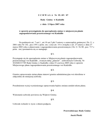 UCHWA A Nr IX /49 / 07 Rady Gminy w Kadzidle z dnia 13 lipca 2007 roku w sprawie przyst pienia do sporz dzenia zmian w miejscowym planie zagospodarowania przestrzennego wsi Kadzid o Na podstawie art. 7 ust.1 , art.18 ust.2 pkt 5 ustawy o samorz dzie gminnym ( Dz. U. z 2001 roku Nr 142 , poz.1591 z pó n. zm. ) oraz art. 14 w zwi zku z art. 27 ustawy z dnia 27 marca 2003 roku o planowaniu i zagospodarowaniu przestrzennym ( Dz. U. Nr 80 , poz. 717 z pó n. zm.) postanawia si co nast puje: § 1. Przyst puje si do sporz dzenia zmian w Miejscowym planie zagospodarowania przestrzennego wsi Kadzid o , zwanym dalej „planem” , uchwalonym Uchwa Nr XXXIII/217/05 Rady Gminy w Kadzidle z dnia 23 czerwca 2005 roku w sprawie Miejscowego planu zagospodarowania przestrzennego wsi Kadzid o. § 2. Granice opracowania zmian planu stanowi granica administracyjna wsi okre lona w za czniku do niniejszej uchwa y. § 3. Przedmiotem wy ej wymienionego opracowania b dzie zmiana ustale tekstu planu. § 4. Wykonanie uchwa y powierza si Wójtowi Gminy. § 5. Uchwa a wchodzi w ycie z dniem podj cia. Przewodnicz cy Rady Gminy Jacek P oski Analiza zasadno ci przyst pienia do sporz dzenia zmiany tekstu planu miejscowego zagospodarowania przestrzennego i stopnia zgodno ci przewidywanych rozwi za z ustaleniami studium Podstaw prawn przeprowadzenia analizy zasadno ci przyst pienia do sporz dzenia zmiany tekstu „ Miejscowego planu zagospodarowania przestrzennego wsi Kadzid o” oraz dokonania oceny stopnia zgodno ci przewidywanych rozwi za planu z ustaleniami „ Studium uwarunkowa i kierunków zagospodarowania przestrzennego gminy Kadzid o” stanowi ustawa z dnia 27 marca 2003 roku o planowaniu i zagospodarowaniu przestrzennym ( Dz.U. Nr 80 , poz.717 z pó n. zm.) . Zgodnie z art.14 ust.5 tej e ustawy przed podj ciem uchwa y w sprawie przyst pienia do sporz dzenia zmian planu „ wójt wykonuje analizy dotycz ce zasadno ci przyst pienia do sporz dzenia planu i stopnia zgodno ci przewidywanych rozwi za z ustaleniami studium”. Po prawie dwóch latach obowi zywania ustale miejscowego planu zagospodarowania przestrzennego przyj tego Uchwa Nr XXXIII/217/05 Rady Gminy w Kadzidle z dnia 23 czerwca 2005 roku po wnikliwej analizie i zgodno ci z ustaleniami Studium uwarunkowa i kierunków zagospodarowania przestrzennego Gminy Kadzid o uchwalonego Uchwa Nr XIX/172/2000 Rady Gminy Kadzid o z dnia 29 listopada 2000 roku , Rada Gminy w Kadzidle postanowi a podj uchwa o przyst pieniu do zmiany tekstu powy szego planu . Dotychczasowe zapisy tekstu planu np. w zakresie katów nachylenia dachu , pokrycia dachu , lokalizacji budynku wzgl dem drogi stoj na przeszkodzie w realizacji wielu inwestycji . Zasadne jest przyst pienie do sporz dzenia zmiany przedmiotowego planu , poniewa umo liwi ona realizacj inwestycji w zgodzie z uwarunkowaniami zwi zanymi ze specyfik terenu wsi . Zmiana tekstu planu nie spowoduje naruszenia podstawowych zasad adu przestrzennego. Rozwi zania przyj te w zmianie tekstu miejscowego planu zagospodarowania przestrzennego wsi Kadzid o b uwzgl dnia ochron walorów przyrodniczych obszaru , zachowuj c zasad zrównowa onego rozwoju wobec uwarunkowa rodowiska . Kadzid o , dnia 11 lipca 2007 roku