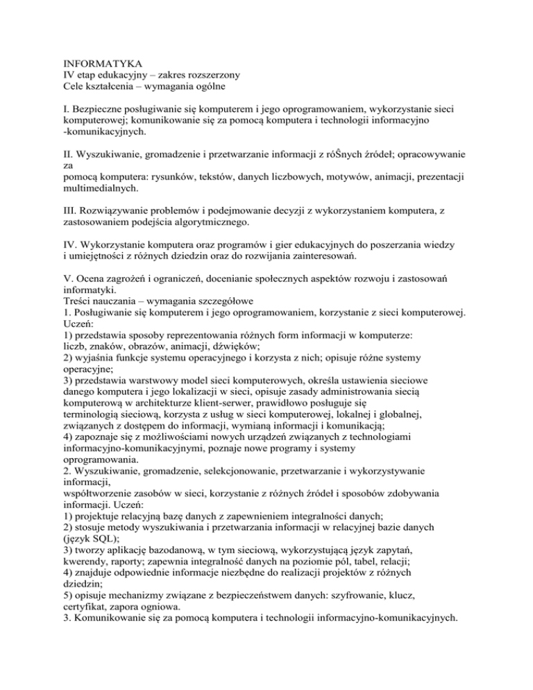 INFORMATYKA IV etap edukacyjny – zakres rozszerzony Cele