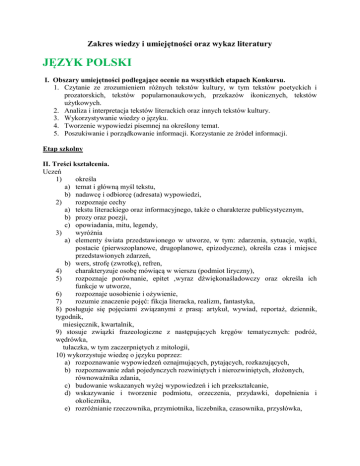 Zakres wiedzy i umiejętności oraz wykaz literatury JĘZYK POLSKI I. Obszary umiejętności podlegające ocenie na wszystkich etapach Konkursu. 1. Czytanie ze zrozumieniem różnych tekstów kultury, w tym tekstów poetyckich i prozatorskich, tekstów popularnonaukowych, przekazów ikonicznych, tekstów użytkowych. 2. Analiza i interpretacja tekstów literackich oraz innych tekstów kultury. 3. Wykorzystywanie wiedzy o języku. 4. Tworzenie wypowiedzi pisemnej na określony temat. 5. Poszukiwanie i porządkowanie informacji. Korzystanie ze źródeł informacji. Etap szkolny II. Treści kształcenia. Uczeń 1) określa a) temat i główną myśl tekstu, b) nadawcę i odbiorcę (adresata) wypowiedzi, 2) rozpoznaje cechy a) tekstu literackiego oraz informacyjnego, także o charakterze publicystycznym, b) prozy oraz poezji, c) opowiadania, mitu, legendy, 3) wyróżnia a) elementy świata przedstawionego w utworze, w tym: zdarzenia, sytuacje, wątki, postacie (pierwszoplanowe, drugoplanowe, epizodyczne), określa czas i miejsce przedstawionych zdarzeń, b) wers, strofę (zwrotkę), refren, 4) charakteryzuje osobę mówiącą w wierszu (podmiot liryczny), 5) rozpoznaje porównanie, epitet ,wyraz dźwiękonaśladowczy oraz określa ich funkcje w utworze, 6) rozpoznaje uosobienie i ożywienie, 7) rozumie znaczenie pojęć: fikcja literacka, realizm, fantastyka, 8) posługuje się pojęciami związanymi z prasą: artykuł, wywiad, reportaż, dziennik, tygodnik, miesięcznik, kwartalnik, 9) stosuje związki frazeologiczne z następujących kręgów tematycznych: podróż, wędrówka, tułaczka, w tym zaczerpniętych z mitologii, 10) wykorzystuje wiedzę o języku poprzez: a) rozpoznawanie wypowiedzeń oznajmujących, pytających, rozkazujących, b) rozpoznawanie zdań pojedynczych rozwiniętych i nierozwiniętych, złożonych, równoważnika zdania, c) budowanie wskazanych wyżej wypowiedzeń i ich przekształcanie, d) wskazywanie i tworzenie podmiotu, orzeczenia, przydawki, dopełnienia i okolicznika, e) rozróżnianie rzeczownika, przymiotnika, liczebnika, czasownika, przysłówka, f) określanie form przypadków, liczb, czasów, osób, trybów i rodzajów gramatycznych, g) stosowanie poprawnych form gramatycznych wyrazów odmiennych, h) rozpoznawanie i poprawne stosowanie w tekście czasowników w trybach: orzekającym, przypuszczającym, rozkazującym, 11) tworzy wypowiedź pisemną w następujących formach gatunkowych: a) opowiadanie, b) opis przedmiotu, opis postaci, c) ogłoszenie, zawiadomienie, d) zaproszenie, e) sprawozdanie, f) list prywatny, g) pamiętnik, dziennik, 12) sporządza plan ramowy oraz szczegółowy, 13) zna i stosuje zasady ortografii i interpunkcji, 14) wykorzystuje wiedzę na temat budowy i zastosowania słowników: ortograficznego, języka polskiego, frazeologicznego, encyklopedii oraz wyszukiwania informacji w Internecie. III. Literatura. 1. Podręczniki do języka polskiego ustalone na II etap edukacyjny lub inne dostępne źródła. 2. Ch. Dickens, Opowieść wigilijna, Poznań, 2006. 3. J. Parandowski , Przygody Odyseusza, Warszawa, 2008. Uwaga! Miejsce i rok wydania podanych wyżej pozycji literackich mogą być inne. Etap rejonowy II. Treści kształcenia. Obowiązują treści kształcenia z etapu szkolnego. Ponadto uczeń 1) określa narratora i narrację (pierwszo- i trzecioosobową), 2) rozpoznaje cechy gatunkowe powieści przygodowej, obyczajowej, młodzieżowej, 3) wyróżnia a) rodzaje rymów: męskie, żeńskie, parzyste/sąsiadujące, okalające, krzyżowe, b) przysłowie, złotą myśl, sentencję, aforyzm, 4) rozpoznaje przenośnię i określa jej funkcję w utworze, 5) posługuje się pojęciami związanymi z teatrem: gra aktorska, reżyseria, dekoracja, charakteryzacja, kostiumy, rekwizyty, 6) stosuje związki frazeologiczne z następujących kręgów tematycznych: rodzina, dziecko, zdrowie, przyjaźń, dom, 7) wykorzystuje wiedzę o języku poprzez a) stopniowanie przymiotników i przysłówków, b) rozpoznawanie zaimka, spójnika, przyimka i ich stosowanie w tekstach, c) rozpoznawanie rodzajów podmiotów i orzeczeń, d) określanie roli podmiotu i orzeczenia, e) dokonywanie analizy słowotwórczej wyrazów – wskazywanie podstawy słowotwórczej i formantu, f) określanie funkcji formantów, w tym tworzenie zdrobnień i zgrubień, g) rozróżnianie oraz budowanie zdań złożonych współrzędnie i podrzędnie, 8) tworzy wypowiedź pisemną w następujących formach gatunkowych: a) opowiadanie z dialogiem odtwórcze i twórcze, b) list oficjalny, c) opis postaci z elementami charakterystyki, d) opowiadanie z elementami opisu uczuć i przeżyć wewnętrznych, 9) zna i stosuje zasady ortografii i interpunkcji, 10) wykorzystuje wiedzę na temat budowy i zastosowania słownika wyrazów obcych oraz słownika wyrazów bliskoznacznych. III. Literatura. 1. Podręczniki do języka polskiego ustalone na II etap edukacyjny lub inne dostępne źródła. 2. F. Molnár , Chłopcy z Placu Broni, Warszawa, 2008. 3. K. Pranić, Ela-Sanela, Warszawa, 2011. Uwaga! Miejsce i rok wydania podanych wyżej pozycji literackich mogą być inne. Etap wojewódzki II. Treści kształcenia. Obowiązują treści kształcenia ustalone na etapy szkolny i rejonowy. Ponadto uczeń 1) określa nastrój utworu, 2) rozpoznaje a) cechy gatunkowe powieści sensacyjnej (kryminalnej), baśni, ballady, b) wiersz rymowany i nierymowany (biały), 3) wyróżnia elementy fabuły i akcji, w tym punkt kulminacyjny, 4) posługuje się pojęciami związanymi z teatrem: scenariusz, reżyseria, scenografia, gra aktorska, plan filmowy, ujęcie, aktor (pierwszo-i drugoplanowy, epizodyczny), 5) stosuje związki frazeologiczne z następujących kręgów tematycznych: tajemnica, zagadka, wina, kara, 6) stosuje słownictwo dotyczące technologii informacyjnej: czat, blog, e-mail, post, 7) wykorzystuje wiedzę o języku poprzez: a) rozróżnianie samogłosek, spółgłosek, głosek ustnych – nosowych, 