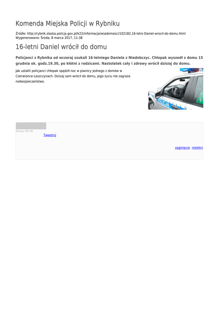 Komenda Miejska Policji w Rybniku Źródło: http://rybnik.slaska.policja.gov.pl/k22/informacje/wiadomosci/102182,16-letni-Daniel-wrocil-do-domu.html Wygenerowano: Środa, 8 marca 2017, 11:38 16-letni Daniel wrócił do domu Policjanci z Rybnika od wczoraj szukali 16-letniego Daniela z Niedobczyc. Chłopak wyszedł z domu 15 grudnia ok. godz.19.30, po kłótni z rodzicami. Nastolatek cały i zdrowy wrócił dzisiaj do domu. Jak ustalili policjanci chłopak spędził noc w piwnicy jednego z domów w Czerwionce-Leszczynach. Dzisiaj sam wrócił do domu, jego życiu nie zagraża niebezpieczeństwo. Ocena: 0/5 (0) Tweetnij zaginięcie, nieletni