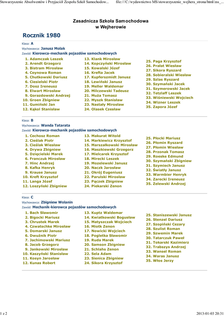 Stowarzyszenie Absolwentów i Przyjaciół Zespołu Szkół Samochodow... 1z2 file:///C:/wydawnictwo MS/stowarzyszenie_wejhera_strona/html/zss_... Zasadnicza Szkoła Samochodowa w Wejherowie Rocznik 1980 Klasa: A Janusz Molak Kierowca-mechanik pojazdów samochodowych Wychowawca: Zawód: 1. 2. 3. 4. 5. 6. 7. 8. 9. 10. 11. 12. Klasa: Adamczak Leszek Arendt Grzegorz Bistram Mirosław Ceynowa Roman Chutkowski Dariusz Ciesielski Piotr Dosz Ireneusz Elwart Mirosław Gorazdowski Andrzej Groen Zbigniew Gumiński Jan Kąkol Stanisław 13. 14. 15. 16. 17. 18. 19. 20. 21. 22. 23. 24. Klank Mirosław Kopczyński Mirosław Kowalski Józef Krefta Jacek Kupferszmidt Janusz Lewiński Janusz Meller Waldemar Milczewski Tadeusz Muża Tomasz Myszk Stanisław Nastały Mirosław Olasek Czesław 25. 26. 27. 28. 29. 30. 31. 32. 33. 34. 35. Paga Krzysztof Prałat Wiesław Sikora Ryszard Sobieralski Wiesław Szlas Ryszard Szymański Jacek Szymerowski Jacek Tetzlaff Leszek Wiśniewski Wojciech Wizner Leszek Zapora Józef 25. 26. 27. 28. 29. 30. 31. 32. 33. 34. 35. Płocki Mariusz Płomin Ryszard Płomin Wiesław Przonak Tomasz Roeske Edmund Szymański Zbigniew Szymiech Janusz Światły Janusz Warmbier Henryk Zarecki Ireneusz Zelewski Andrzej 25. 26. 27. 28. 29. 30. 31. 32. 33. 34. 35. Staniszewski Janusz Stenzel Dariusz Szopiński Cezary Szulist Roman Szwemin Marek Tatarczuk Paweł Tokarski Kazimierz Trabszys Andrzej Wansel Roman Waras Janusz Włos Jerzy B Wanda Tatarata Kierowca-mechanik pojazdów samochodowych Wychowawca: Zawód: 1. 2. 3. 4. 5. 6. 7. 8. 9. 10. 11. 12. Klasa: Cechosz Roman Cieślak Piotr Cieślak Wiesław Drywa Zbigniew Dzięcielski Marek Franczuk Mirosław Hinc Andrzej Kafka Henryk Krause Janusz Kreft Krzysztof Langa Józef Loszyński Zbigniew 13. 14. 15. 16. 17. 18. 19. 20. 21. 22. 23. 24. Makurat Witold Markiewicz Krzysztof Marszałkowski Mirosław Maszkiewski Grzegorz Mielcarek Krzysztof Mirecki Leszek Mozelewski Janusz Naczk Jarosław Okrój Eugeniusz Parulski Mirosław Pączek Zbigniew Piekarski Zenon C Zbigniew Wolanin Mechanik-kierowca pojazdów samochodowych Wychowawca: Zawód: 1. 2. 3. 4. 5. 6. 7. 8. 9. 10. 11. 12. Bach Sławomir Bigocki Mariusz Chrustek Marek Czwatschke Mirosław Domarski Janusz Dwuźnik Piotr Jachimowski Mariusz Jacob Grzegorz Jankowski Mirosław Kaszyński Stanisław Kosyn Jarosław Kunas Robert 13. 14. 15. 16. 17. 18. 19. 20. 21. 22. 23. 24. Kuptz Waldemar Kwiatkowski Bogusław Matyszczak Wojciech Miotk Zenon Nowicki Wojciech Pogletka Sławomir Ruda Marek Samson Zbigniew Schlahs Zenon Sela Adam Sienica Zbigniew Sikora Krzysztof 2013-01-03 20:31 Stowarzyszenie Absolwentów i Przyjaciół Zespołu Szkół Samochodow... 2z2 Klasa: file:///C:/wydawnictwo MS/stowarzyszenie_wejhera_strona/html/zss_... D Stefan Wentk Mechanik-kierowca pojazdów samochodowych Wychowawca: Zawód: 1. 2. 3. 4. 5. 6. 7. 8. 9. 10. Bojke Marek Bujak Marek Dybowski Stanisław Gaffke Mirosław Gregorczuk Piotr Gruba Andrzej Grzenkowski Piotr Jachimkowski Mirosław Klein Włodzimierz Kożuszek Ryszard 11. 12. 13. 14. 15. 16. 17. 18. 19. Krauza Józef Królik Marek Kuczera Tomasz Lesnau Krzysztof Marczyński Marek Musiał Marek Myszk Stefan Nikodemczyk Wojciech Oczk Ryszard 20. 21. 22. 23. 24. 25. 26. 27. 28. Płotek Brunon Pranczk Wojciech Ruszewski Zbigniew Sajdak Leszek Szulc Ryszard Taube Wacław Trybull Tomasz Tyszer Andrzej Uzdrowski Przemysław Wybierz inny rocznik ukończenia ¦ 1952 ¦ 1953 ¦ 1954 ¦ 1955 ¦ 1956 ¦ 1957 ¦ 1970 ¦ 1971 ¦ 1972 ¦ 1973 ¦ 1974 ¦ 1975 ¦ 1976 ¦ 1977 ¦ ¦ 1978 ¦ 1979 ¦ 1980 ¦ 1981 ¦ 1982 ¦ 1983 ¦ 1984 ¦ 1985 ¦ 1986 ¦ 1987 ¦ 1988 ¦ 1989 ¦ 1990 ¦ 1991 ¦ ¦ 1992 ¦ 1993 ¦ 1994 ¦ 1995 ¦ 1996 ¦ 1997 ¦ 1998 ¦ 1999 ¦ 2000 ¦ 2001 ¦ 2002 ¦ 2003 ¦ Stowarzyszenie Absolwentów i Przyjaciół Zespołu Szkół Samochodowych i Ponadgimnazjalnych nr 4 im. Jakuba Wejhera w Wejherowie, ul. Sobieskiego 344, tel. 58-672-24-15, e-mail: [email protected] www.stowarzyszenie-wejhera.pl; Copyright by www.szablonszkolny.d4u.pl Wszystkie prawa zastrzeżone. © 2011 Stowarzyszenie Wejhera, Maciej Skok 2013-01-03 20:31