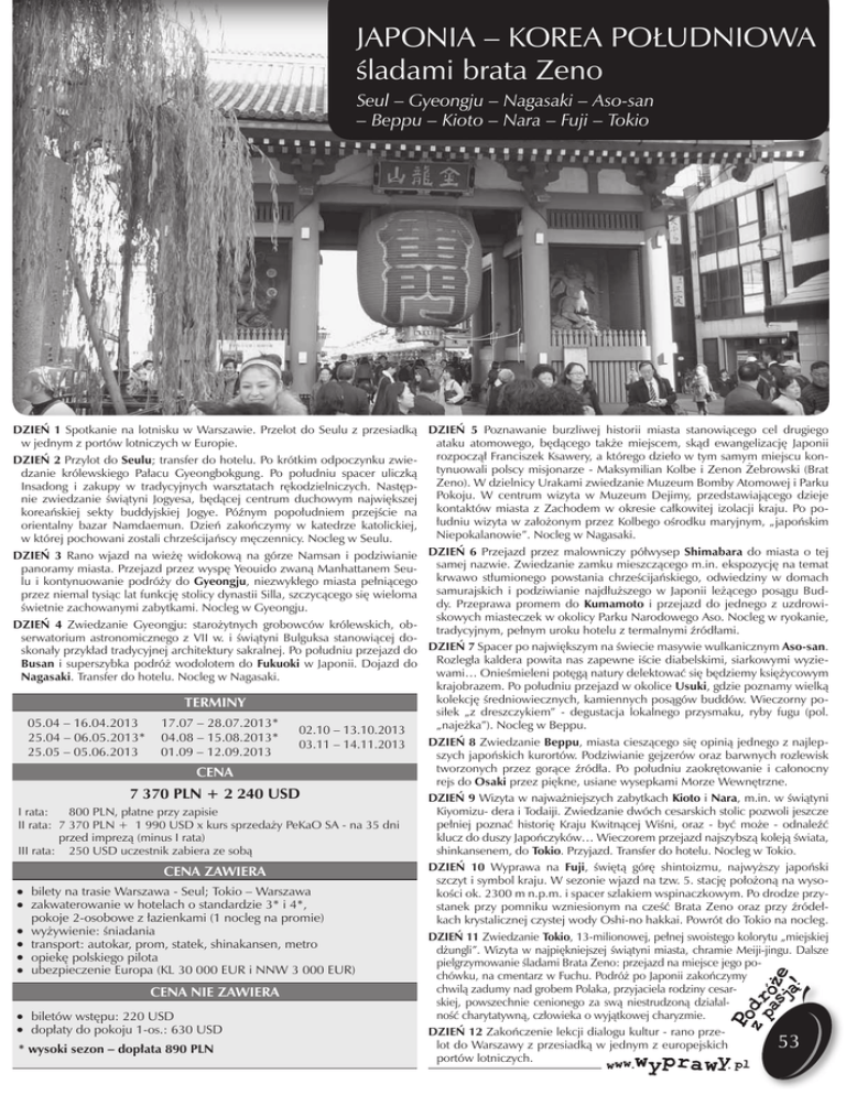 JAPONIA – KOREA POŁUDNIOWA śladami brata Zeno Seul – Gyeongju – Nagasaki – Aso-san – Beppu – Kioto – Nara – Fuji – Tokio DZIEŃ 1 Spotkanie na lotnisku w Warszawie. Przelot do Seulu z przesiadką DZIEŃ 5 Poznawanie burzliwej historii miasta stanowiącego cel drugiego ataku atomowego, będącego także miejscem, skąd ewangelizację Japonii w jednym z portów lotniczych w Europie. rozpoczął Franciszek Ksawery, a którego dzieło w tym samym miejscu konDZIEŃ 2 Przylot do Seulu; transfer do hotelu. Po krótkim odpoczynku zwietynuowali polscy misjonarze - Maksymilian Kolbe i Zenon Żebrowski (Brat dzanie królewskiego Pałacu Gyeongbokgung. Po południu spacer uliczką Zeno). W dzielnicy Urakami zwiedzanie Muzeum Bomby Atomowej i Parku Insadong i zakupy w tradycyjnych warsztatach rękodzielniczych. NastępPokoju. W centrum wizyta w Muzeum Dejimy, przedstawiającego dzieje nie zwiedzanie świątyni Jogyesa, będącej centrum duchowym największej kontaktów miasta z Zachodem w okresie całkowitej izolacji kraju. Po pokoreańskiej sekty buddyjskiej Jogye. Późnym popołudniem przejście na łudniu wizyta w założonym przez Kolbego ośrodku maryjnym, „japońskim orientalny bazar Namdaemun. Dzień zakończymy w katedrze katolickiej, Niepokalanowie”. Nocleg w Nagasaki. w której pochowani zostali chrześcijańscy męczennicy. Nocleg w Seulu. DZIEŃ 3 Rano wjazd na wieżę widokową na górze Namsan i podziwianie DZIEŃ 6 Przejazd przez malowniczy półwysep Shimabara do miasta o tej samej nazwie. Zwiedzanie zamku mieszczącego m.in. ekspozycję na temat panoramy miasta. Przejazd przez wyspę Yeouido zwaną Manhattanem Seukrwawo stłumionego powstania chrześcijańskiego, odwiedziny w domach lu i kontynuowanie podróży do Gyeongju, niezwykłego miasta pełniącego samurajskich i podziwianie najdłuższego w Japonii leżącego posągu Budprzez niemal tysiąc lat funkcję stolicy dynastii Silla, szczycącego się wieloma dy. Przeprawa promem do Kumamoto i przejazd do jednego z uzdrowiświetnie zachowanymi zabytkami. Nocleg w Gyeongju. skowych miasteczek w okolicy Parku Narodowego Aso. Nocleg w ryokanie, DZIEŃ 4 Zwiedzanie Gyeongju: starożytnych grobowców królewskich, obtradycyjnym, pełnym uroku hotelu z termalnymi źródłami. serwatorium astronomicznego z VII w. i świątyni Bulguksa stanowiącej doDZIEŃ 7 Spacer po największym na świecie masywie wulkanicznym Aso-san. skonały przykład tradycyjnej architektury sakralnej. Po południu przejazd do Rozległa kaldera powita nas zapewne iście diabelskimi, siarkowymi wyzieBusan i superszybka podróż wodolotem do Fukuoki w Japonii. Dojazd do wami… Onieśmieleni potęgą natury delektować się będziemy księżycowym Nagasaki. Transfer do hotelu. Nocleg w Nagasaki. krajobrazem. Po południu przejazd w okolice Usuki, gdzie poznamy wielką kolekcję średniowiecznych, kamiennych posągów buddów. Wieczorny poTERMINY siłek „z dreszczykiem” - degustacja lokalnego przysmaku, ryby fugu (pol. 05.04 – 16.04.2013 17.07 – 28.07.2013* „najeżka”). Nocleg w Beppu. 02.10 – 13.10.2013 25.04 – 06.05.2013* 25.05 – 05.06.2013 04.08 – 15.08.2013* 01.09 – 12.09.2013 03.11 – 14.11.2013 CENA 7 370 PLN + 2 240 USD I rata: 800 PLN, płatne przy zapisie II rata: 7 370 PLN + 1 990 USD x kurs sprzedaży PeKaO SA - na 35 dni przed imprezą (minus I rata) III rata: 250 USD uczestnik zabiera ze sobą CENA ZAWIERA · · · · · · bilety na trasie Warszawa - Seul; Tokio – Warszawa zakwaterowanie w hotelach o standardzie 3* i 4*, pokoje 2-osobowe z łazienkami (1 nocleg na promie) wyżywienie: śniadania transport: autokar, prom, statek, shinakansen, metro opiekę polskiego pilota ubezpieczenie Europa (KL 30 000 EUR i NNW 3 000 EUR) CENA NIE ZAWIERA · biletów wstępu: 220 USD · dopłaty do pokoju 1-os.: 630 USD * wysoki sezon – dopłata 890 PLN DZIEŃ 8 Zwiedzanie Beppu, miasta cieszącego się opinią jednego z najlepszych japońskich kurortów. Podziwianie gejzerów oraz barwnych rozlewisk tworzonych przez gorące źródła. Po południu zaokrętowanie i całonocny rejs do Osaki przez piękne, usiane wysepkami Morze Wewnętrzne. DZIEŃ 9 Wizyta w najważniejszych zabytkach Kioto i Nara, m.in. w świątyni Kiyomizu- dera i Todaiji. Zwiedzanie dwóch cesarskich stolic pozwoli jeszcze pełniej poznać historię Kraju Kwitnącej Wiśni, oraz - być może - odnaleźć klucz do duszy Japończyków… Wieczorem przejazd najszybszą koleją świata, shinkansenem, do Tokio. Przyjazd. Transfer do hotelu. Nocleg w Tokio. DZIEŃ 10 Wyprawa na Fuji, świętą górę shintoizmu, najwyższy japoński szczyt i symbol kraju. W sezonie wjazd na tzw. 5. stację położoną na wysokości ok. 2300 m n.p.m. i spacer szlakiem wspinaczkowym. Po drodze przystanek przy pomniku wzniesionym na cześć Brata Zeno oraz przy źródełkach krystalicznej czystej wody Oshi-no hakkai. Powrót do Tokio na nocleg. DZIEŃ 11 Zwiedzanie Tokio, 13-milionowej, pełnej swoistego kolorytu „miejskiej dżungli”. Wizyta w najpiękniejszej świątyni miasta, chramie Meiji-jingu. Dalsze pielgrzymowanie śladami Brata Zeno: przejazd na miejsce jego pochówku, na cmentarz w Fuchu. Podróż po Japonii zakończymy chwilą zadumy nad grobem Polaka, przyjaciela rodziny cesarskiej, powszechnie cenionego za swą niestrudzoną działalność charytatywną, człowieka o wyjątkowej charyzmie. DZIEŃ 12 Zakończenie lekcji dialogu kultur - rano przelot do Warszawy z przesiadką w jednym z europejskich portów lotniczych. 53