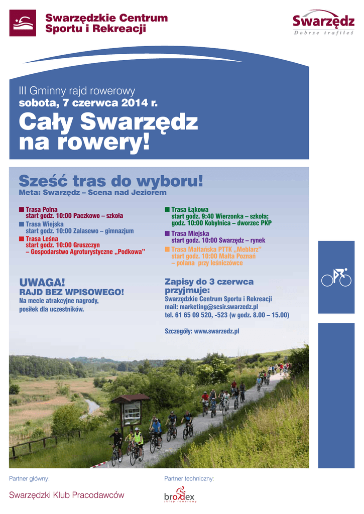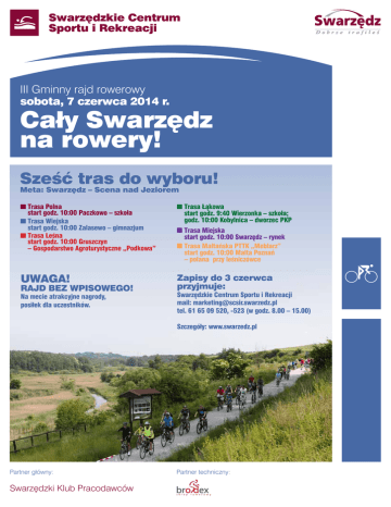 III Gminny rajd rowerowy sobota, 7 czerwca 2014 r. Cały Swarzędz na rowery! Sześć tras do wyboru! Meta: Swarzędz – Scena nad Jeziorem Trasa Polna start godz. 10:00 Paczkowo – szkoła Trasa Wiejska start godz. 10:00 Zalasewo – gimnazjum Trasa Leśna start godz. 10:00 Gruszczyn – Gospodarstwo Agroturystyczne „Podkowa” Trasa Łąkowa start godz. 9:40 Wierzonka – szkoła; godz. 10:00 Kobylnica – dworzec PKP Trasa Miejska start godz. 10:00 Swarzędz – rynek Trasa Maltańska PTTK „Meblarz” start godz. 10:00 Malta Poznań – polana przy leśniczówce UWAGA! Zapisy do 3 czerwca przyjmuje: RAJD BEZ WPISOWEGO! Na mecie atrakcyjne nagrody, posiłek dla uczestników. Swarzędzkie Centrum Sportu i Rekreacji mail: [email protected] tel. 61 65 09 520, -523 (w godz. 8.00 – 15.00) Szczegóły: www.swarzedz.pl Partner główny: Swarzędzki Klub Pracodawców Partner techniczny: