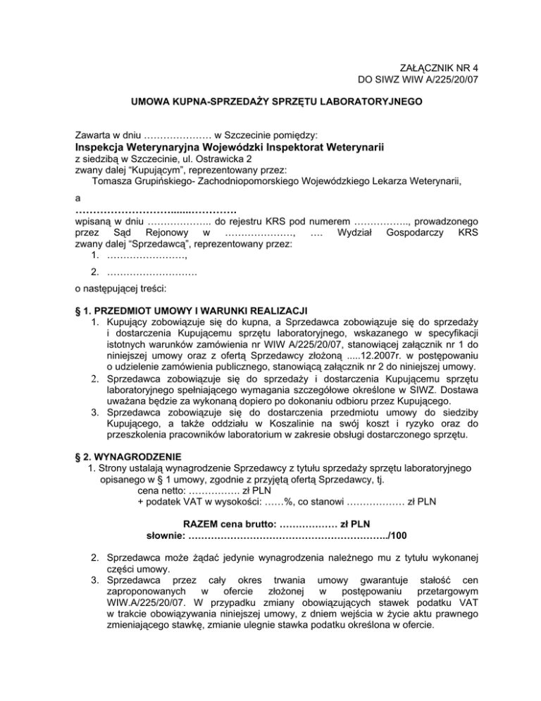 ZAŁĄCZNIK NR 4 DO SIWZ WIW A/225/20/07 UMOWA KUPNA-SPRZEDAŻY SPRZĘTU LABORATORYJNEGO Zawarta w dniu ………………… w Szczecinie pomiędzy: Inspekcja Weterynaryjna Wojewódzki Inspektorat Weterynarii z siedzibą w Szczecinie, ul. Ostrawicka 2 zwany dalej “Kupującym”, reprezentowany przez: Tomasza Grupińskiego- Zachodniopomorskiego Wojewódzkiego Lekarza Weterynarii, a ……………………….......…………. wpisaną w dniu ……………….. do rejestru KRS pod numerem …………….., prowadzonego przez Sąd Rejonowy w …………………, …. Wydział Gospodarczy KRS zwany dalej “Sprzedawcą”, reprezentowany przez: 1. ……………………, 2. ………………………. o następującej treści: § 1. PRZEDMIOT UMOWY I WARUNKI REALIZACJI 1. Kupujący zobowiązuje się do kupna, a Sprzedawca zobowiązuje się do sprzedaży i dostarczenia Kupującemu sprzętu laboratoryjnego, wskazanego w specyfikacji istotnych warunków zamówienia nr WIW A/225/20/07, stanowiącej załącznik nr 1 do niniejszej umowy oraz z ofertą Sprzedawcy złożoną .....12.2007r. w postępowaniu o udzielenie zamówienia publicznego, stanowiącą załącznik nr 2 do niniejszej umowy. 2. Sprzedawca zobowiązuje się do sprzedaży i dostarczenia Kupującemu sprzętu laboratoryjnego spełniającego wymagania szczegółowe określone w SIWZ. Dostawa uważana będzie za wykonaną dopiero po dokonaniu odbioru przez Kupującego. 3. Sprzedawca zobowiązuje się do dostarczenia przedmiotu umowy do siedziby Kupującego, a także oddziału w Koszalinie na swój koszt i ryzyko oraz do przeszkolenia pracowników laboratorium w zakresie obsługi dostarczonego sprzętu. § 2. WYNAGRODZENIE 1. Strony ustalają wynagrodzenie Sprzedawcy z tytułu sprzedaży sprzętu laboratoryjnego opisanego w § 1 umowy, zgodnie z przyjętą ofertą Sprzedawcy, tj. cena netto: ……………. zł PLN + podatek VAT w wysokości: ……%, co stanowi ……………… zł PLN RAZEM cena brutto: ……………… zł PLN słownie: ……………………………………………………../100 2. Sprzedawca może żądać jedynie wynagrodzenia należnego mu z tytułu wykonanej części umowy. 3. Sprzedawca przez cały okres trwania umowy gwarantuje stałość cen zaproponowanych w ofercie złożonej w postępowaniu przetargowym WIW.A/225/20/07. W przypadku zmiany obowiązujących stawek podatku VAT w trakcie obowiązywania niniejszej umowy, z dniem wejścia w życie aktu prawnego zmieniającego stawkę, zmianie ulegnie stawka podatku określona w ofercie. 4. Strony ustalają, że rozliczenie za sprzedaż przedmiotu umowy nastąpi, na podstawie faktur VAT, za każdą odebraną przez Kupującego ilość sprzętu laboratoryjnego. 5. Podstawą do wystawienia faktur będą dokumenty odbioru zamówionego sprzętu laboratoryjnego, potwierdzone przez uprawnionych pracowników Kupującego. 6. Kupujący wyraża zgodę, aby Sprzedawca wystawiał faktury VAT bez podpisu Zamawiającego na fakturze, na warunkach określonych w niniejszej umowie. Należność wynikająca z wystawionej faktury, zostanie przelana na konto Sprzedawcy, nr ………………………………………… w terminie 21 dni od daty dostarczenia faktury. § 3. JAKOŚĆ, GWARANCJA I RĘKOJMIA 1. Sprzedawca oświadcza, że jakość przedmiotu zamówienia dostarczanego przez Sprzedawcę jest zgodna z wymaganiami obowiązujących norm oraz opisaną w specyfikacji i ofercie charakterystyką. 2. Sprzedawca zapewnia, iż przedmiot zamówienia jest fabrycznie nowy, o jakości odpowiadającej SIWZ, nieuszkodzony, oraz iż nie posiada wad ukrytych. 3. Sprzedawca udziela ………….. m-cy gwarancji na przedmiot sprzedaży. (Okresy gwarancji wynikają ze złożonej przez Sprzedawcę oferty, stanowiącej załącznik nr 2 do niniejszej umowy.) 4. Okres gwarancji rozpoczyna bieg od daty odbioru sprzętu laboratoryjnego przez Kupującego, z uwzględnieniem treści § 1 ust. 2 niniejszej umowy. 5. Jeżeli w okresie gwarancji ujawnią się wady przedmiotu zamówienia, Sprzedawca zobowiązany jest do jego nieodpłatnej naprawy lub wymiany na wolny od wad, w terminie 3 dni od daty złożenia reklamacji. Czas reakcji na zgłoszenie awarii nie może być dłuższy niż 24 godziny. Reklamacja powinna być zgłoszona w formie pisemnej, faxem lub pocztą elektroniczną. Czas reakcji jest liczony dopiero od momentu otrzymania przez Sprzedawcę zgłoszenia telefonicznego, e-mail, faksem. W przypadku koniecznych dłuższych napraw (ponad 3 dni), Sprzedawca musi dostarczyć na czas naprawy sprzęt zastępczy, umożliwiający użytkownikowi kontynuację prowadzonych przez niego prac. 6. Sprzedawca zobowiązany jest do odebrania od Kupującego wadliwego przedmiotu umowy i dostarczenia naprawionego lub wolnego od wad w terminie, o którym mowa w ust. 5, na swój koszt i ryzyko. 7. W związku z ustalonym w ust. 3 okresem gwarancji, okres rękojmi przedłuża się o 3 miesiące ponad okres gwarancji. 8. Sprzedawca zapewnia serwis pogwarancyjny lub wskaże jednostkę uprawnioną do wykonywania napraw pogwarancyjnych zakupionego sprzętu. § 4. OKRES OBOWIĄZYWANIA 1. W razie wystąpienia istotnej zmiany okoliczności powodującej, że wykonanie umowy nie leży w interesie publicznym, czego nie można było przewidzieć w chwili zawarcia umowy, Kupujący może odstąpić od umowy w terminie 30 dni od powzięcia wiadomości o powyższych okolicznościach (art. 145 ustawy prawo zamówień publicznych). 2. W takim wypadku Sprzedawca może żądać jedynie wynagrodzenia należnego mu z tytułu wykonanej części umowy. 3. Odstąpienie od umowy powinno nastąpić w formie pisemnej pod rygorem nieważności takiego oświadczenia i powinno zawierać uzasadnienie. 4. Umowa obowiązuje od dnia jej podpisania. 5. Kupującemu przysługuje prawo odstąpienia od umowy w przypadku, gdy Sprzedawca nie wywiązuje się ze zobowiązań niniejszej umowy, a w szczególności dostarcza Kupującemu prz