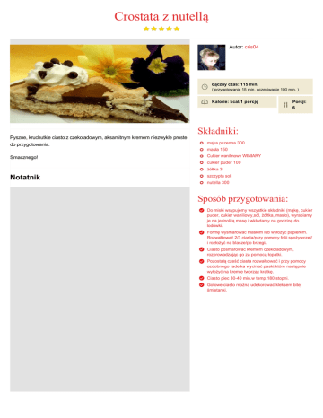 Crostata z nutellą Autor: cris04 Łączny czas: 115 min. ( przygotowanie 15 min. oczekiwanie 100 min. ) Kalorie: kcal/1 porcję Pyszne, kruchutkie ciasto z czekoladowym, aksamitnym kremem niezwykle proste do przygotowania. Porcji: 6 Składniki: mąka pszenna 300 masła 150 Smacznego! Cukier wanilinowy WINIARY cukier puder 100 żółtka 3 Notatnik szczypta soli nutella 300 Sposób przygotowania: Do miski wsypujemy wszystkie składniki (mąkę, cukier puder, cukier waniliowy,sól, żółtka, masło), wyrabiamy je na jednolitą masę i wkładamy na godzinę do lodówki. Formę wysmarować masłem lub wyłożyć papierem. Rozwałkować 2/3 ciasta/przy pomocy folii spożywczej/ i rozłożyć na blasze/po brzegi/. Ciasto posmarować kremem czekoladowym, rozprowadzając go za pomocą łopatki. Pozostałą cześć ciasta rozwałkować i przy pomocy ozdobnego radełka wycinać paski,które następnie wyłożyć na kremie tworząc kratkę. Ciasto piec 3040 min.w temp.180 stopni. Gotowe ciasto można udekorować kleksem bitej śmietanki.