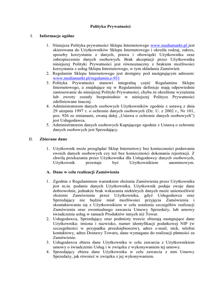 Polityka Prywatności I. Informacje ogólne 1. Niniejsza