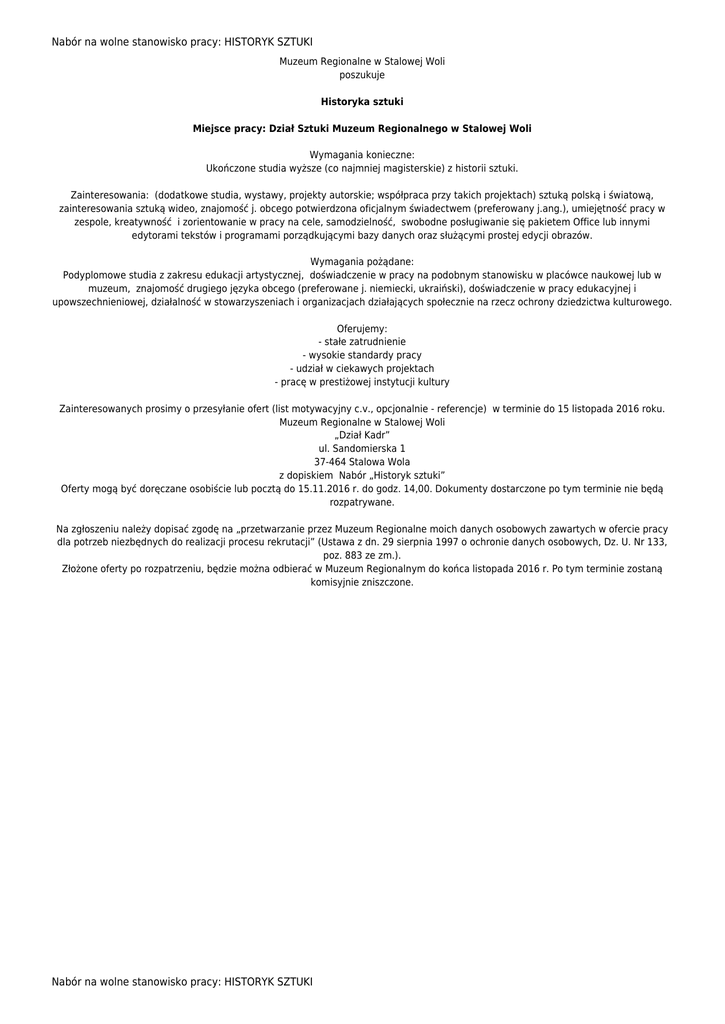 Nabór na wolne stanowisko pracy: HISTORYK SZTUKI Muzeum Regionalne w Stalowej Woli poszukuje Historyka sztuki Miejsce pracy: Dział Sztuki Muzeum Regionalnego w Stalowej Woli Wymagania konieczne: Ukończone studia wyższe (co najmniej magisterskie) z historii sztuki. Zainteresowania: (dodatkowe studia, wystawy, projekty autorskie; współpraca przy takich projektach) sztuką polską i światową, zainteresowania sztuką wideo, znajomość j. obcego potwierdzona oficjalnym świadectwem (preferowany j.ang.), umiejętność pracy w zespole, kreatywność i zorientowanie w pracy na cele, samodzielność, swobodne posługiwanie się pakietem Office lub innymi edytorami tekstów i programami porządkującymi bazy danych oraz służącymi prostej edycji obrazów. Wymagania pożądane: Podyplomowe studia z zakresu edukacji artystycznej, doświadczenie w pracy na podobnym stanowisku w placówce naukowej lub w muzeum, znajomość drugiego języka obcego (preferowane j. niemiecki, ukraiński), doświadczenie w pracy edukacyjnej i upowszechnieniowej, działalność w stowarzyszeniach i organizacjach działających społecznie na rzecz ochrony dziedzictwa kulturowego. Oferujemy: - stałe zatrudnienie - wysokie standardy pracy - udział w ciekawych projektach - pracę w prestiżowej instytucji kultury Zainteresowanych prosimy o przesyłanie ofert (list motywacyjny c.v., opcjonalnie - referencje) w terminie do 15 listopada 2016 roku. Muzeum Regionalne w Stalowej Woli „Dział Kadr” ul. Sandomierska 1 37-464 Stalowa Wola z dopiskiem Nabór „Historyk sztuki” Oferty mogą być doręczane osobiście lub pocztą do 15.11.2016 r. do godz. 14,00. Dokumenty dostarczone po tym terminie nie będą rozpatrywane. Na zgłoszeniu należy dopisać zgodę na „przetwarzanie przez Muzeum Regionalne moich danych osobowych zawartych w ofercie pracy dla potrzeb niezbędnych do realizacji procesu rekrutacji” (Ustawa z dn. 29 sierpnia 1997 o ochronie danych osobowych, Dz. U. Nr 133, poz. 883 ze zm.). Złożone oferty po rozpatrzeniu, będzie można odbierać w Muzeum Regionalnym do końca listopada 2016 r. Po tym terminie zostaną komisyjnie zniszczone. Nabór na wolne stanowisko pracy: HISTORYK SZTUKI