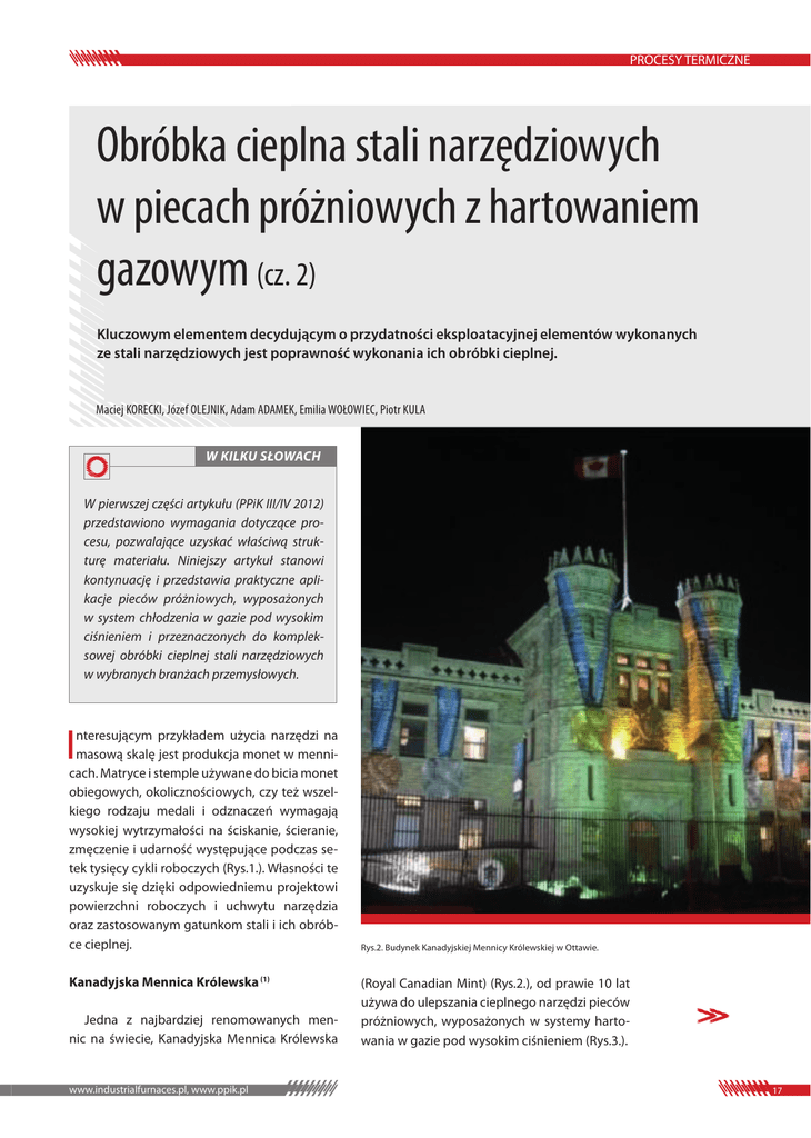 PROCESY TERMICZNE Obróbka cieplna stali narzędziowych w piecach próżniowych z hartowaniem gazowym (cz. 2) Kluczowym elementem decydującym o przydatności eksploatacyjnej elementów wykonanych ze stali narzędziowych jest poprawność wykonania ich obróbki cieplnej. Maciej KORECKI, Józef OLEJNIK, Adam ADAMEK, Emilia WOŁOWIEC, Piotr KULA W KILKU SŁOWACH W pierwszej części artykułu (PPiK III/IV 2012) przedstawiono wymagania dotyczące procesu, pozwalające uzyskać właściwą strukturę materiału. Niniejszy artykuł stanowi kontynuację i przedstawia praktyczne aplikacje pieców próżniowych, wyposażonych w system chłodzenia w gazie pod wysokim ciśnieniem i przeznaczonych do kompleksowej obróbki cieplnej stali narzędziowych w wybranych branżach przemysłowych. I nteresującym przykładem użycia narzędzi na masową skalę jest produkcja monet w mennicach. Matryce i stemple używane do bicia monet obiegowych, okolicznościowych, czy też wszelkiego rodzaju medali i odznaczeń wymagają wysokiej wytrzymałości na ściskanie, ścieranie, zmęczenie i udarność występujące podczas setek tysięcy cykli roboczych (Rys.1.). Własności te uzyskuje się dzięki odpowiedniemu projektowi powierzchni roboczych i uchwytu narzędzia oraz zastosowanym gatunkom stali i ich obróbce cieplnej. Kanadyjska Mennica Królewska (1) Jedna z najbardziej renomowanych mennic na świecie, Kanadyjska Mennica Królewska www.industrialfurnaces.pl, www.ppik.pl Rys.2. Budynek Kanadyjskiej Mennicy Królewskiej w Ottawie. (Royal Canadian Mint) (Rys.2.), od prawie 10 lat używa do ulepszania cieplnego narzędzi pieców próżniowych, wyposażonych w systemy hartowania w gazie pod wysokim ciśnieniem (Rys.3.). 17 PROCESY TERMICZNE Rys.1. Matryca do bicia monet. Podstawowymi gatunkami stali stosowanymi na narzędzia są niskostopowe stale narzędziowe do pracy na zimno, tradycyjnie przyporządkowane do hartowania w oleju O1 (1.2510), O1M i O2 (1.2842, NMV). Dotychczasowe hartowanie narzędzi menniczych w oleju nie przynosiło najlepszych rezultatów, ze względu na deformacje, zabrudzenie powierzchni po obróbce cieplnej i związanych z tym trudności w usunięciu warstwy utlenionej i odwęglonej z grawury narzędzi. Aby uwolnić się od tych niedogodności, opracowano i wdrożono technologię hartowania tychże stali w gazie - azocie pod ciśnieniem 10-15 bar. Zastosowano dookolny system napływu gazu chłodzącego na wsad, doskonale sprawdzający się dla detali o spójnych gabarytach, gęsto upakowanych we wsadzie, pozwalający uzyskać wymaganą twardość i równomierność hartowania. Rys.3. Piec próżniowy do ulepszania cieplnego matryc i stempli, Seco/Warwick typ 15.0VPT-4025/24HV. 18 Równocześnie stosowane są również stale wyżej-stopowe jak D2 (1.2379), A2 (1.2363), szybkotnące gatunku M2 (1.3341, SW7M), M4 oraz inne z większą zawartością Cr, Ni i Mo, które hartują się w gazie zdecydowanie łatwiej. Cały proces ulepszania cieplnego odbywa się w piecu jednokomorowym, w jednym cyklu technologicznym (bez przemieszczania wsadu pomiędzy urządzeniami), złożonym z nagrzewu do austenityzacji, hartowania w azocie pod wysokim ciśnieniem oraz odpuszczania. Po obróbce cieplnej, uzyskuje się narzędzia o odpowiedniej twardości i własnościach mechanicznych oraz, co jest równie ważne, o idealnej (lustrzanej) powierzchni bez odwęglenia i utlenienia która może być kształtowana ostatecznie lub pokrywana powłokami (PVD, galwanicznymi) zwiększającymi żywotność narzędzi (Rys.4.). Rys.4. Matryce mennicze umieszczone w koszu, po obróbce cieplnej. Podczas procesu termicznego powierzchnia narzędzi jest narażona na odwęglenie lub utlenienie skutkujące obniżeniem twardości, dyskwalifikujące jakość narzędzi. Dzieje się tak za przyczyną cząsteczek tlenu i pary wodnej, które zaabsorbowane z powietrza lub z zanieczyszczeń wsadu, kondensują się wewnątrz pieca a następnie wydzielają w trakcie procesu i atakują powierzchnię detali w wysokich temperaturach. Z tego powodu, przed rozpoczęciem grzania do austenityzacji, piec wraz ze wsadem musi być odpompowany do wysokiej próżni rzędu 10-4–10-5 mbar, co skutecznie usuwa zanieczyszczenia tlenopochodne i chroni powierzchnię elementów. Z kolei wysoka próżnia nie jest wskazana w temperaturach austenityzacji, gdyż ułatwia sublimację dodatków stopowych z powierzchni stali (Mn, Cr, Co, itp). Zmniejszenie stężenia dodatków stopowych obniża hartowność stali i może być przyczyną niekorzystnego obniżenia twardości przy powierzchni. Dlatego piece przemysłowe & kotły VII-VIII/2012 PROCESY TERMICZNE w wyższych temperaturach ogranicza się poziom próżni do ciśnienia w zakresie 10-1-100 mbar. Uwzględniając powyższe wymagania procesu, optymalnym urządzeniem do jego realizacji, jest piec próżniowy wyposażony w: wysokowydajny system chłodzenia w azocie pod ciśnieniem 15 bar, system pompowy wysokiej próżni na bazie pompy dyfuzyjnej oraz system ciśnienia cząstkowego do kontroli wielkości próżni przy pomocy dozowania azotu. Aesculap Chifa Sp. z o.o. (2) Stale narzędziowe znajdują liczne zastosowania w przemyśle spożywczym i medycznym. Narzędzia tam stosowane muszą posiadać odpowiednie własności mechaniczne oraz odporność chemiczną, w tym odporność na korozję. Do tego celu stosuje się martenzytyczne stale nierdzewne. Krajowa firma Aesculap Chifa Sp. z o.o. z Nowego Tomyśla (wielkopolskie) jest nie tylko potentatem krajowym w produkcji narzędzi chirurgicznych, ale również liderem w grupie B. Braun i eksporterem na cały świat swoich wyrobów. Oferuje narzędzia z gamy ponad 6000 wzorów, stosowane do chirurgii ogólnej, mikrochirurgii, w ginekologii, chirurgii kostnej, stomatologicznej i w ortodoncji. Produkowane są również narzędzia weterynaryjne. Firma posiada wewnętrzną hartownię, która całkowicie obsługuje produkcję w zakresie obróbki cieplnej, ale równie