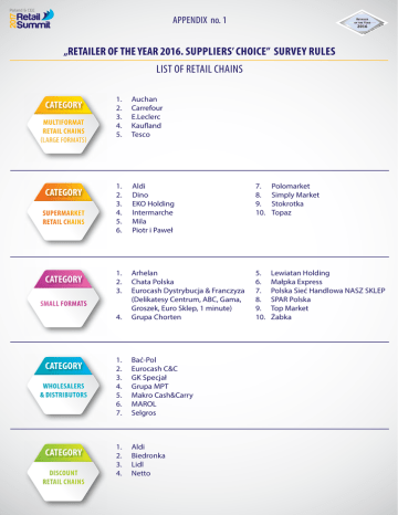 APPENDIX no. 1 „RETAILER OF THE YEAR 2016. SUPPLIERS’ CHOICE” SURVEY RULES LIST OF RETAIL CHAINS CATEGORY MULTIFORMAT RETAIL CHAINS (LARGE FORMATS) CATEGORY SUPERMARKET RETAIL CHAINS CATEGORY SMALL FORMATS CATEGORY WHOLESALERS & DISTRIBUTORS CATEGORY DISCOUNT RETAIL CHAINS 1. 2. 3. 4. 5. Auchan Carrefour E.Leclerc Kaufland Tesco 1. 2. 3. 4. 5. 6. Aldi Dino EKO Holding Intermarche Mila Piotr i Paweł 1.Arhelan 2. Chata Polska 3. Eurocash Dystrybucja & Franczyza (Delikatesy Centrum, ABC, Gama, Groszek, Euro Sklep, 1 minute) 4. Grupa Chorten 1.Bać-Pol 2. Eurocash C&C 3. GK Specjał 4. Grupa MPT 5. Makro Cash&Carry 6.MAROL 7.Selgros 1.Aldi 2.Biedronka 3.Lidl 4.Netto 7.Polomarket 8. Simply Market 9.Stokrotka 10.Topaz 5. Lewiatan Holding 6. Małpka Express 7. Polska Sieć Handlowa NASZ SKLEP 8. SPAR Polska 9. Top Market 10.Żabka