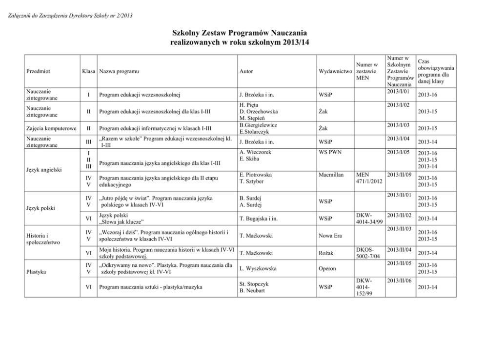 Załącznik do Zarządzenia Dyrektora Szkoły nr 2/2013 Szkolny Zestaw Programów Nauczania realizowanych w roku szkolnym 2013/14 Przedmiot Klasa Nazwa programu Nauczanie zintegrowane I Program edukacji wczesnoszkolnej Nauczanie zintegrowane II Program edukacji wczesnoszkolnej dla klas I-III Zajęcia komputerowe II Program edukacji informatycznej w klasach I-III Nauczanie zintegrowane III „Razem w szkole” Program edukacji wczesnoszkolnej kl. I-III Język angielski Język polski Historia i społeczeństwo Plastyka I II III Program nauczania języka angielskiego dla klas I-III Autor Numer w Wydawnictwo zestawie MEN J. Brzózka i in. WSiP H. Pięta D. Orzechowska M. Stępień B.Giergielewicz E.Stolarczyk Numer w Szkolnym Zestawie Programów Nauczania 2013/I/01 Czas obowiązywania programu dla danej klasy 2013-16 2013/I/02 2013-15 Żak 2013/I/03 Żak J. Brzózka i in. WSiP A. Wieczorek E. Skiba WS PWN E. Piotrowska T. Sztyber Macmillan IV V Program nauczania języka angielskiego dla II etapu edukacyjnego IV V „Jutro pójdę w świat”. Program nauczania języka polskiego w klasach IV-VI B. Surdej A. Surdej WSiP VI Język polski „Słowa jak klucze” T. Bugajska i in. WSiP IV V „Wczoraj i dziś”. Program nauczania ogólnego historii i społeczeństwa w klasach IV-VI T. Maćkowski Nowa Era VI Moja historia. Program nauczania historii w klasach IV-VI T. Maćkowski szkoły podstawowej. Rożak IV V „Odkrywamy na nowo”. Plastyka. Program nauczania dla szkoły podstawowej kl. IV-VI L. Wyszkowska Operon VI Program nauczania sztuki - plastyka/muzyka St. Stopczyk B. Neubart WSiP 2013/I/04 2013/I/05 MEN 2013/II/09 471/1/2012 2013/II/01 DKW2013/II/02 4014-34/99 2013/II/03 DKOS5002-7/04 2013/II/04 2013/II/05 DKW4014152/99 2013-15 2013-14 2013-16 2013-15 2013-14 2013-16 2013-15 2013-16 2013-15 2013-14 2013-16 2013-15 2013-14 2013-16 2013-15 2013/II/06 2013-14 Załącznik do Zarządzenia Dyrektora Szkoły nr 2/2013 Muzyka Język niemiecki 2013/II/07 Program nauczania ogólnego muzyki w klasach IV-VI M. Gromek G. Kilbach Nowa Era VI Program nauczania przedmiotu blokowego sztuka, plastyka i muzyka M. Tomaszewska K. Turowska-Zakrzewicz Rożak VI Program nauczania języka niemieckiego dla klas I-VI S. Rapacka WSz PWN IV V Mirosław Dąbrowski i inni WSiP VI Matematyka 2001. Szkoła podstawowa klasy IV-VI Mirosław Dąbrowski i inni WSiP IV V Przyroda. Program nauczania dla szkoły podstawowej w klasach IV-VI „Ciekawi świata” M. Augustowska M. Gajewska Operon VI Przyroda. Program nauczania przyrody uwzględniający ścieżki dydaktyczne L. Hoppe A. Sternicka Operon Zajęcia techniczne IV V Zajęcia techniczne. Program nauczania dla klas IV-VI „Ciekawi świata” I. Kamińska Operon Technika VI Program nauczania techniki z wych. komunikacyjnym IV V IV V VI I II III IV V VI Odkrywamy na nowo. Zajęcia komputerowe. Program nauczania dla szkoły podstawowej kl. IV-VI W. Hermanowski Wychowanie fizyczne. Autorski program nauczania dla II etapu edukacyjnego A. Miela IV V Przyroda Zajęcia komputerowe Wychowanie fizyczne Religia Leszek Bakun 2013-14 2013/II/10 2013-14 ART-SZKOL Operon 2013-16 2013-15 DKOS2013/II/12 5002-01/08 2013/II/13 DKW4014181/99 ks. M. Czaplicki 2013-16 2013-15 2013-14 2013/II/15 DKOS2013/II/16 4041-19/02 2013/II/17 2013/I/06 Komisja Wychowania Katolickiego KEP 2013-14 2013/II/14 2013/II/18 Program nauczania religii rzymskokatolickiej w przedszkolach i szkołach „Jesteśmy dziećmi Bożymi” Program nauczania religii rzymskokatolickiej w przedszkolach i szkołach „Poznaję Boga i w Niego wierzę” 2013/II/08 2013/II/11 Matematyka 2001. Program nauczania dla szkoły podstawowej kl. IV-VI Matematyka DKW401448/99 2013-16 2013-15 2013/II/19 2013-16 2013-15 2013-14 2013-16 2013-15 2013-16 2013-15 2013-14 2013-16 2013-15 2013-14 2013-16 2013-15 2013-14