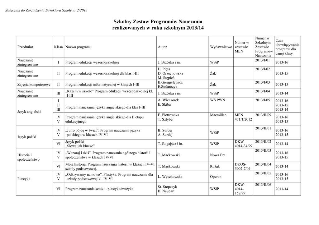 Szkolny zestaw programów nauczania Rok szkolny 2013/14