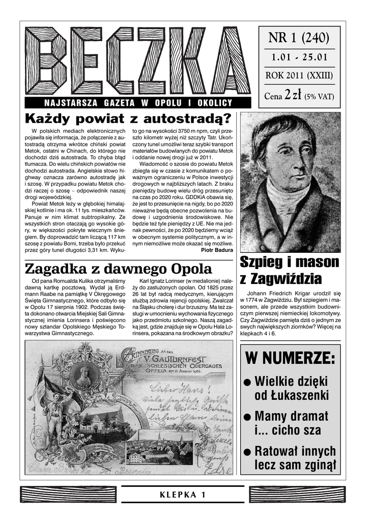 NR 1 (240) 1.01 - 25.01 ROK 2011 (XXIII) Cena N A J S TA R S Z A G A Z E TA W O P O L U I O K O L I C Y 2z∏ (5% VAT) Ka˝dy powiat z autostradà? W polskich mediach elektronicznych pojawi∏a si´ informacja, ˝e po∏àczenie z autostradà otrzyma wkrótce chiƒski powiat Metok, ostatni w Chinach, do którego nie dochodzi dziÊ autostrada. To chyba b∏àd t∏umacza. Do wielu chiƒskich powiatów nie dochodzi autostrada. Angielskie s∏owo highway oznacza zarówno autostrad´ jak i szos´. W przypadku powiatu Metok chodzi raczej o szos´ – odpowiednik naszej drogi wojewódzkiej. Powiat Metok le˝y w g∏´bokiej himalajskiej kotlinie i ma ok. 11 tys. mieszkaƒców. Panuje w nim klimat subtropikalny. Ze wszystkich stron otaczajà go wysokie góry, w wi´kszoÊci pokryte wiecznym Êniegiem. By doprowadziç tam liczàcà 117 km szos´ z powiatu Bomi, trzeba by∏o przekuç przez góry tunel d∏ugoÊci 3,31 km. Wyku- to go na wysokoÊci 3750 m npm, czyli przesz∏o kilometr wy˝ej ni˝ szczyty Tatr. Ukoƒczony tunel umo˝liwi teraz szybki transport materia∏ów budowlanych do powiatu Metok i oddanie nowej drogi ju˝ w 2011. WiadomoÊç o szosie do powiatu Metok zbieg∏a si´ w czasie z komunikatem o powa˝nym ograniczeniu w Polsce inwestycji drogowych w najbli˝szych latach. Z braku pieni´dzy budow´ wielu dróg przesuni´to na czas po 2020 roku. GDDKiA obawia si´, ˝e jest to przesuni´cie na nigdy, bo po 2020 niewa˝ne b´dà obecne pozwolenia na budow´ i uzgodnienia Êrodowiskowe. Nie b´dzie te˝ tyle pieni´dzy z UE. Nie ma jednak pewnoÊci, ˝e po 2020 b´dziemy wcià˝ w obecnym systemie politycznym, a w innym niemo˝liwe mo˝e okazaç si´ mo˝liwe. Piotr Badura Zagadka z dawnego Opola Od pana Romualda Kulika otrzymaliÊmy dawnà kartk´ pocztowà. Wyda∏ jà Erdmann Raabe na pamiàtk´ V Okr´gowego Âwi´ta Gimnastycznego, które odby∏o si´ w Opolu 17 sierpnia 1902. Podczas Êwi´ta dokonano otwarcia Miejskiej Sali Gimnastycznej imienia Lorinsera i poÊwi´cono nowy sztandar Opolskiego M´skiego Towarzystwa Gimnastycznego. Karl Ignatz Lorinser (w medalionie) nale˝y do zas∏u˝onych opolan. Od 1825 przez 26 lat by∏ radcà medycznym, kierujàcym s∏u˝bà zdrowia rejencji opolskiej. Zwalcza∏ na Âlàsku choler´ i dur brzuszny. Ma te˝ zas∏ugi w umocnieniu wychowania fizycznego jako przedmiotu szkolnego. Naszà zagadkà jest, gdzie znajduje si´ w Opolu Hala Lorinsera, pokazana na Êrodkowym obrazku? Szpieg i mason z Zagwiêdzia Johann Friedrich Krigar urodzi∏ si´ w 1774 w Zagwiêdziu. By∏ szpiegiem i masonem, ale przede wszystkim budowniczym pierwszej niemieckiej lokomotywy. Czy Zagwiêdzie pami´ta dziÊ o jednym ze swych najwi´kszych ziomków? Wi´cej na klepkach 4 i 6. W NUMERZE: KLEPKA 1 ● Wielkie dzi´ki od ¸ukaszenki ● Mamy dramat i... cicho sza ● Ratowa∏ innych lecz sam zginà∏ FA K T Y ● Przez osiem lat (1 stycznia 2003 – 31 grudnia 2010) Prezydentem Brazylii by∏ lewicowy polityk Luiz Inacio Lula da Silva (w skrócie Lula). Jednym z jego g∏ównych celów by∏a poprawa warunków ˝ycia najubo˝szych. Program „zero g∏odu” pozwoli∏ wydobyç z n´dzy 20 mln obywateli. Prezydent Lula uwa˝a∏, ˝e wy˝szy poziom ˝ycia najubo˝szych zaowocuje wzrostem gospodarczym. Tak si´ sta∏o. Brazylia do∏àczy∏a do najwi´kszych gospodarek Êwiata (9 miejsce w 2009) a poziom bezrobocia w grudniu 2010 by∏ najni˝szy w dziejach tego kraju. ● Coraz wi´kszym problemem USA staje si´ rosnàca liczba obywateli, których nie staç na kupowanie ˝ywnoÊci w wystarczajàcej iloÊci. Jednym z g∏ównych tego powodów jest wysokie bezrobocie. Osoby niedo˝ywione dostajà z opieki spo∏ecznej specjalne kartki (food stamps), za które mogà otrzymaç w sklepach ˝ywnoÊç. Obecnie kartki otrzymuje 43 mln obywateli USA, co stanowi 14 proc. ca∏ej ludnoÊci. Minister rolnictwa USA, Kevin Concannon powiedzia∏, ˝e tylu niedo˝ywionych nie by∏o w USA od 1990 (wczeÊniej nie robiono obliczeƒ). ● Poczta Polska planuje likwidacj´ znacznej cz´Êci urz´dów pocztowych. Po zrealizowaniu planu w gminach wiejskich nie b´dzie nawet jednego urz´du na gmin´. Te urz´dy, które przetrwajà, b´dà cz´sto obs∏ugiwaç po dwie gminy. W miejsce zlikwidowanych urz´dów powstaç majà agencje pocztowe, np. w sklepach czy na stacjach paliw. W ciàgu kilku lat ma si´ te˝ zmniejszyç zatrudnienie z 92 tys. do 84 tys. pracowników. ● Radiem, którego Opolanie s∏uchajà najch´tniej, jest Radio ZET, na które w okresie wrzesieƒ-listopad 2010 przypada∏o 19,46 proc. s∏uchaczy. Na drugim miejscu by∏o Polskie Radio Opole z 17,69 proc. s∏uchaczy. Jednak rok wczeÊniej Radio ZET mia∏o 23,39 proc., czyli traci s∏uchaczy, a Polskie Radio Opole mia∏o 15,67 proc., czyli zyskuje s∏uchaczy. Na trzecim miejscu jest Program 3 Polskiego Radia, który rok temu czwarty, a na czwartym Radio RMF FM – rok temu trzecie (MillwardBrown SMG/KRC). Wielkie dzi´ki od ¸ukaszenki „To, co ostatnio Polska zrobi∏a dla Bia∏orusi, warte jest ka˝dych pieni´dzy” – stwierdzi∏ Aleksandr ¸ukaszenka po wygranych przez niego bia∏oruskich wyborach prezydenckich – poinformowa∏y polskie media. Co tak wielkiego zrobi∏a Polska dla Bia∏orusi? Zdaniem Michnika ludzie tacy jak ¸ukaszenka sà k∏amliwi, tchórzliwi, a zarazem butni. Tekst Michnika naje˝ony jest „masakrowaniem, nawet zabijaniem”, „niezwyk∏à brutalnoÊcià i okrucieƒstwem”, „chamskà demonstracjà przemocy policyjnej”, „pa∏owaniem, katowaniem” etc. Bia∏oruÊ ma pi´ciu sàsiadów, w tym trzech z UE (Polska, Litwa i ¸otwa). Z tych pi´ciu sàsiadów tylko Polska (MSZ) wyda∏a po bia∏oruskich wyborach oÊwiadczenie, w którym pad∏o s∏owo „pot´piamy”. Polski minister spraw zagranicznych jest jedynym na Êwiecie, który publicznie stwierdzi∏, ˝e Aleksandr ¸ukaszenka nie zdoby∏ wi´kszoÊci g∏osów, a zatem nie wygra∏ wyborów. Ws