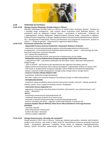 14:00 14:05-14:20 14:20-15:25 15:25-15:45 POWITANIE NA FESTIWALU Występ artystów Miejskiego Ośrodka Kultury w Olkuszu Wokaliści Miejskiego Ośrodka Kultury w Olkuszu to młodzi ludzie, kochający śpiewać. Kształcą się i rozwijają swoje umiejętności pod czujnym okiem instruktora Pana Wiesława Barana. Na przestrzeni wielu lat zdobywali czołowe miejsca i wyróżnienia w konkursach lokalnych jak i ogólnopolskich (Talenty Małopolski, Międzynarodowy Festiwal Kolęd i Pastorałek w Będzinu, Festiwal Piosenki Angielskiej w Brzegu, Międzynarodowy Festiwal Piosenki Młodzieżowej w Kielcach itd. ). Występowali w krakowskiej Piwnicy pod Baranami oraz programach muzycznych „Szansie na sukces”, i „Droga do gwiazd”. Uczestniczyli w nagraniach Radia Kraków. Prezentacja wystawców i ich stoisk: - Wojewódzki Fundusz Ochrony Środowiska i Gospodarki Wodnej w Krakowie - informacja na temat pożyczkowego programu priorytetowego poprawa efektywności energetycznej – termomodernizacja budynków jednorodzinnych- „Jawor” – skierowanego do osób fizycznych (częściowo umarzane pożyczki) - gry i zabawy dla najmłodszych - prezentacja domku dla pszczół; żywe pszczoły w bezpiecznym ulu (za szybą). - Małopolskie Centrum Budownictwa Energooszczędnego Politechniki Krakowskiej - „Laboratorium OZE”, czyli pokazy edukacyjne dla dorosłych i dzieci, dotyczące Odnawialnych Źródeł Energii - „OZE na wesoło”, czyli konkursy dla najmłodszych (do wygrania miniroboty solarne) - zdjęcia kamerą termowizyjną, które pokażą najcieplejsze i najzimniejsze miejsca na naszym ciele - informacje nt. budownictwa energooszczędnego i oferty MCBE dla mieszkańców Małopolski - pokazy z użyciem modeli edukacyjnych: energia wody; energia wiatru; energia słońca. - Centrum Transferu Wiedzy Miękinia AGH - prezentacja systemów energii odnawialnej - BUS OZE – pokaz mini instalacji służących do produkcji energii ze źródeł odnawialnych - WSTĄŻKĄ MALOWANE - możliwość zakupu produktów własnoręcznie tworzonych metodą „kanzashi”: opasek, gumek do włosów, spinek, chust, czapek (ze wstążek, dzianin i dodatków). - Uzdrowisko Krynica-Żegiestów S.A. - degustacja i prezentacja naturalnej wody mineralnej „Kryniczanka” oraz wód leczniczych „Jan”, „Zuber”, „Słotwinka”. -3D FLY - prezentacja nowoczesnych technologii druku 3D - możliwość obserwacji drukarki 3D w trakcie pracy - warsztaty rysowania trójwymiarowego za pomocą specjalnego pisaka - konkurs rysunkowy dla dzieci – nagroda: model wydrukowany na drukarce 3D -Centrum Języków Obcych IMPULS/ Helen Doron Olkusz/Akademia Twórczego Rozwoju BYSTRZAK - warsztaty robotyki - pokaz doświadczeń chemicznych - konkurs dla dzieci i dorosłych - zabawy w języku angielskim Występ Stowarzyszenia „Wszystko dla wszystkich” Zespół powstał w 2012 roku w Olkuszu. Tworzy go młodzież gimnazjalna, młodzież szkół średnich, studenci oraz seniorzy, czyli osoby w wieku 16-81 lat. Kierownictwo muzyczne sprawuje Franciszek Dudek – kompozytor, gitarzysta i wokalista. Grupa stawia na integrację międzypokoleniową. Podczas swoich koncertów wykorzystuje różne instrumenty muzyczne, m.in. gitarę basową i akustyczną, harmonijkę ustną, pianino czy akordeon. 15:45-16:40 Prezentacja wystawców i ich stoisk: - Rynek Pracy - informacje na temat Funduszy Europejskich przeznaczonych na rozwój zawodowy i społeczny mieszkańców Małopolski - promocja projektów w ramach Regionalnego Programu Operacyjnego Województwa Małopolskiego oraz Programu Wiedza Edukacja Rozwój (przedstawiciele PUP) - informacje na temat realizowanych w Małopolsce inicjatyw dla osób młodych (eksperci WUP Kraków) - możliwość zrobienia „Bilansu Kariery”, który pozwoli na podsumowanie swojego dorobku zawodowego: doświadczenia, wykształcenia, odbytych kursów, szkoleń i innych umiejętności, w żaden sposób nieudokumentowanych - mobilne studio fotograficzne – możliwość wykonania zdjęć do CV - konkurs rysunkowy dla dzieci - ProBiznes – Prezentacja projektu Bo jak nie my to kto? - Oferty pracy dla bezrobotnych kobiet - Centrum Wsparcia „Kolping” – informacja o projektach realizowanych w celu poprawy sytuacji na małopolskim rynku pracy - Złote rączki – masażyści z dysfunkcją wzroku - konsultacje z dyplomowanymi masażystami w zakresie profilaktyki i leczenia z wykorzystaniem masażu oraz jego wpływu na organizm człowieka - możliwość skorzystania z masażu leczniczego - EMU - biżuteria - sprzedaż oryginalnej biżuterii wykonywanej z ręcznie tworzonej ceramiki, kamieni, malowanego drewna - HEN-HAFT Pracownia Strojów Ludowych i Stylizowanych Henryka Poniewierska - warsztaty z haftowania ręcznego, ozdabianie cekinami i koralikami - możliwość zakupu wyrobów firmy - Projektowanie 3D dzięki funduszom Unii Europejskiej dla Składzie Budowlanym Grafit Olkusz - pokaz tworzenia projektów i wizualizacji łazienek 3D - prezentacja nowoczesnych materiałów budowlanych i wykończeniowych, - konkurs dla odwiedzających – nagroda: bezpłatna wizualizacja łazienki 3D oraz wysokiej jakości farba niezbędna przy remoncie 16:40-17:10 Występ zespołu PAZZ To zespół młodych i zdolnych muzyków z Oświęcimia. Grają covery znanych utworów we własnych aranżacjach. Zespół tworzą: Emilia Łanoszka (wokal), Kamil Płonka (pianino, perkusja, cajon, aranżacje), Marcin Majcherek (bas, pianino, gitara akustyczna, flet, cajon i kontrabas) oraz Wojciech Kościelniak (perkusja). Start konkursu „Małopolska Myśli Kreatywnie” Zadaniem uczestników jest zbudowanie z tekturowych klocków kreatywnej konstrukcji przedstawiającej innowacyjne obiekty przyszłości: architektoniczne, techniczne lub motoryzacyjne, które mogłyby powstać w Małopolsce dzięki dostępnym środkom unijnym. Do wygrania m.in.: rower, hulajnoga, deskorolka. Prezentacja wystawców i ich stoisk: - Urząd Miasta i Gmi