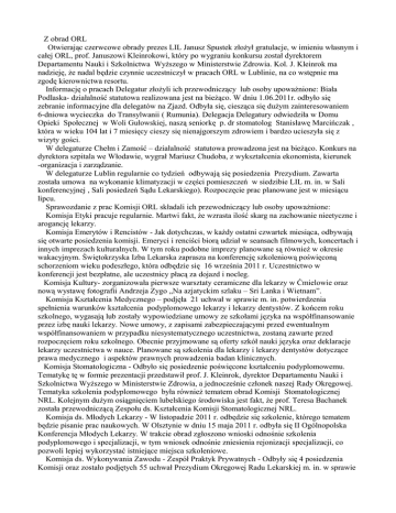 Z obrad ORL Otwierając czerwcowe obrady prezes LIL Janusz Spustek złożył gratulacje, w imieniu własnym i całej ORL, prof. Januszowi Kleinrokowi, który po wygraniu konkursu został dyrektorem Departamentu Nauki i Szkolnictwa Wyższego w Ministerstwie Zdrowia. Kol. J. Kleinrok ma nadzieję, że nadal będzie czynnie uczestniczył w pracach ORL w Lublinie, na co wstępnie ma zgodę kierownictwa resortu. Informację o pracach Delegatur złożyli ich przewodniczący lub osoby upoważnione: Biała Podlaska- działalność statutowa realizowana jest na bieżąco. W dniu 1.06.2011r. odbyło się zebranie informacyjne dla delegatów na Zjazd. Odbyła się, ciesząca się dużym zainteresowaniem 6-dniowa wycieczka do Transylwanii ( Rumunia). Delegacja Delegatury odwiedziła w Domu Opieki Społecznej w Woli Gułowskiej, naszą seniorkę p. dr stomatolog Stanisławę Marcińczak , która w wieku 104 lat i 7 miesięcy cieszy się nienajgorszym zdrowiem i bardzo ucieszyła się z wizyty gości. W delegaturze Chełm i Zamość – działalność statutowa prowadzona jest na bieżąco. Konkurs na dyrektora szpitala we Włodawie, wygrał Mariusz Chudoba, z wykształcenia ekonomista, kierunek -organizacja i zarządzanie. W delegaturze Lublin regularnie co tydzień odbywają się posiedzenia Prezydium. Zawarta została umowa na wykonanie klimatyzacji w części pomieszczeń w siedzibie LIL m. in. w Sali konferencyjnej , Sali posiedzeń Sądu Lekarskiego). Rozpoczęcie prac planowane jest w miesiącu lipcu. Sprawozdanie z prac Komisji ORL składali ich przewodniczący lub osoby upoważnione: Komisja Etyki pracuje regularnie. Martwi fakt, że wzrasta ilość skarg na zachowanie nieetyczne i arogancję lekarzy. Komisja Emerytów i Rencistów - Jak dotychczas, w każdy ostatni czwartek miesiąca, odbywają się otwarte posiedzenia komisji. Emeryci i renciści biorą udział w seansach filmowych, koncertach i innych imprezach kulturalnych. W tym roku podobne imprezy planowane są również w okresie wakacyjnym. Świętokrzyska Izba Lekarska zaprasza na konferencję szkoleniową poświęconą schorzeniom wieku podeszłego, która odbędzie się 16 września 2011 r. Uczestnictwo w konferencji jest bezpłatne, ale uczestnicy płacą za dojazd i nocleg. Komisja Kultury- zorganizowała pierwsze warsztaty ceramiczne dla lekarzy w Ćmielowie oraz nową wystawę fotografii Andrzeja Zygo „Na azjatyckim szlaku – Sri Lanka i Wietnam”. Komisja Kształcenia Medycznego – podjęła 21 uchwał w sprawie m. in. potwierdzenia spełnienia warunków kształcenia podyplomowego lekarzy i lekarzy dentystów. Z końcem roku szkolnego, wygasają lub zostały wypowiedziane umowy ze szkołami języka na współfinansowanie przez izbę nauki lekarzy. Nowe umowy, z zapisami zabezpieczającymi przed ewentualnym współfinansowaniem w przypadku niesystematycznego uczestnictwa, zostaną zawarte przed rozpoczęciem roku szkolnego. Obecnie przyjmowane są oferty szkół nauki języka oraz deklaracje lekarzy uczestnictwa w nauce. Planowane są szkolenia dla lekarzy i lekarzy dentystów dotyczące prawa medycznego i aspektów prawnych prowadzenia badan klinicznych. Komisja Stomatologiczna - Odbyło się posiedzenie poświęcone kształceniu podyplomowemu. Tematykę tę w formie prezentacji przedstawił prof. J. Kleinrok, dyrektor Departamentu Nauki i Szkolnictwa Wyższego w Ministerstwie Zdrowia, a jednocześnie członek naszej Rady Okręgowej. Tematyka szkolenia podyplomowego była również tematem obrad Komisji Stomatologicznej NRL. Kolejnym dużym osiągnięciem lubelskiego środowiska jest fakt, że prof. Teresa Bachanek została przewodniczącą Zespołu ds. Kształcenia Komisji Stomatologicznej NRL. Komisja ds. Młodych Lekarzy - W listopadzie 2011 r. odbędzie się szkolenie, którego tematem będzie pisanie prac naukowych. W Olsztynie w dniu 15 maja 2011 r. odbyła się II Ogólnopolska Konferencja Młodych Lekarzy. W trakcie obrad zgłoszono wnioski odnośnie szkolenia podyplomowego i specjalizacji, w tym wniosek odnośnie zniesienia rejonizacji specjalizacji, co pozwoli lepiej wykorzystać istniejące miejsca szkoleniowe. Komisja ds. Wykonywania Zawodu - Zespół Praktyk Prywatnych - Odbyły się 4 posiedzenia Komisji oraz zostało podjętych 55 uchwał Prezydium Okręgowej Radu Lekarskiej m. in. w sprawie wpisu do rejestru indywidualnych, specjalistycznych, grupowych praktyk lekarskich- 42 oraz skreślenia z rejestru – podjęto 8 uchwał. Powołano 8 zespołów wizytacyjnych do oceny gabinetów lekarskich/dentystycznych. Zespół ds. Rejestru i Prawa wykonywania Zawodu podjął uchwały odnośnie wpisów uzupełniających do prawa wykonywania zawodu: odnośnie specjalizacji, zmiany nazwiska, tytułów naukowych oraz punktów edukacyjnych. Wydano 10 zaświadczeń do pracy w krajach UE. Komisja Socjalno - Bytowa rozpatrywała na bieżąco wnioski o zapomogi bezzwrotne, pożyczki. Komisja Sportu - Odbyły się 2-dniowe zawody kolarskie w Bychawie, na które przyjechało 98 uczestników z całej Polski. Uczestnicy byli zachwyceni organizacją i atmosferą zawodów, mają zamiar przyjechać w przyszłym roku, w jeszcze liczniejszej grupie. W dniu 15 .06 2011r. zostały zorganizowane Mistrzostwa Polski w piłce plażowej. Na wniosek lekarza, który z powodów zdrowotnych miał zawieszone prawo wykonywania zawodu, ORL powołało komisję lekarską, która wyda orzeczenie , czy może on ponownie podjąć pracę w zawodzie lekarza. Okręgowa Rada lekarska przyjęła jednogłośnie projekt regulaminu Funduszu Pomocowego. Jesteśmy pierwszą Izbą Lekarską, która utworzyła Fundusz Pomocowy dla lekarzy znajdujących się w trudnej sytuacji życiowej. Wysokość Funduszu Pomocowego jest ustalana przez Okręgowy Zjazd Lekarzy, a kryteria przyznawania świadczenia – każdego roku, na pierwszym posiedzeniu ORL, po uchwaleniu budżetu. Uprawnionymi do korzystania z Funduszu są osoby, członkowie Lubelskiej Izby Lekarskiej, któr