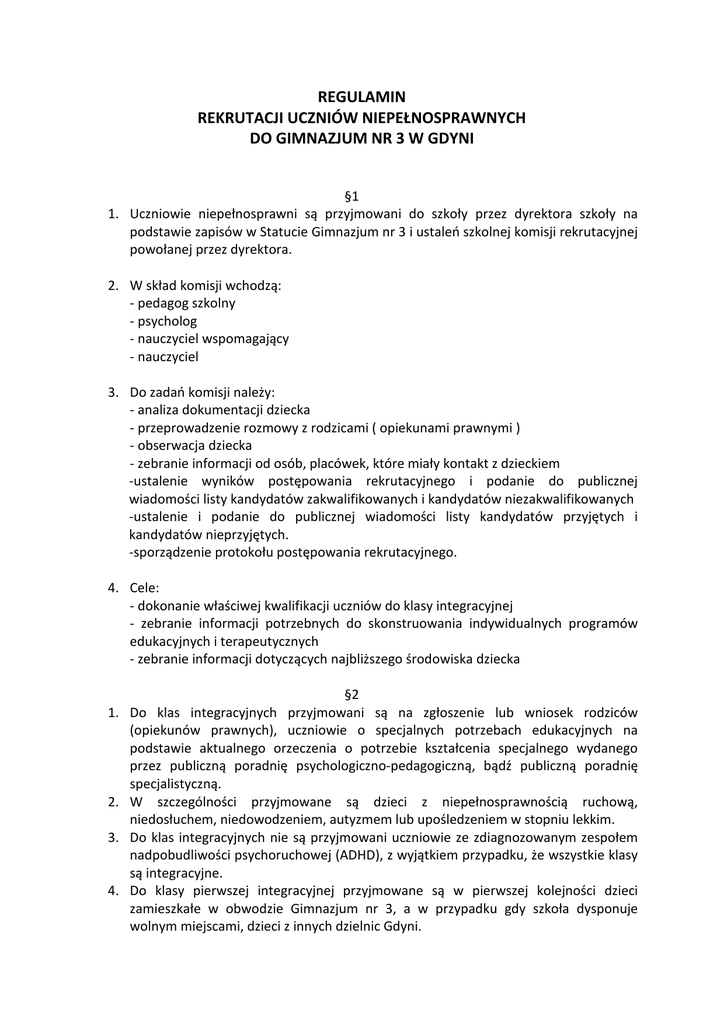 REGULAMIN REKRUTACJI UCZNIÓW NIEPEŁNOSPRAWNYCH DO GIMNAZJUM NR 3 W GDYNI §1 1. Uczniowie niepełnosprawni są przyjmowani do szkoły przez dyrektora szkoły na podstawie zapisów w Statucie Gimnazjum nr 3 i ustaleń szkolnej komisji rekrutacyjnej powołanej przez dyrektora. 2. W skład komisji wchodzą: - pedagog szkolny - psycholog - nauczyciel wspomagający - nauczyciel 3. Do zadań komisji należy: - analiza dokumentacji dziecka - przeprowadzenie rozmowy z rodzicami ( opiekunami prawnymi ) - obserwacja dziecka - zebranie informacji od osób, placówek, które miały kontakt z dzieckiem -ustalenie wyników postępowania rekrutacyjnego i podanie do publicznej wiadomości listy kandydatów zakwalifikowanych i kandydatów niezakwalifikowanych -ustalenie i podanie do publicznej wiadomości listy kandydatów przyjętych i kandydatów nieprzyjętych. -sporządzenie protokołu postępowania rekrutacyjnego. 4. Cele: - dokonanie właściwej kwalifikacji uczniów do klasy integracyjnej - zebranie informacji potrzebnych do skonstruowania indywidualnych programów edukacyjnych i terapeutycznych - zebranie informacji dotyczących najbliższego środowiska dziecka 1. 2. 3. 4. §2 Do klas integracyjnych przyjmowani są na zgłoszenie lub wniosek rodziców (opiekunów prawnych), uczniowie o specjalnych potrzebach edukacyjnych na podstawie aktualnego orzeczenia o potrzebie kształcenia specjalnego wydanego przez publiczną poradnię psychologiczno-pedagogiczną, bądź publiczną poradnię specjalistyczną. W szczególności przyjmowane są dzieci z niepełnosprawnością ruchową, niedosłuchem, niedowodzeniem, autyzmem lub upośledzeniem w stopniu lekkim. Do klas integracyjnych nie są przyjmowani uczniowie ze zdiagnozowanym zespołem nadpobudliwości psychoruchowej (ADHD), z wyjątkiem przypadku, że wszystkie klasy są integracyjne. Do klasy pierwszej integracyjnej przyjmowane są w pierwszej kolejności dzieci zamieszkałe w obwodzie Gimnazjum nr 3, a w przypadku gdy szkoła dysponuje wolnym miejscami, dzieci z innych dzielnic Gdyni. 5. Rodzice (opiekunowie prawni) ubiegający się o przyjęcie dziecka do klasy integracyjnej powinni złożyć w sekretariacie szkoły następujące dokumenty: • Zgłoszenie lub wniosek • Orzeczenie o potrzebie kształcenia specjalnego • Orzeczenie ZUS o niepełnosprawności z dokumentacją lekarską • Ankietę dotyczącą dziecka 6. Komisja po uprzednim zapoznaniu się wyżej podaną dokumentacją ustala termin spotkania z rodzicami (opiekunami prawnymi). 7. Podejmując ostateczną decyzję o przyjęciu dziecka Szkoła kieruje się realnymi możliwościami stworzenia dziecka optymalnych warunków kształcenia w naszej placówce. 8. Klasy integracyjne liczą od 15-20 uczniów, w tym do 5 –rga dzieci z orzeczeniem o kształceniu specjalnym. 9. Terminy składania podań oraz ogłoszenia listy uczniów przyjętych do gimnazjum są takie same dla wszystkich uczniów i podawane corocznie przez Pomorskiego Kuratora Oświaty. §3 Regulamin wchodzi w życie z dniem 01.03.2014r. Traci moc poprzedni regulamin.