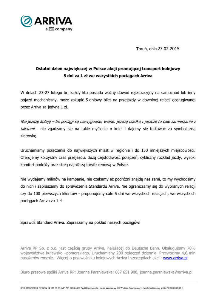 Toruń, dnia 27.02.2015 Ostatni dzień największej w Polsce akcji promującej transport kolejowy 5 dni za 1 zł we wszystkich pociągach Arriva W dniach 23-27 lutego br. każdy kto posiada ważny dowód rejestracyjny na samochód lub inny pojazd mechaniczny, może zakupić 5-dniowy bilet na przejazdy w dowolnej relacji obsługiwanej przez Arriva za jedyne 1 zł. Nie jeżdżę koleją – bo pociągi są niewygodne, wolne, jeżdżą rzadko i jeszcze to całe zamieszanie z biletami - nie zgadzamy się na takie myślenie o kolei i dajemy się testować za symboliczną złotówkę. Uruchamiamy połączenia do największych miast w regionie i do 150 mniejszych miejscowości. Oferujemy korzystny czas przejazdu, dużą częstotliwość połączeń, cykliczny rozkład jazdy, wysoki komfort podróży oraz stałą najniższą taryfę cenową w Polsce. Nie wydajemy milinów na kampanie, nie czekamy aż podróżni znajdą nas sami, to my wychodzimy do nich i zapraszamy do sprawdzenia Standardu Arriva. Nie ograniczamy się do wybranych relacji czy do 100 pierwszych klientów - proponujemy całe 5 dni we wszystkich relacjach, we wszystkich pociągach Arriva za 1 zł. Sprawdź Standard Arriva. Zapraszamy na pokład naszych pociągów! Arriva RP Sp. z o.o. jest częścią grupy Arriva, należącej do Deutsche Bahn. Obsługujemy 70% województwa kujawsko –pomorskiego. Uruchamiany 200 połączeń dziennie. Przewozimy 4,6 mln pasażerów rocznie. Więcej o przewoźniku kolejowych Arriva i szczegółach akcji: www.arriva.pl Biuro prasowe spółki Arriva RP: Joanna Parzniewska: 667 651 900, [email protected] KRS 0000290693, REGON 14 111 25 63, NIP 701 009 24 09, Sąd Rejonowy dla miasta Warszawy XIII Wydział Gospodarczy, Kapitał zakładowy spółki 10 000 000,00 zł
