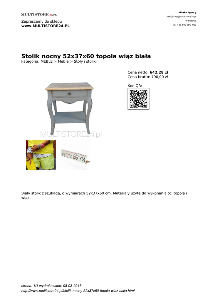 Glinka Agency mail;[email protected] Zapraszamy do sklepu www.MULTISTORE24.PL Warszawa tel. +48 602 395 051 Stolik nocny 52x37x60 topola wiąz biała kategoria: MEBLE > Meble > Stoły i stoliki Cena netto: 642,28 zł Cena brutto: 790,00 zł Kod QR: Biały stolik z szufladą, o wymiarach 52x37x60 cm. Materiały użyte do wykonania to: topola i wiąz. strona: 1/1 wydrukowano: 08-03-2017 http://www.multistore24.pl/stolik-nocny-52x37x60-topola-wiaz-biala.html