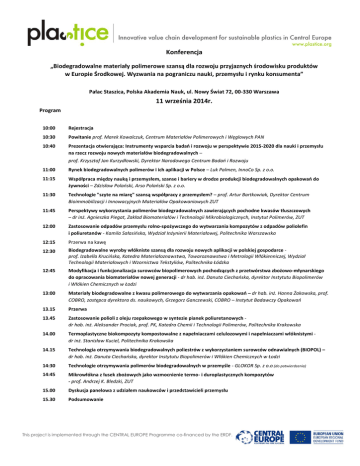 Konferencja „Biodegradowalne materiały polimerowe szansą dla rozwoju przyjaznych środowisku produktów w Europie Środkowej. Wyzwania na pograniczu nauki, przemysłu i rynku konsumenta” Pałac Staszica, Polska Akademia Nauk, ul. Nowy Świat 72, 00-330 Warszawa 11 września 2014r. Program 10:00 Rejestracja 10:30 Powitanie prof. Marek Kowalczuk, Centrum Materiałów Polimerowych i Węglowych PAN 10:40 Prezentacja otwierająca: Instrumenty wsparcia badań i rozwoju w perspektywie 2015-2020 dla nauki i przemysłu na rzecz rozwoju nowych materiałów biodegradowalnych – prof. Krzysztof Jan Kurzydłowski, Dyrektor Narodowego Centrum Badań i Rozwoju 11:00 Rynek biodegradowalnych polimerów i ich aplikacji w Polsce – Luk Palmen, InnoCo Sp. z o.o. 11:15 Współpraca między nauką i przemysłem, szanse i bariery w drodze produkcji biodegradowalnych opakowań do żywności – Zdzisław Polański, Arso Polański Sp. z o.o. 11:30 Technologie "szyte na miarę" szansą współpracy z przemysłem? – prof. Artur Bartkowiak, Dyrektor Centrum Bioimmobilizacji i Innowacyjnych Materiałów Opakowaniowych ZUT 11:45 Perspektywy wykorzystania polimerów biodegradowalnych zawierających pochodne kwasów tłuszczowych – dr inż. Agnieszka Piegat, Zakład Biomateriałów i Technologii Mikrobiologicznych, Instytut Polimerów, ZUT 12:00 Zastosowanie odpadów przemysłu rolno-spożywczego do wytwarzania kompozytów z odpadów poliolefin i poliuretanów - Kamila Sałasińska, Wydział Inżynierii Materiałowej, Politechnika Warszawska 12:15 Przerwa na kawę 12:30 Biodegradowalne wyroby włókniste szansą dla rozwoju nowych aplikacji w polskiej gospodarce prof. Izabella Krucińska, Katedra Materiałoznawstwa, Towaroznawstwa i Metrologii Włókienniczej, Wydział Technologii Materiałowych i Wzornictwa Tekstyliów, Politechnika Łódzka 12:45 Modyfikacja i funkcjonalizacja surowców biopolimerowych pochodzących z przetwórstwa zbożowo-młynarskiego do opracowania biomateriałów nowej generacji - dr hab. inż. Danuta Ciechańska, dyrektor Instytutu Biopolimerów i Włókien Chemicznych w Łodzi 13:00 Materiały biodegradowalne z kwasu polimerowego do wytwarzania opakowań – dr hab. inż. Hanna Żakowska, prof. COBRO, zastępca dyrektora ds. naukowych, Grzegorz Ganczewski, COBRO – Instytut Badawczy Opakowań 13.15 Przerwa 13.45 Zastosowanie polioli z oleju rzepakowego w syntezie pianek poliuretanowych dr hab. inż. Aleksander Prociak, prof. PK, Katedra Chemii i Technologii Polimerów, Politechnika Krakowska 14.00 Termoplastyczne biokompozyty kompostowalne z napełniaczami celulozowymi i napełniaczami włóknistymi dr inż. Stanisław Kuciel, Politechnika Krakowska 14.15 Technologia otrzymywania biodegradowalnych poliestrów z wykorzystaniem surowców odnawialnych (BIOPOL) – dr hab. inż. Danuta Ciechańska, dyrektor Instytutu Biopolimerów i Włókien Chemicznych w Łodzi 14:30 Technologie otrzymywania polimerów biodegradowalnych w przemyśle - GLOKOR Sp. z o.o.(do potwierdzenia) 14:45 Mikrowłókna z łusek zbożowych jako wzmocnienie termo- i duroplastycznych kompozytów - prof. Andrzej K. Bledzki, ZUT 15.00 Dyskusja panelowa z udziałem naukowców i przedstawicieli przemysłu 15.30 Podsumowanie This project is implemented through the CENTRAL EUROPE Programme co-financed by the ERDF.