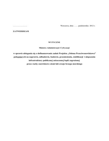 ………………… Warszawa, dnia …… października 2012 r. ZATWIERDZAM WYTYCZNE Ministra Administracji i Cyfryzacji w sprawie ubiegania się o dofinansowanie zadań Projektu „Osłona Przeciwosuwiskowa” polegających na naprawie, odbudowie, budowie, przeniesieniu, stabilizacji i ulepszeniu infrastruktury publicznej zniszczonej bądź zagrożonej przez ruchy osuwiskowe ziemi lub erozje brzegu morskiego Cel Projektu Celem Projektu jest finansowanie lub dofinansowanie zadań z zakresu przeciwdziałania ruchom osuwiskowym ziemi i usuwania ich skutków, na które składają się: przygotowanie, projektowanie, wykonanie oraz nadzór nad pojedynczymi zadaniami stanowiącymi część programu odbudowy, przeniesienia i ochrony obiektów infrastruktury użyteczności publicznej. I. Podmioty zaangażowane w realizację Projektu Jednostka Realizująca Projekt (JR): Departament do spraw Usuwania Skutków Klęsk Żywiołowych w Ministerstwie Administracji i Cyfryzacji. Jednostka Wykonująca/Jednostki Wykonujące (JW): jednostki organizacyjne administracji samorządowej i rządowej oraz inne podmioty sektora finansów publicznych. Jednostki Wspierające Realizację Projektu: podmioty wspierające Jednostkę Realizującą we wdrożeniu Projektu, w szczególności Wojewódzkie Zespoły Nadzorujące Realizację Projektu (WZNRP) powołane przez wojewodów: małopolskiego, podkarpackiego, śląskiego, pomorskiego, świętokrzyskiego, lubelskiego, mazowieckiego, kujawsko-pomorskiego. II. Kwalifikacja zadań W ramach Projektu „Osłona Przeciwosuwiskowa” realizowane będą tylko zadania w dziedzinie naprawy, odbudowy, budowy, przeniesienia, stabilizacji i ulepszenia infrastruktury publicznej zniszczonej bądź zagrożonej wystąpieniem ruchów osuwiskowych ziemi lub erozji brzegu morskiego oraz wykonania systemów (budowli, urządzeń) zaprojektowanych w celu ochrony zagrożonych obszarów przed powtórnym wystąpieniem podobnych zdarzeń katastroficznych. Przeniesienie (budowa) infrastruktury będzie możliwe tylko w przypadkach, gdy stabilizacja osuwiska będzie niemożliwa lub koszty stabilizacji osuwiska będą wyższe od kosztów przeniesienia infrastruktury. Uwaga: 1. Pod uwagę nie będą brane zadania obejmujące szkody i zagrożenia na terenie obszarów niezurbanizowanych dofinansowane z lub pozbawionych Programu infrastruktury priorytetowego technicznej „Przeciwdziałanie oraz osuwiskom zadania ziemi i likwidowanie ich skutków dla środowiska”, prowadzonego przez Narodowy Fundusz Ochrony Środowiska i Gospodarki Wodnej. 2 2. Odbudowa lub przeniesienie zagrożonej infrastruktury dokonana powinna być w sposób eliminujący możliwość ponownego zniszczenia lub uszkodzenia. 3. Wszystkie zadania, które zostaną włączone do Projektu powinny znajdować się w kompetencjach Jednostek Wykonujących. III. Zasady ubiegania się o dofinansowanie stabilizacji, odbudowy, przeniesienia lub remontów obiektów zniszczonych lub uszkodzonych przez osuwiska oraz jego rozliczania 1. Zgłaszanie potrzeb Podstawę prawną do udzielenia pomocy finansowej z rezerwy celowej budżetu państwa z przeznaczeniem na przeciwdziałanie lub usuwanie skutków klęsk żywiołowych (osuwisk) dla JW stanowią: • obowiązująca w danym roku ustawa budżetowa, • ustawa z dnia 27 sierpnia 2009 roku o finansach publicznych (Dz. U. Nr 157, poz. 1240, z późn. zm.), • inne akty prawne określające źródła dochodów jednostek samorządu terytorialnego oraz zasady i tryb udzielania dotacji, w szczególności ustawa z dnia 13 listopada 2003 r. o dochodach jednostek samorządu terytorialnego (Dz. U. z 2010 r. Nr 80, poz. 526, z późn. zm.). Jednostka Wykonująca (JW) ubiegająca się o dofinansowanie powinna sporządzić plan finansowania zadania w podziale na etapy, który ma na celu pomóc w przygotowaniu preliminarza finansowego podziału rezerwy celowej budżetu państwa przez Ministra Administracji i Cyfryzacji (załącznik 1 – wzór planu finansowania zadania). Plan ten powinien być elementem wyjściowym przy ubieganiu się o środki finansowe z budżetu państwa z przeznaczeniem na usuwanie skutków osuwisk. Powyższy plan powinien zostać opracowany przez występującą o dofinansowanie JW na podstawie protokołów szkód (załącznik nr 2 - wzór protokołu szkód). Dopuszcza się dokonanie wyceny potrzeb finansowych na podstawie informacji posiadanych przez daną JW, które nie mają charakteru protokołu. Należy jednak przyjąć, iż wysokość strat lub kosztów naprawy, odbudowy lub budowy powinny zostać ustalone z uwzględnieniem wytycznych zawartych w rozporządzeniu Ministra Infrastruktury z dnia 18 maja 2004 r. w sprawie określenia metod i podstaw sporządzania kosztorysu inwestorskiego, obliczania planowanych kosztów prac projektowych oraz planowanych kosztów robót budowlanych określonych w programie funkcjonalno-użytkowym (Dz. U. Nr 130, poz. 1389), albo innych przepisów wydanych na podstawie art. 33 ust. 3 ustawy z dnia 29 stycznia 2004 r. - Prawo zamówień publicznych (Dz. U. z 2010 r. Nr 113, poz. 759, z późn. zm.). 3 Aplikująca o dofinansowanie JW powinna złożyć do Jednostki Realizującej Projekt (JR) i właściwego Wojewódzkiego Zespołu Nadzorującego Realizację Projektu (WZNRP), poza wymienionymi wyżej dokumentami, również kopię Karty Rejestracyjnej Osuwiska/Karty Rejestracyjnej Terenu Zagrożonego Ruchami Masowymi Ziemi, oddzielnie dla każdego zadania [załącznik do Rozporządzenia Ministra Środowiska z dnia 20 czerwca 2007 r. w sprawie informacji dotyczących ruchów masowych ziemi (Dz. U. Nr 121, poz. 840)]. Zaleca się agregowanie wspólnych wniosków przez JW, które dotyczą danego osuwiska, a stan właścicielski powodowałby złożenie wniosków przez kilka uprawnionych podmiotów. W tym celu, ubiegające się o dofinansowanie JW mogą zawrzeć porozumienie lub inną umowę określającą prawa i obowiązki stron zaangażowanych w realizację zadania